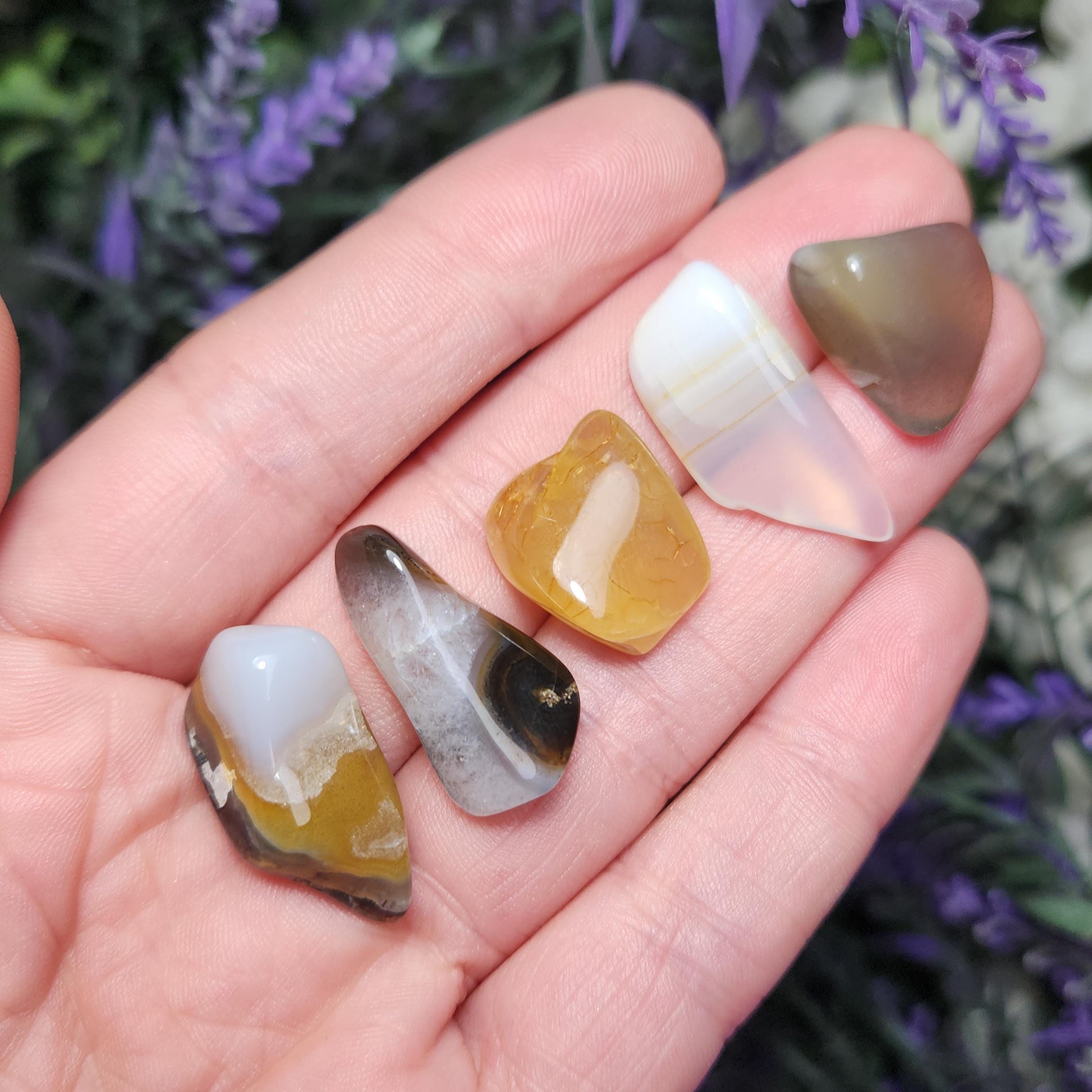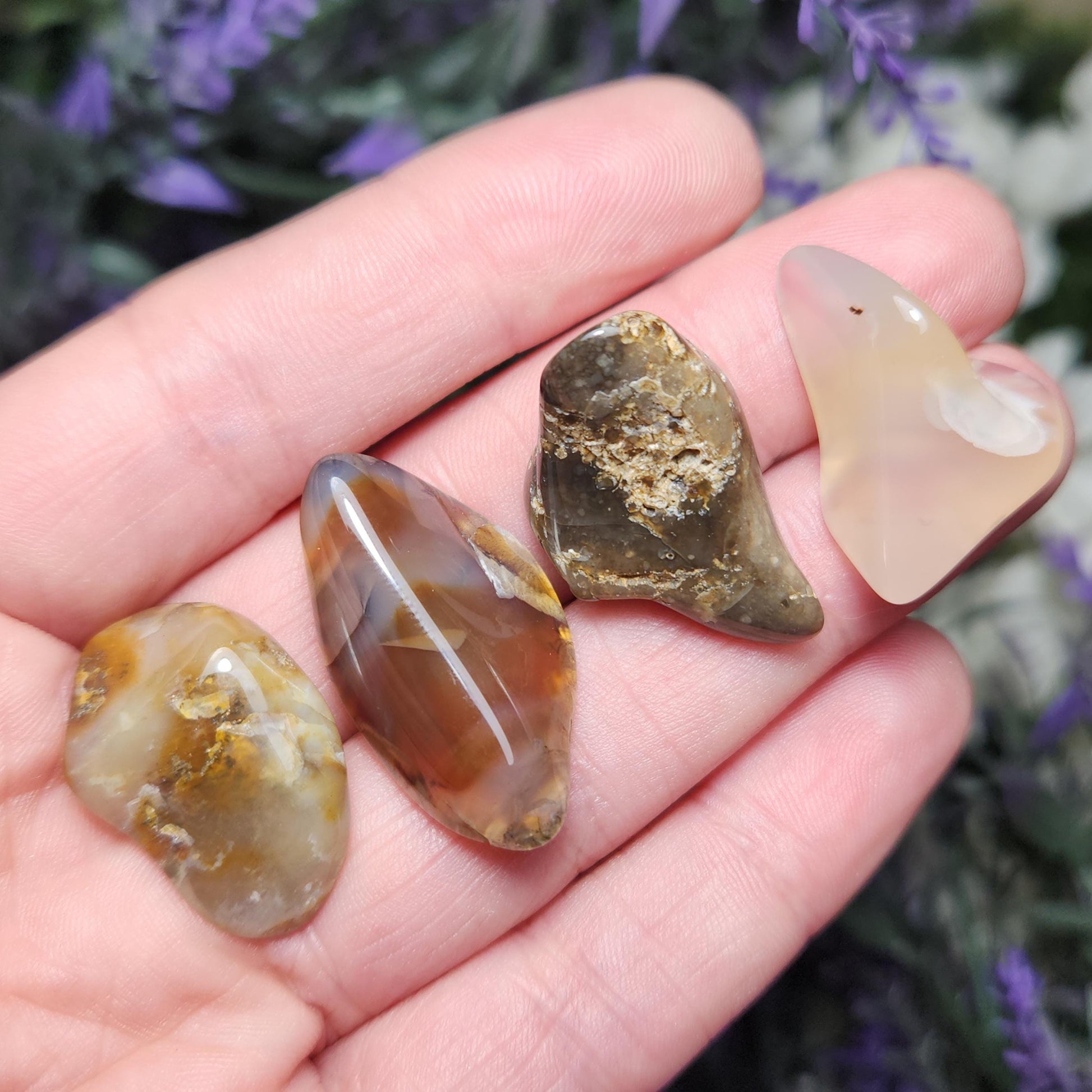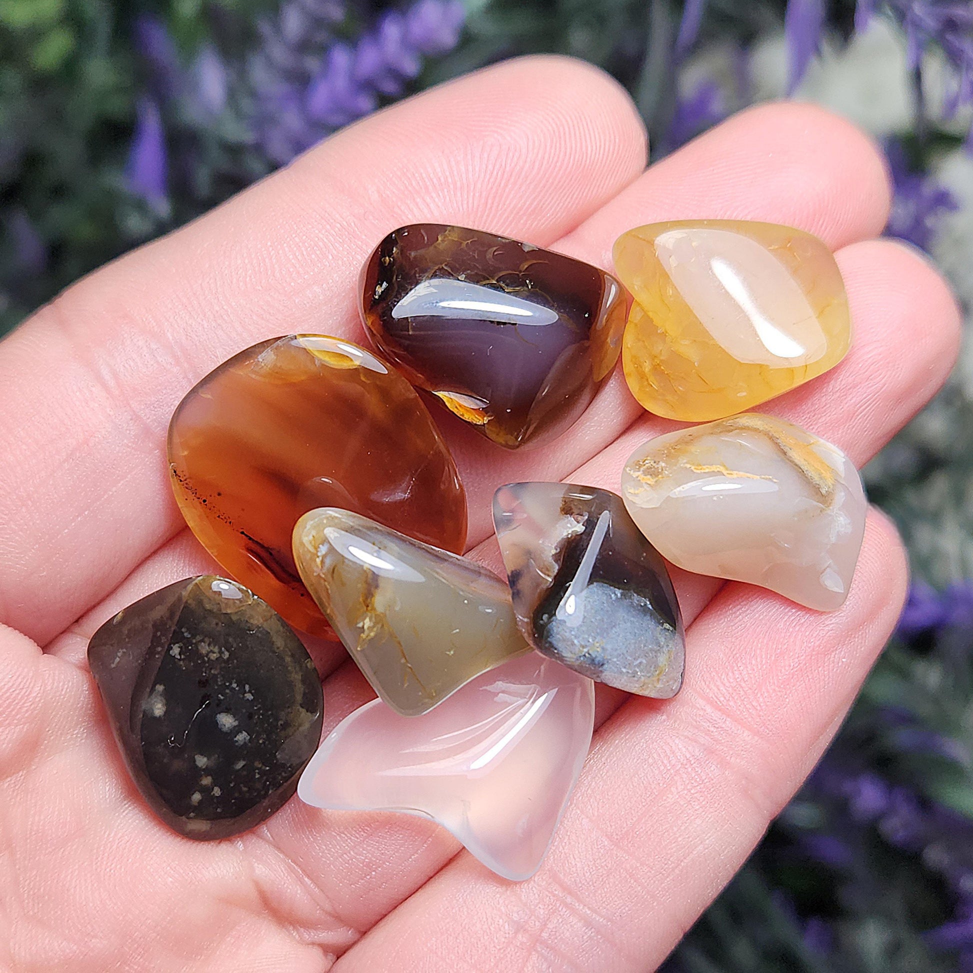 These tumbled Agate stones from Montana range from translucent to opaque, with a variety of color possibilities including completely colorless, golden hues, deep browns, and warm rusty orange. They may contain banding patterns or natural inclusions. Each specimen weighs 2 grams and up.