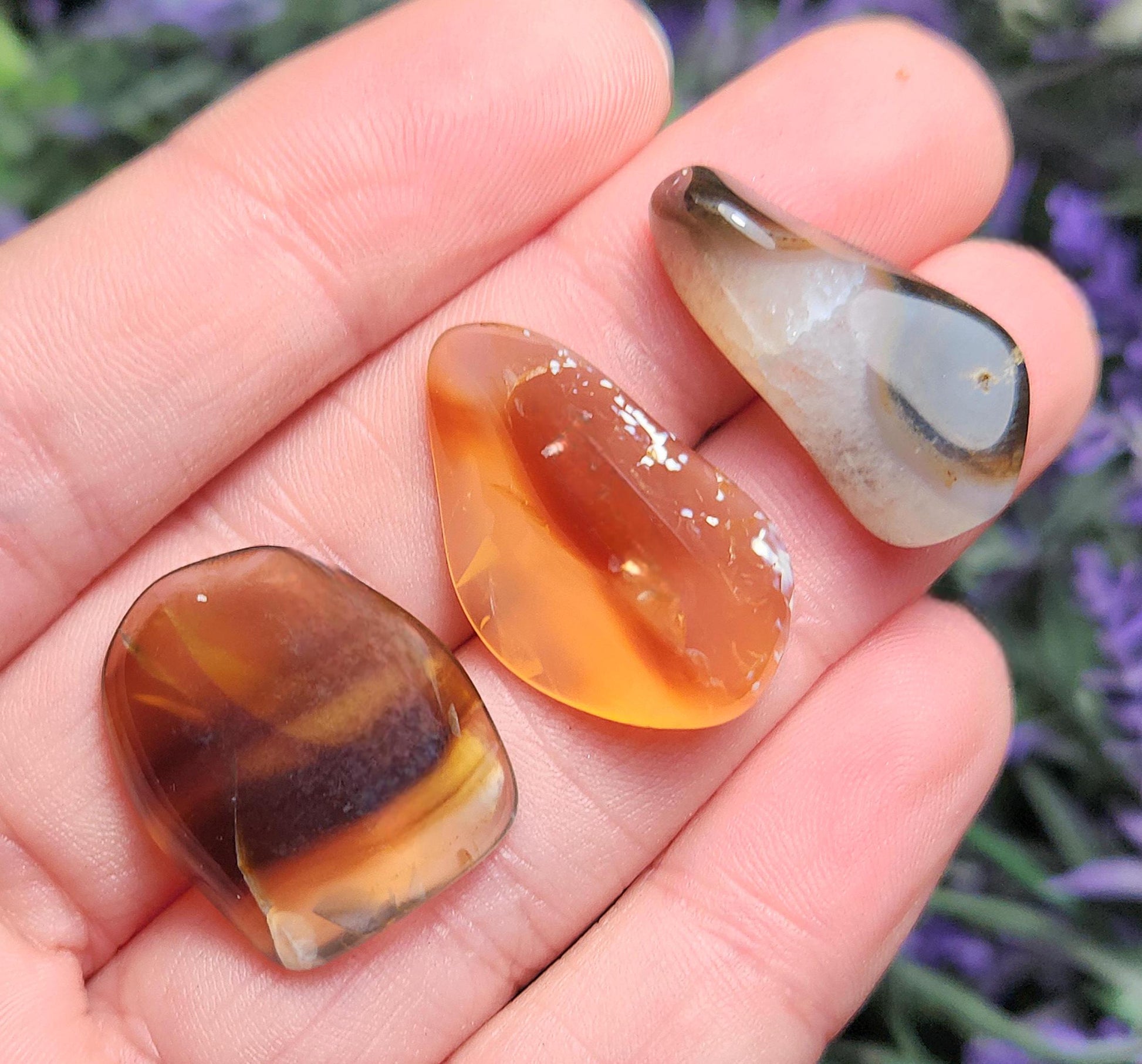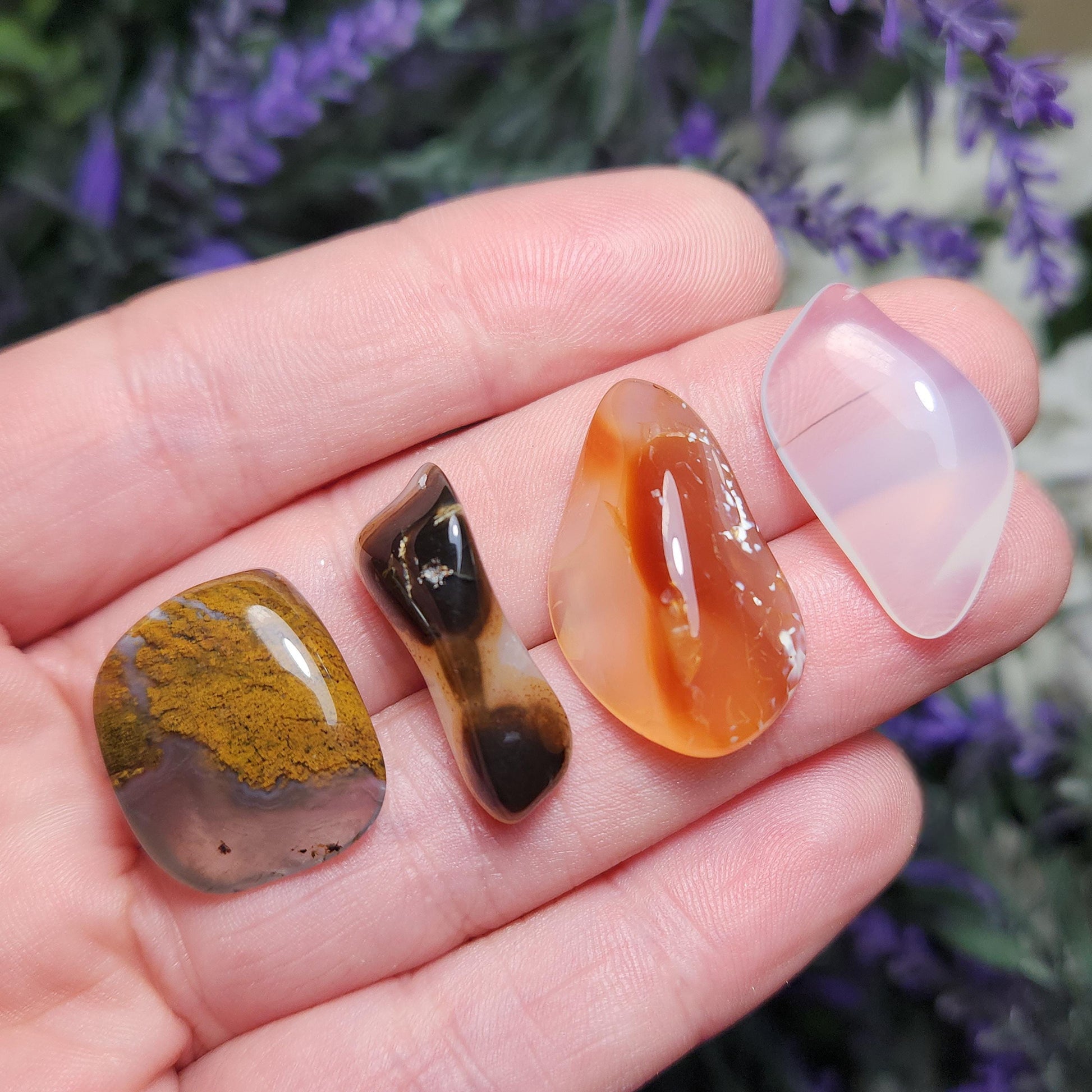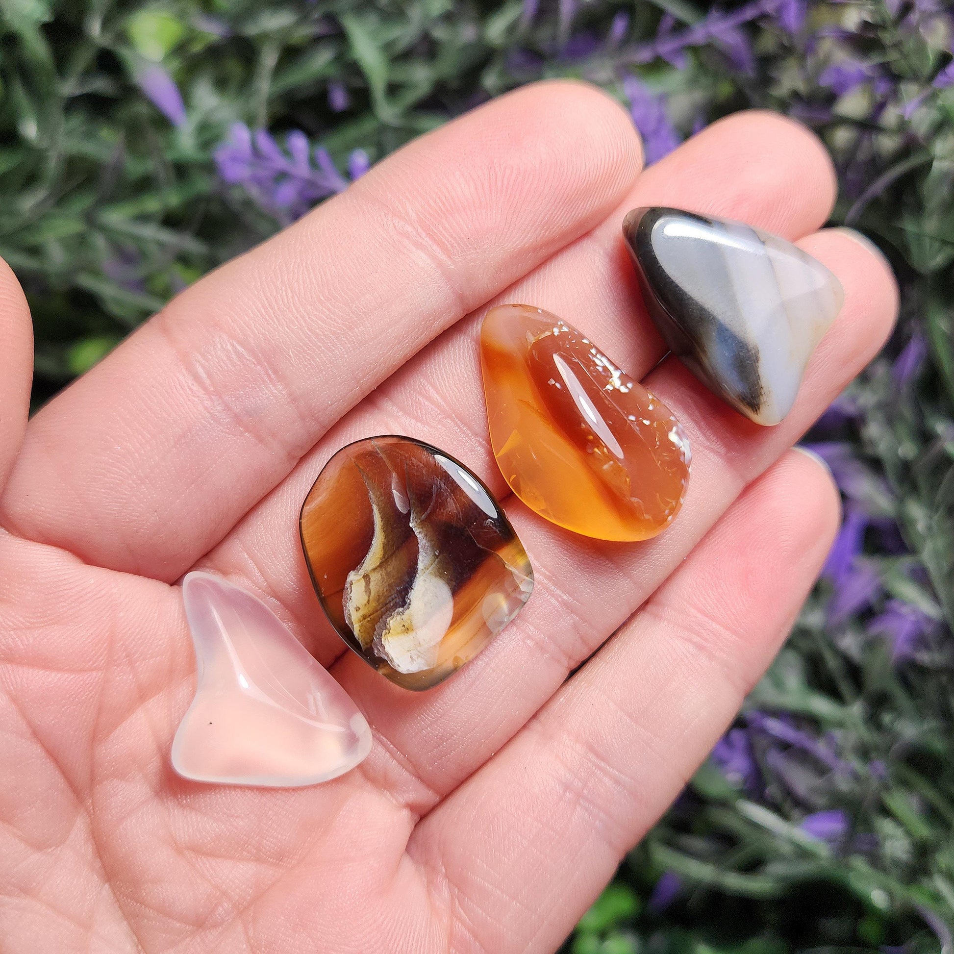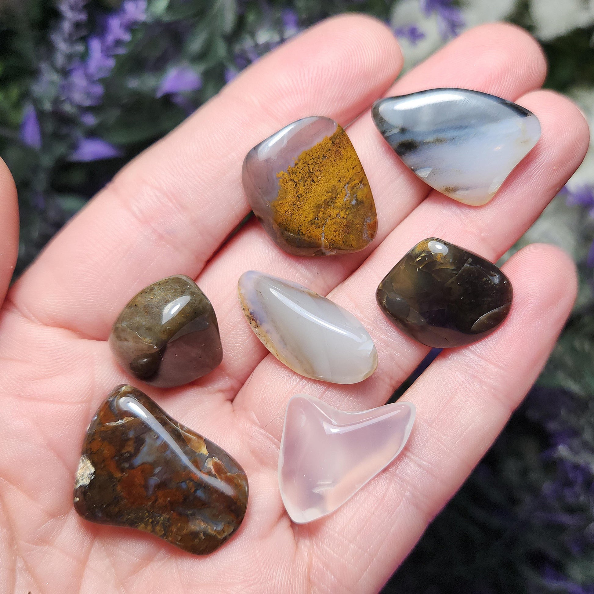 These tumbled Agate stones from Montana range from translucent to opaque, with a variety of color possibilities including completely colorless, golden hues, deep browns, and warm rusty orange. They may contain banding patterns or natural inclusions. Each specimen weighs 2 grams and up.