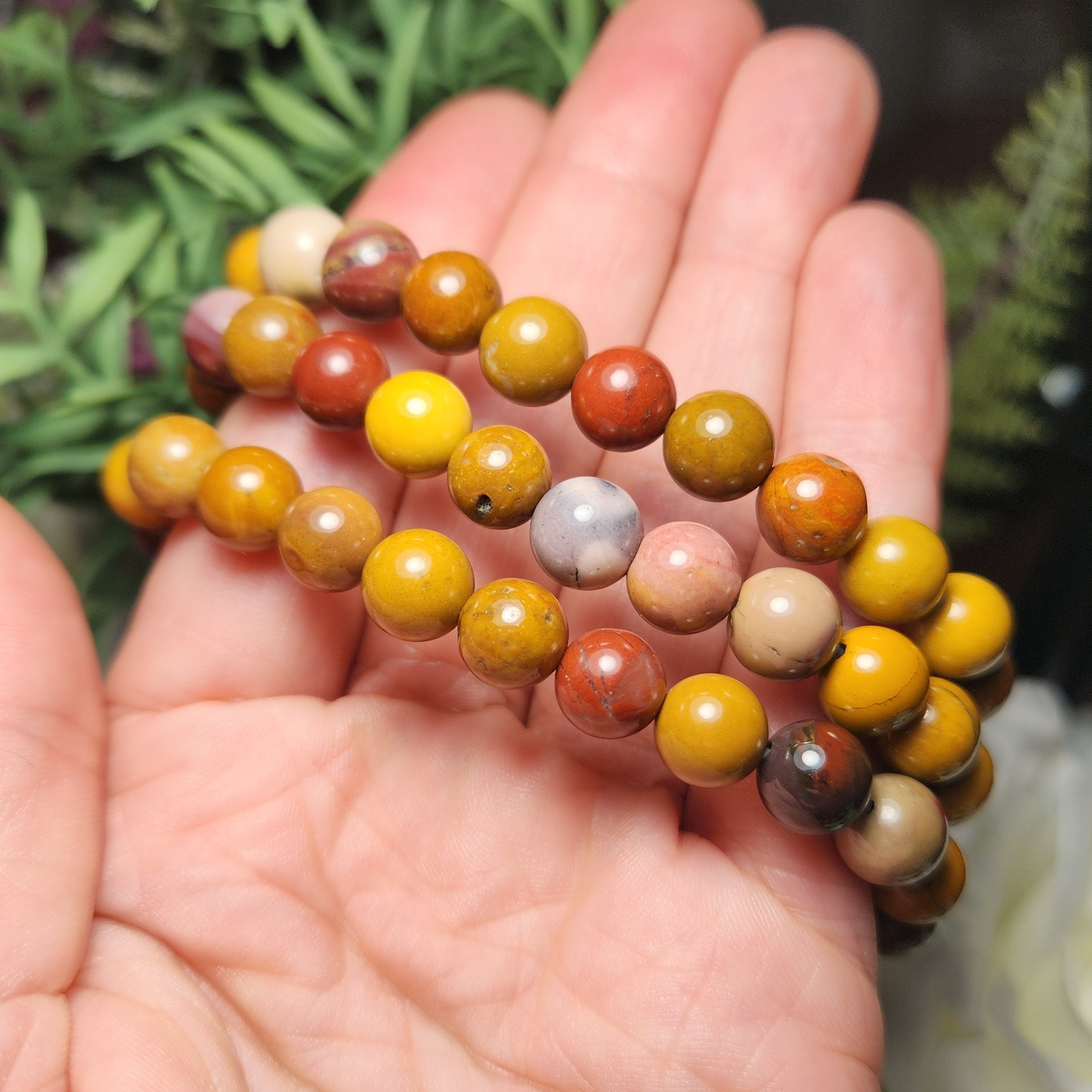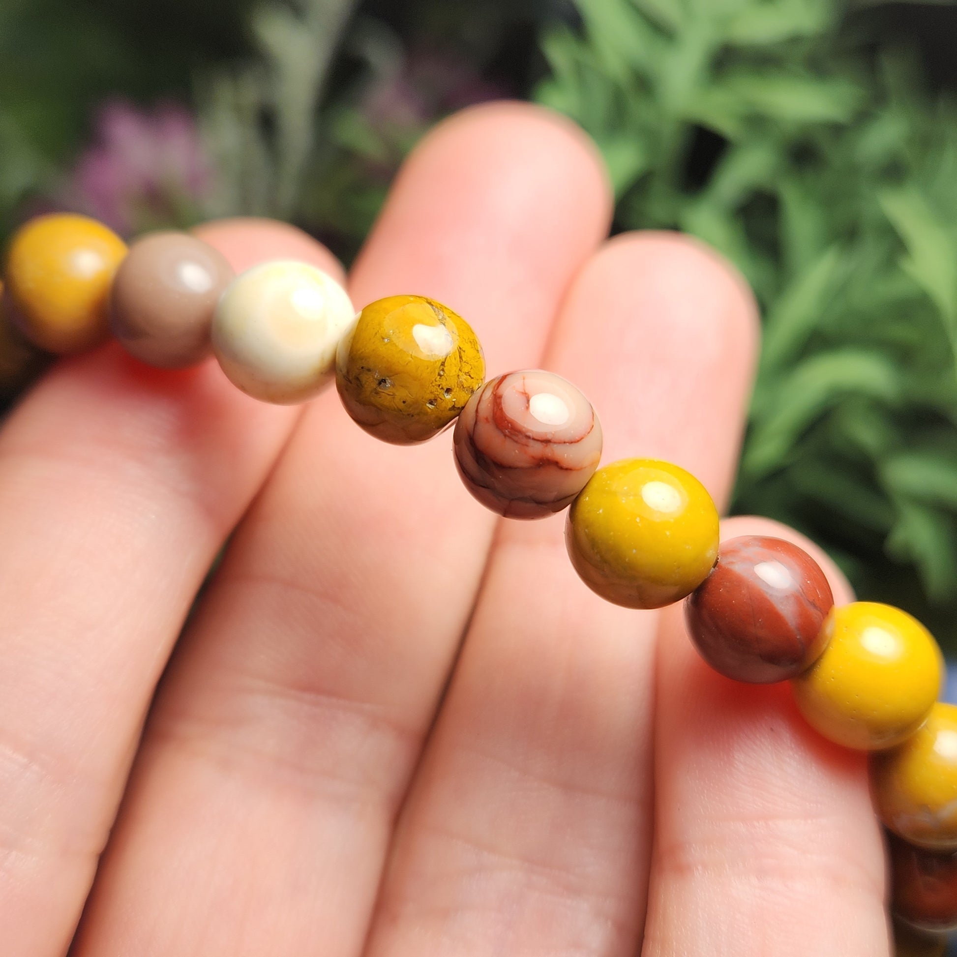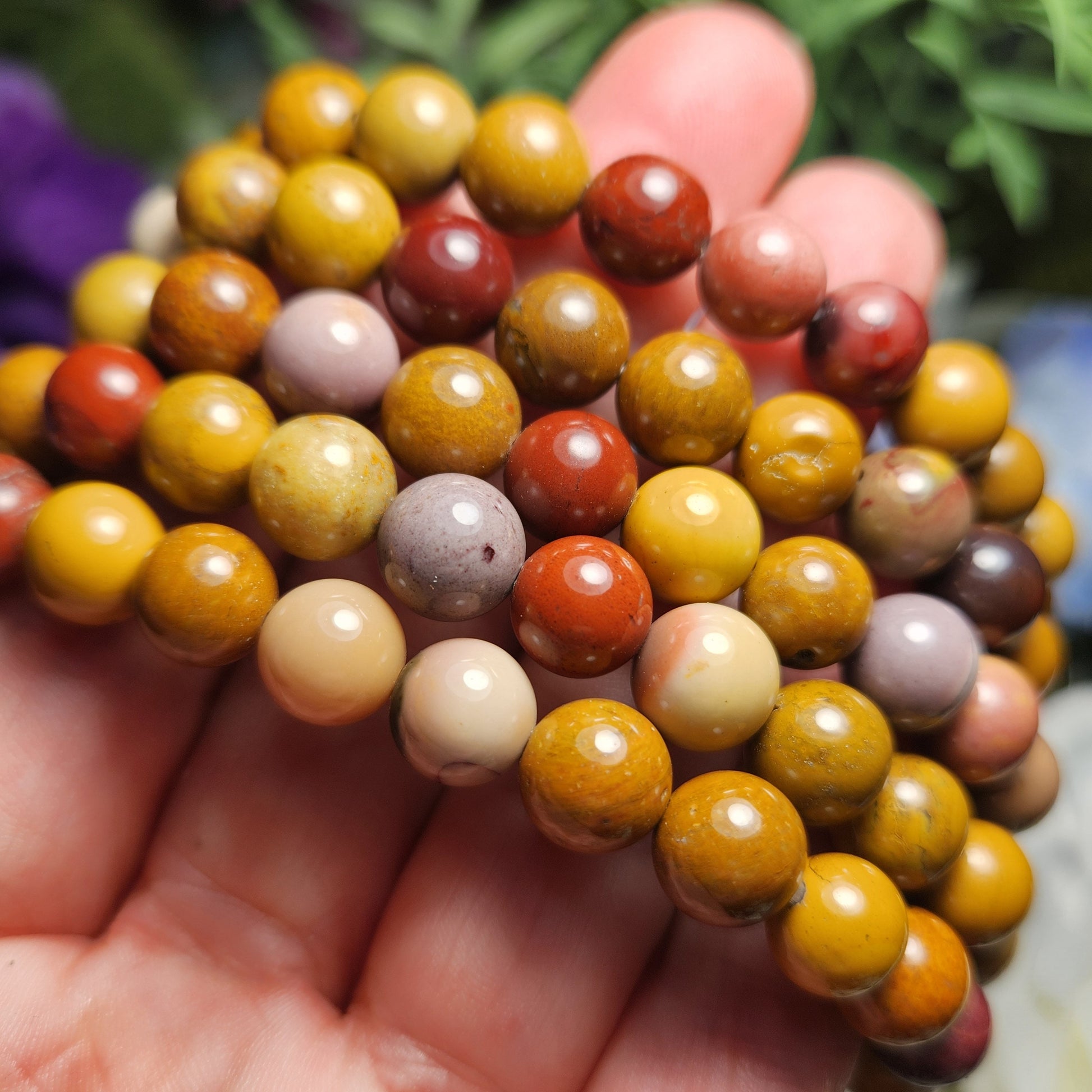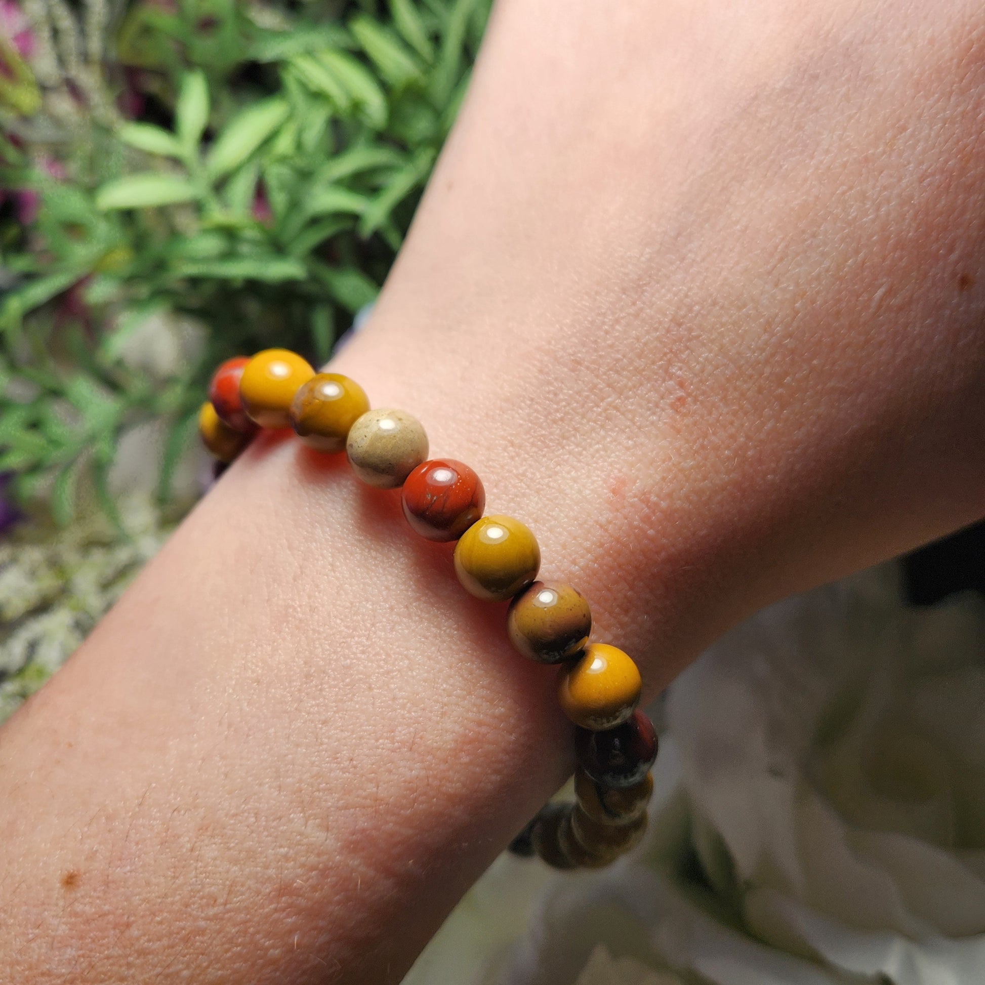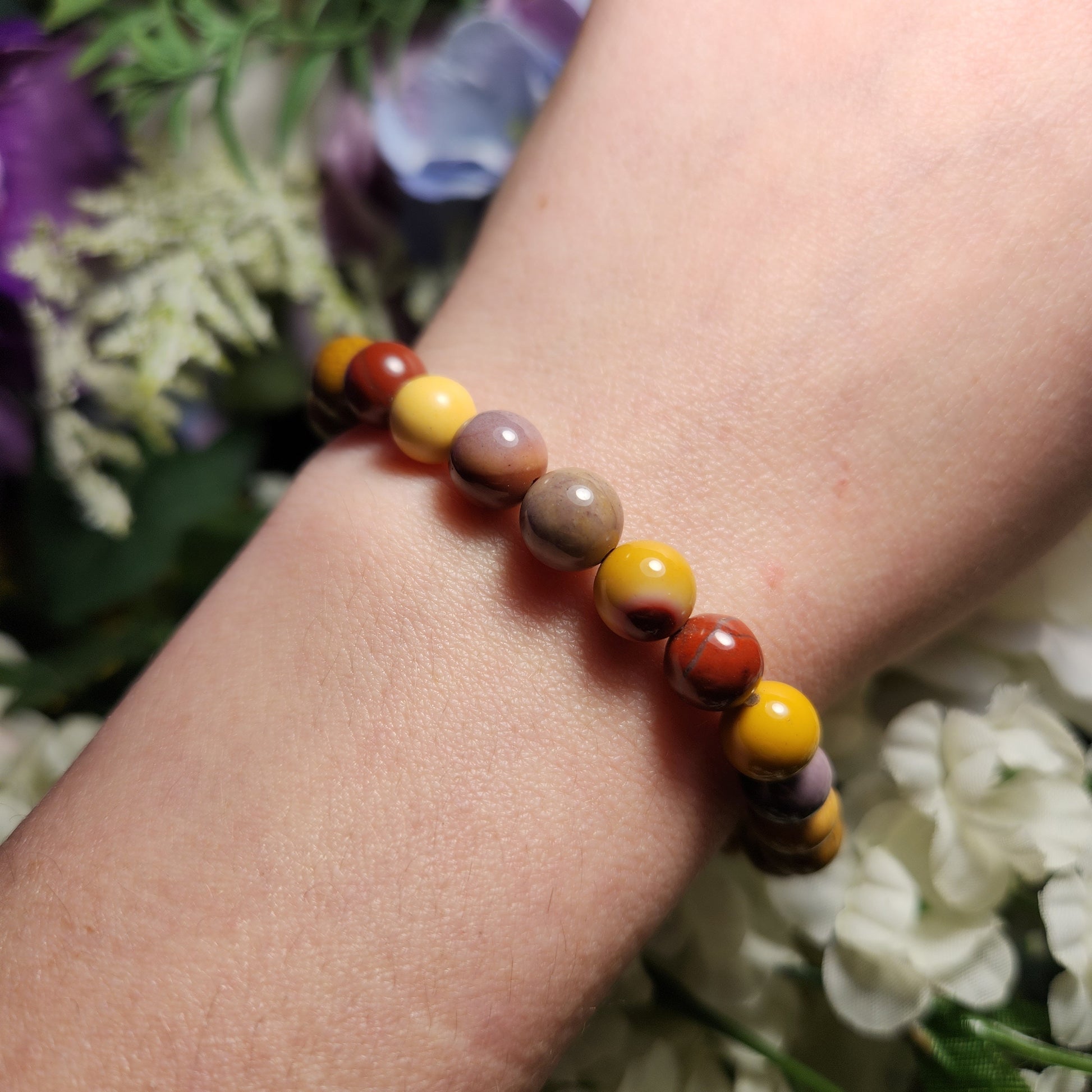 These Mookaite Jasper stretch bracelets include a wide range of colors and are created with 7mm beads that have been polished to a high sheen. Each bracelet measures approximately 7 inches.
