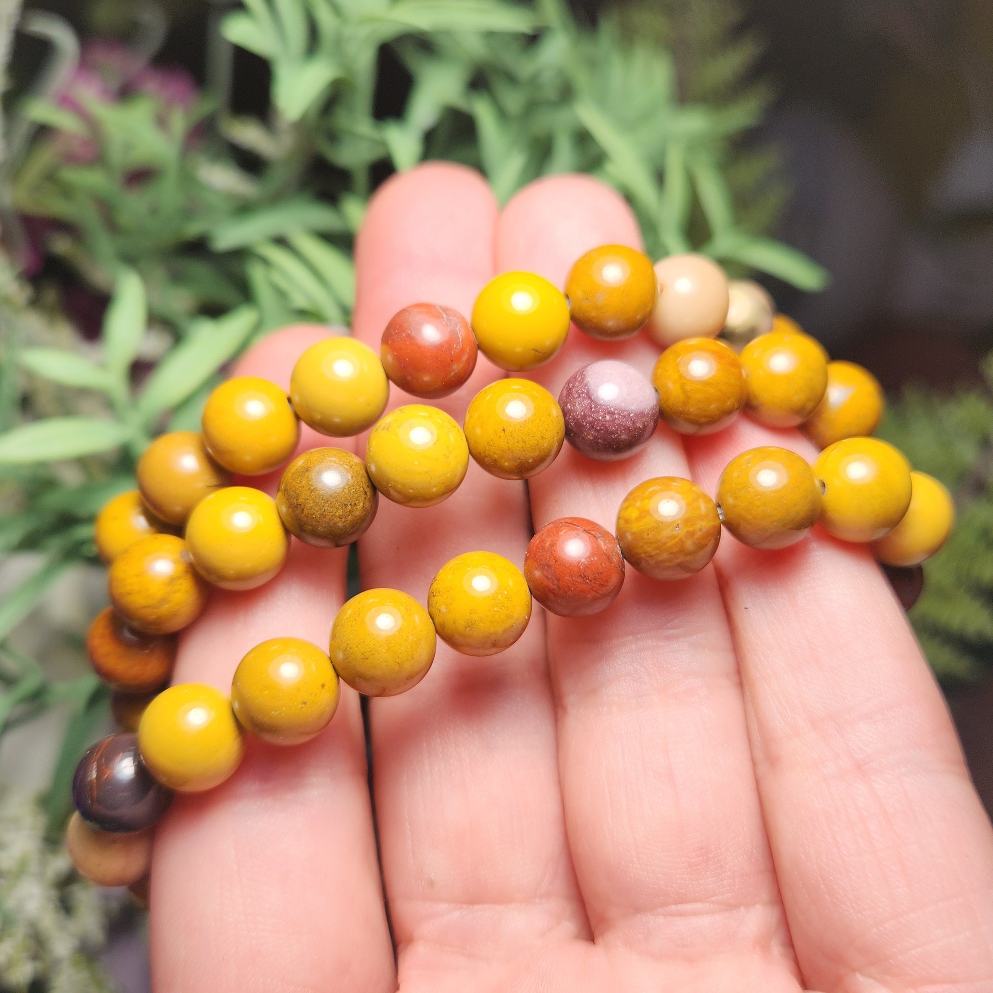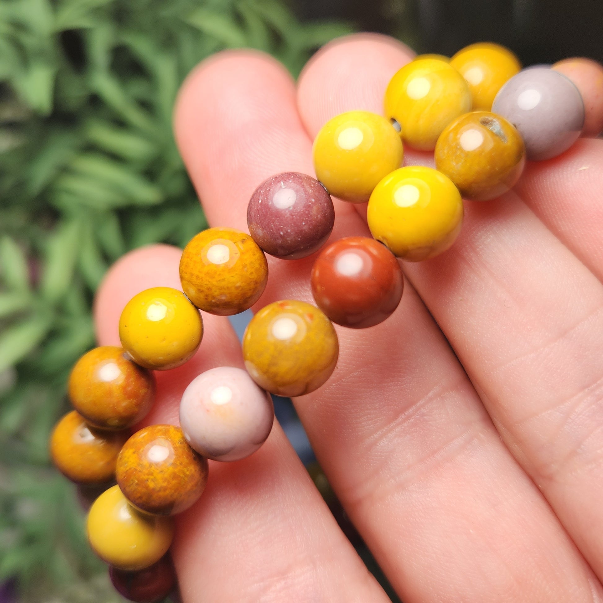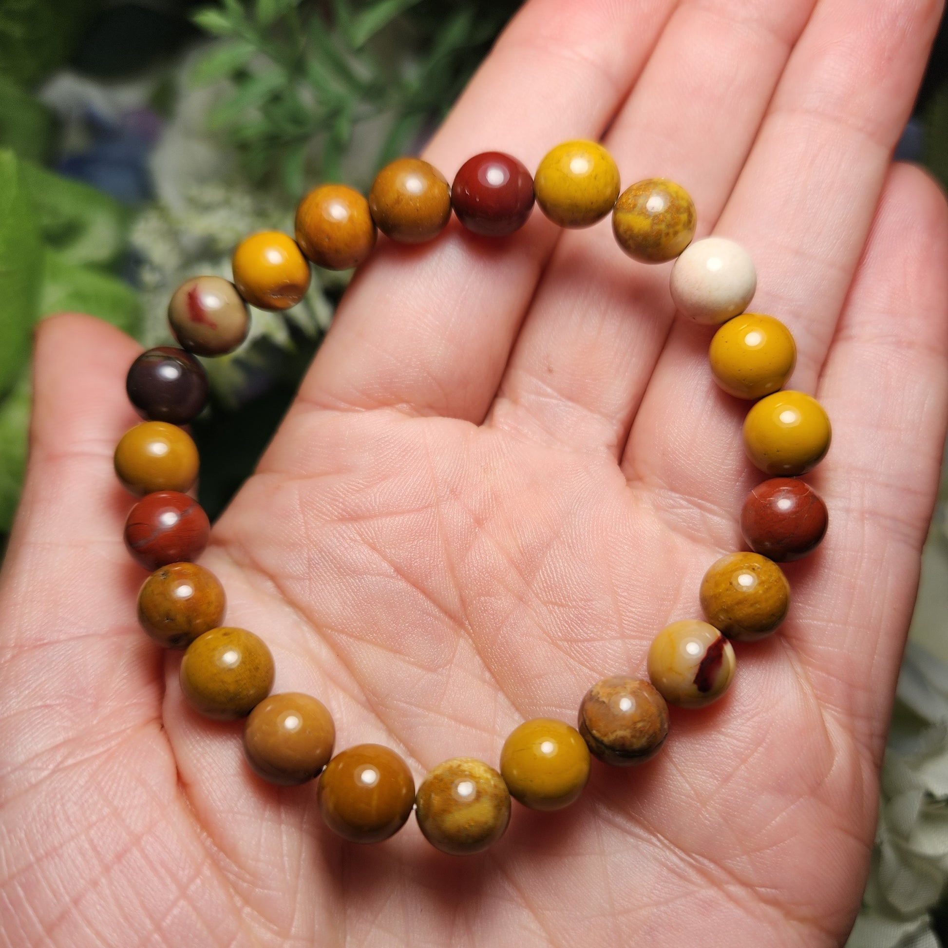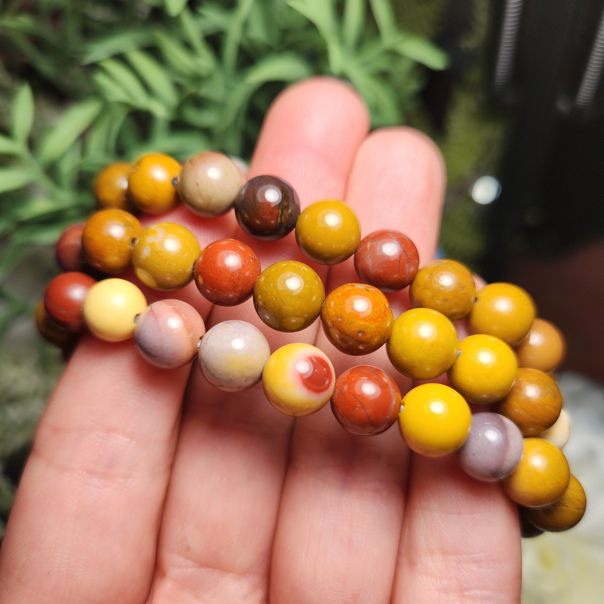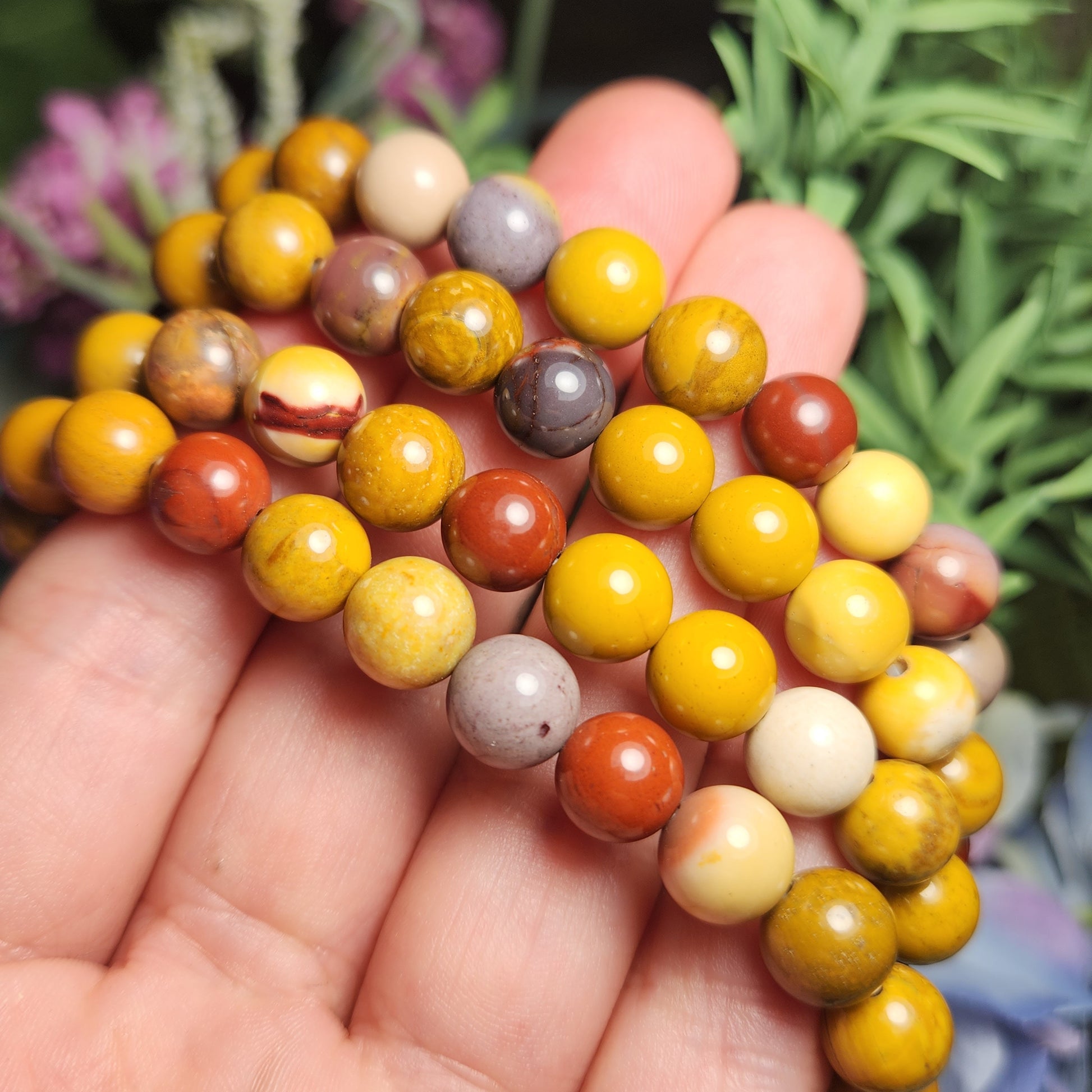 These Mookaite Jasper stretch bracelets include a wide range of colors and are created with 7mm beads that have been polished to a high sheen. Each bracelet measures approximately 7 inches.