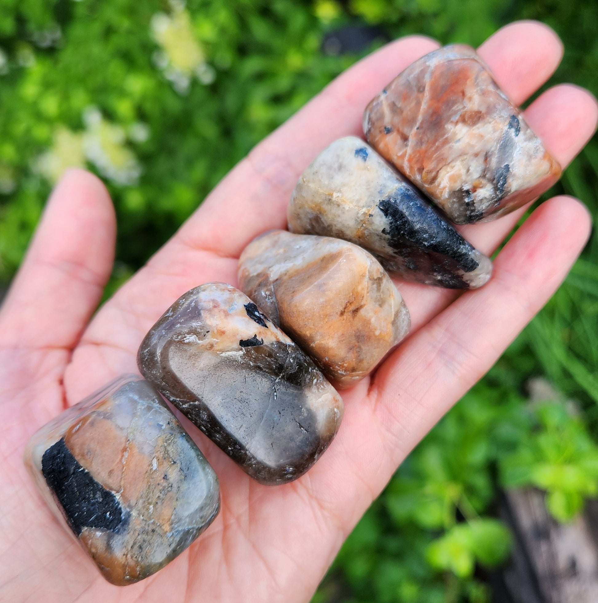 Peach Moonstone and Black Tourmaline come together Quartz to create this natural combination of minerals. These stones have been tumbled to a polish, exhibiting freeform shapes and unique compositions. Each crystal showcases Moonstone with peach to sepia tones among creamy taupe and silica-rich Quartz with dark Tourmaline inclusions. Each specimen measures approximately 1.25 inches and up.