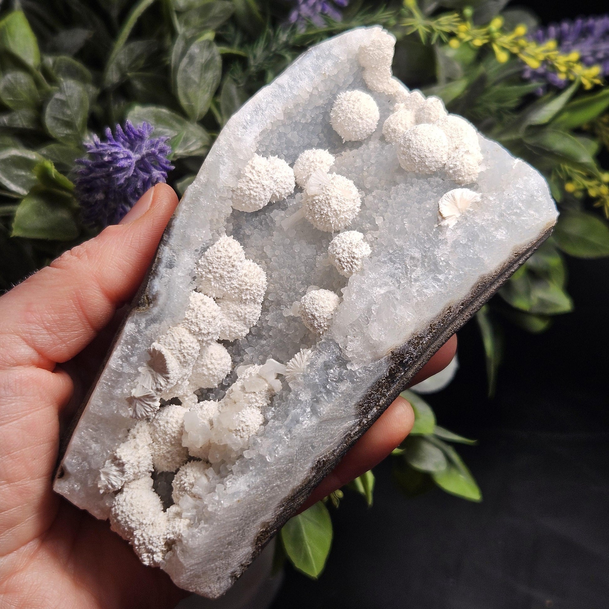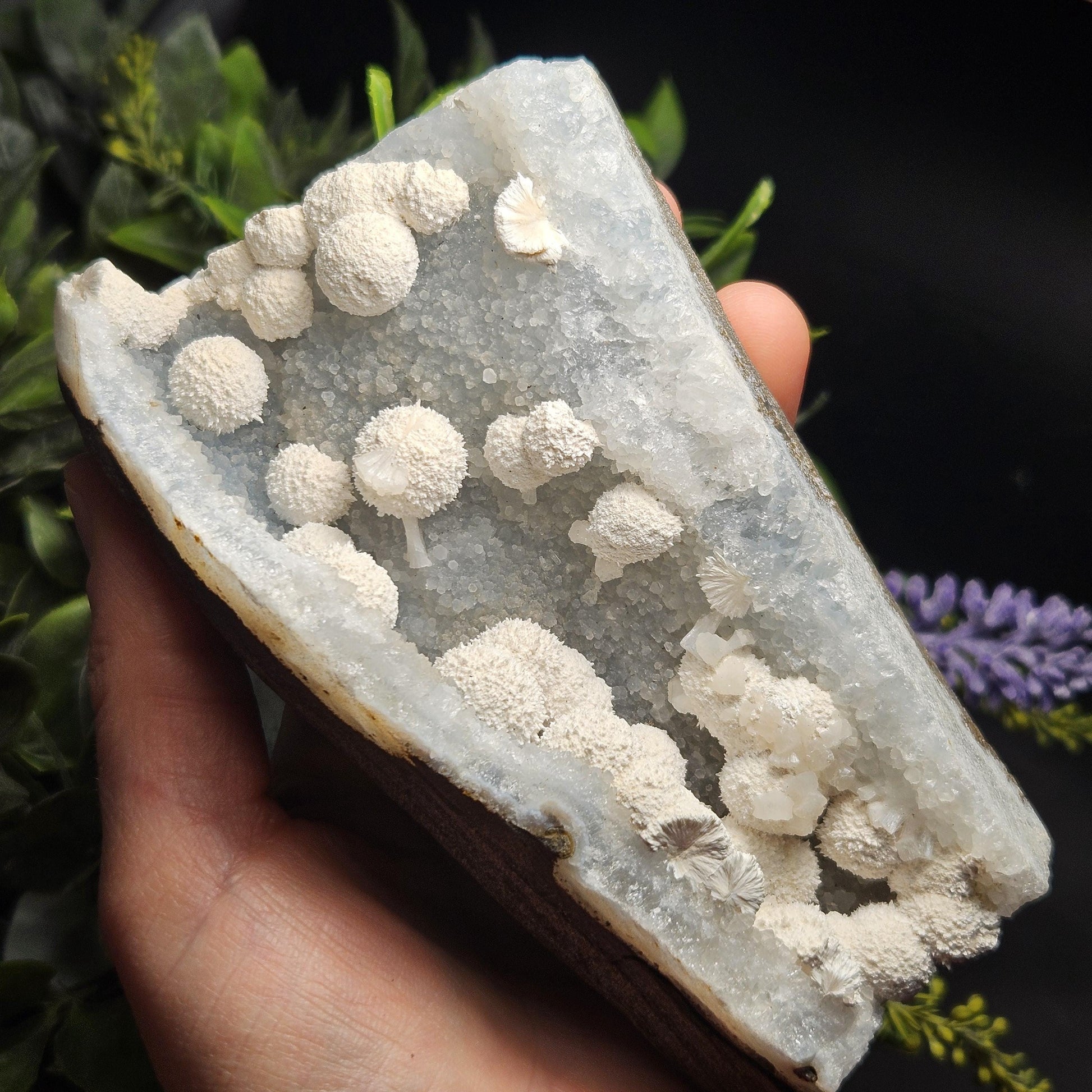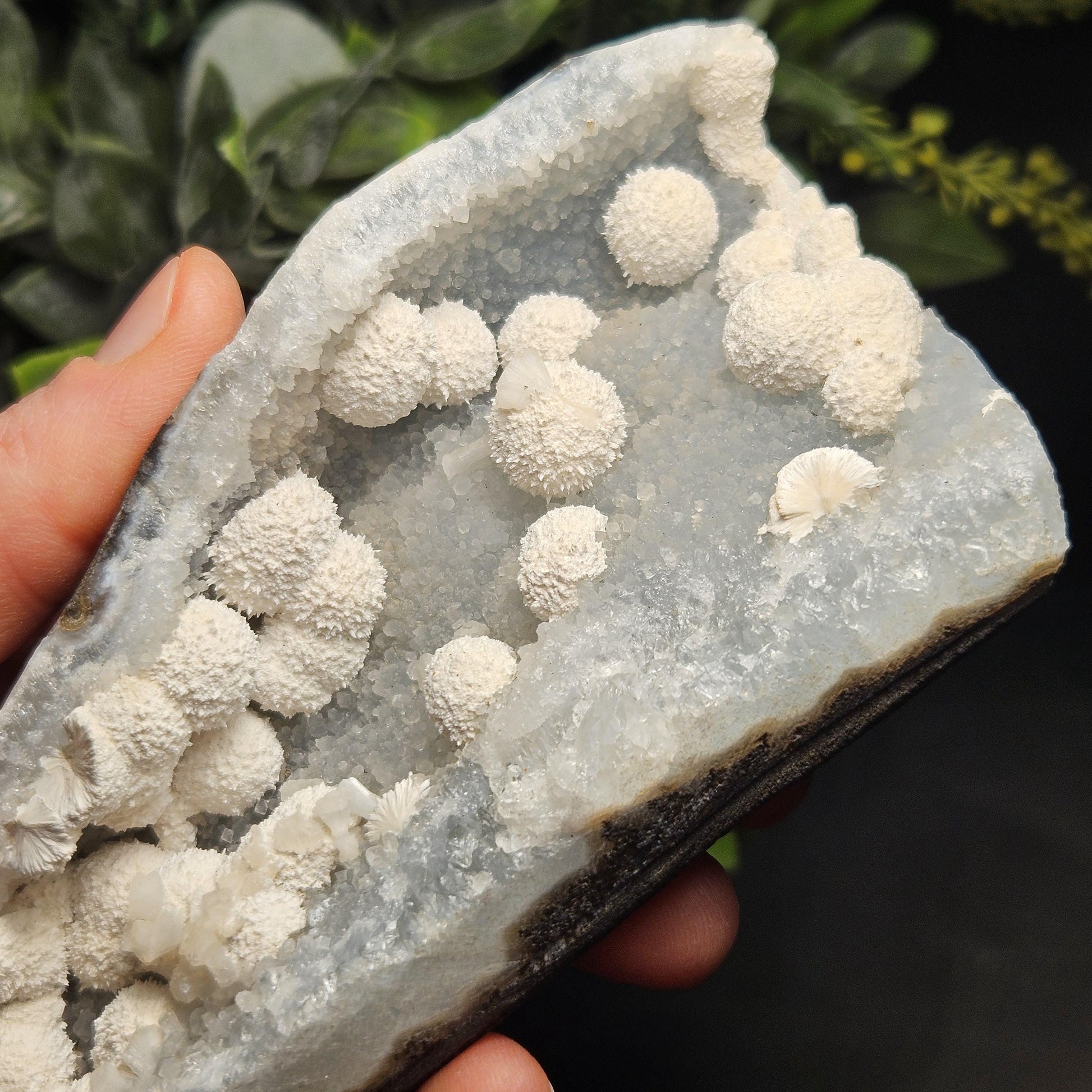 Mordenite is a rare and beautiful Zeolite mineral formed in volcanic rock, known for its delicate, fibrous crystal structures and soft white to pinkish hues. Geologically, it’s valued for its impressive ability to absorb water and toxins, making it fascinating to both scientists and collectors. This rare offering features distinctly spherical Mordenite crystals perched on sparkling blue Chalcedony and matte grey Basalt. The snowball-like growths have a creamy white coloring that contrasts beautifully with their bright blue background. With an array of Mordenite spheres and a translucent mineral inclusion, this unique crystal is a perfect display piece. This specimen measures approximately 123mm by 60mm by 38mm and weighs 464 grams.