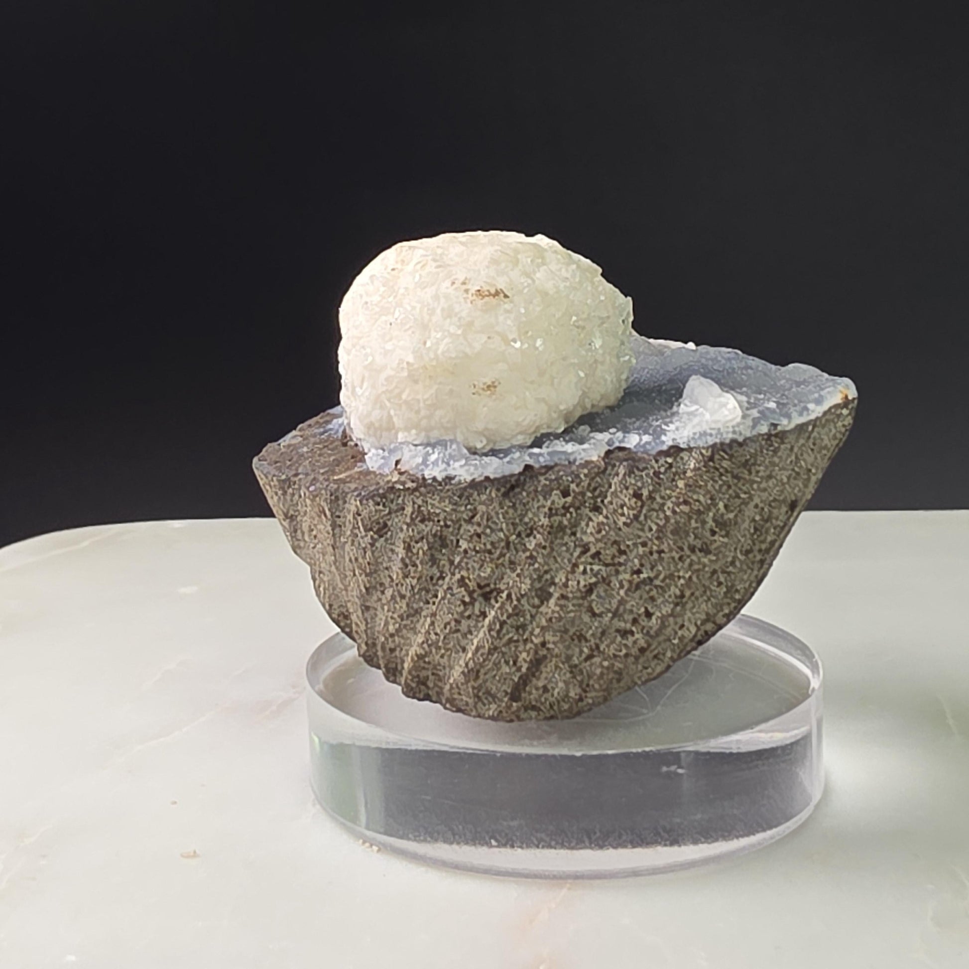Mordenite is a rare and beautiful Zeolite mineral formed in volcanic rock, known for its delicate, fibrous crystal structures and soft white to pinkish hues. Geologically, it’s valued for its impressive ability to absorb water and toxins, making it fascinating to both scientists and collectors. This large single Mordenite crystal on Quartz is a rare offering from India. It contains a natural white spherical crystal perched on light lavender terminations of druzy quartz. This specimen measures approximately 55mm by 45mm by 45mm and weighs 120.7 grams.