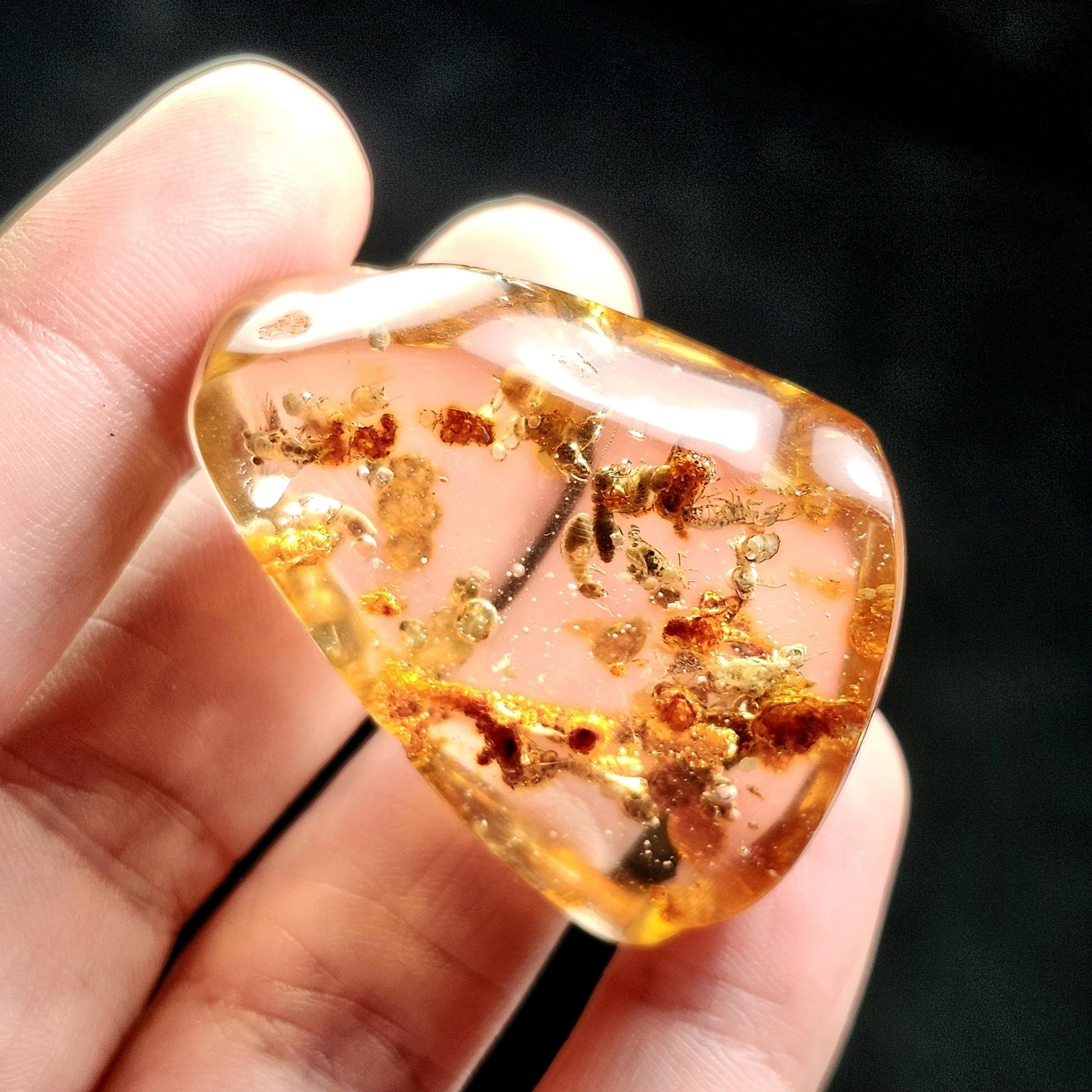 This polished Amber specimen has a glowing translucence, showcasing the preserved insect inclusions and enhydro bubbles within its depths. There is one small enhydro bubble that shows very slight movement, shifting within a 1mm cavity and a shining rainbow inclusion. This stone glows with a colorful, saturated brilliance when under a black light - a rare quality in the mineral kingdom! This specimen measures approximately 42mm by 30mm by 13mm and weighs 11.1 grams.