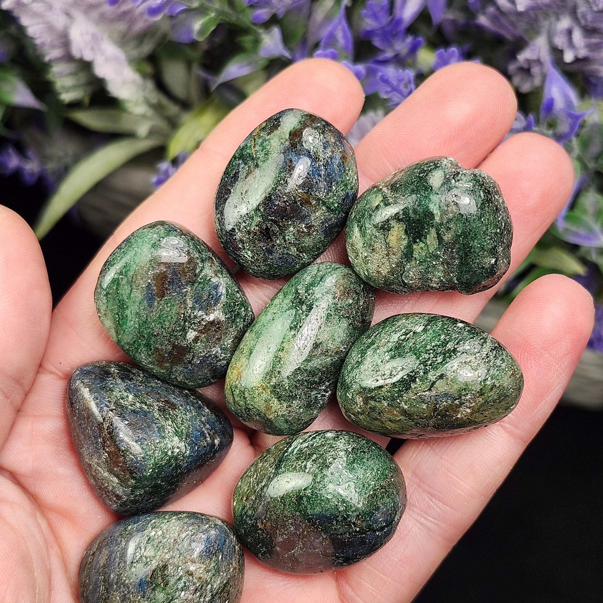 These combination crystals from the Ural Mountains bring together two unique members of the mica family: Muscovite and Fuchsite. They have a light polish, with remaining texture in some spots. These mica-rich stones have a slight shimmering luster and exhibit a range of green color tones created by the presence of chromium.