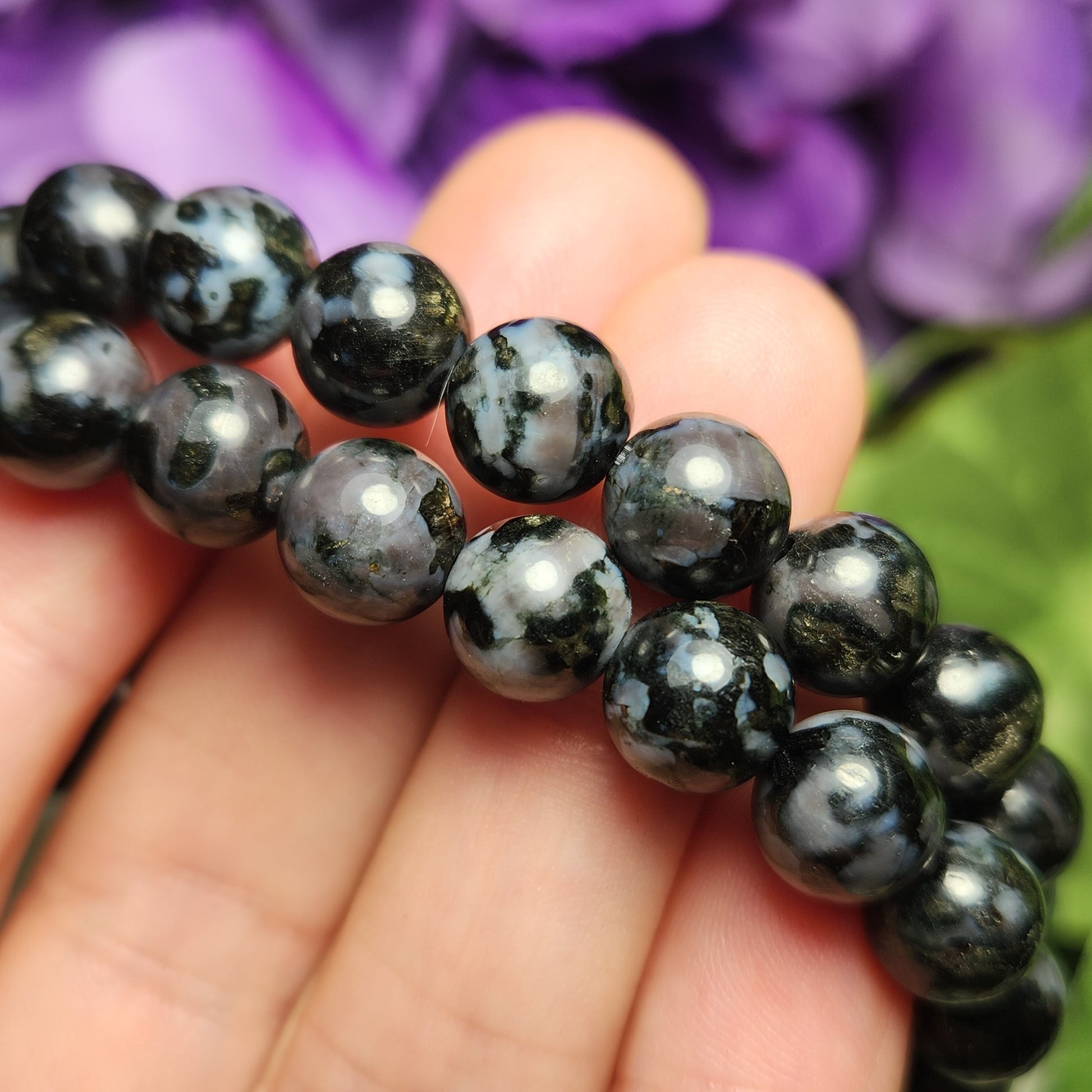 These Indigo Gabbro stretch bracelets are created with 8mm beads that have been polished to a high sheen. Each bracelet measures approximately 7 inches.