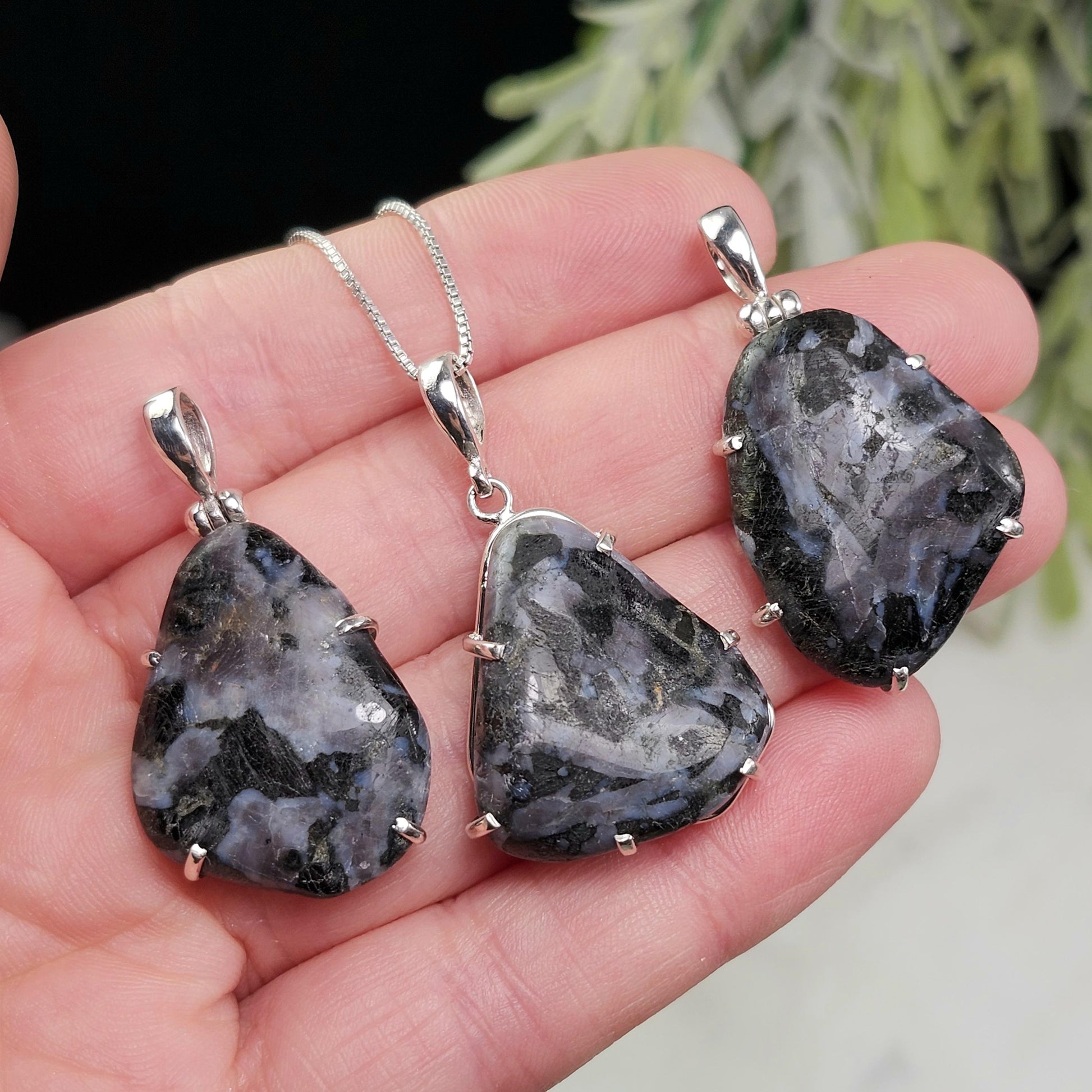 These Mystic Merlinite stones have been tumbled to a smooth polish, displaying shades of periwinkle marbled with black. Each crystal has been custom created into a sturdy piece of jewelry using .925 Sterling Silver. Each pendant measures approximately 30mm by 20mm - these measurements are meant to give a general idea of size; the actual dimensions of the pendant you receive may vary slightly. The silver chain used in the photos is to help envision how this pendant will look while adorned but is not included in the listing.