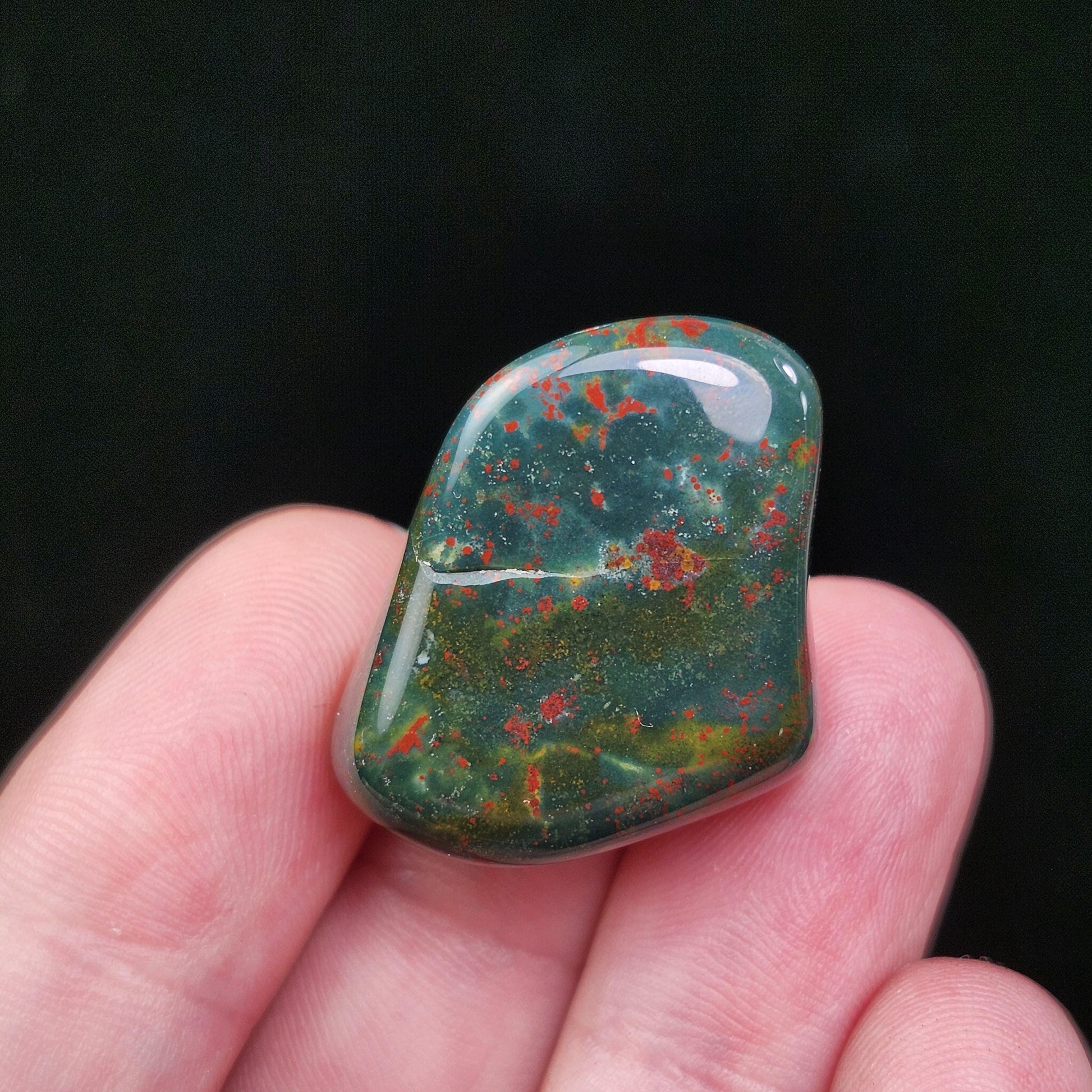 These Bloodstone crystals from Namibia have been tumbled to a high polish and display a range of teal and green coloring with small specks of blood red or yellow, Each specimen measures approximately .75 inches.