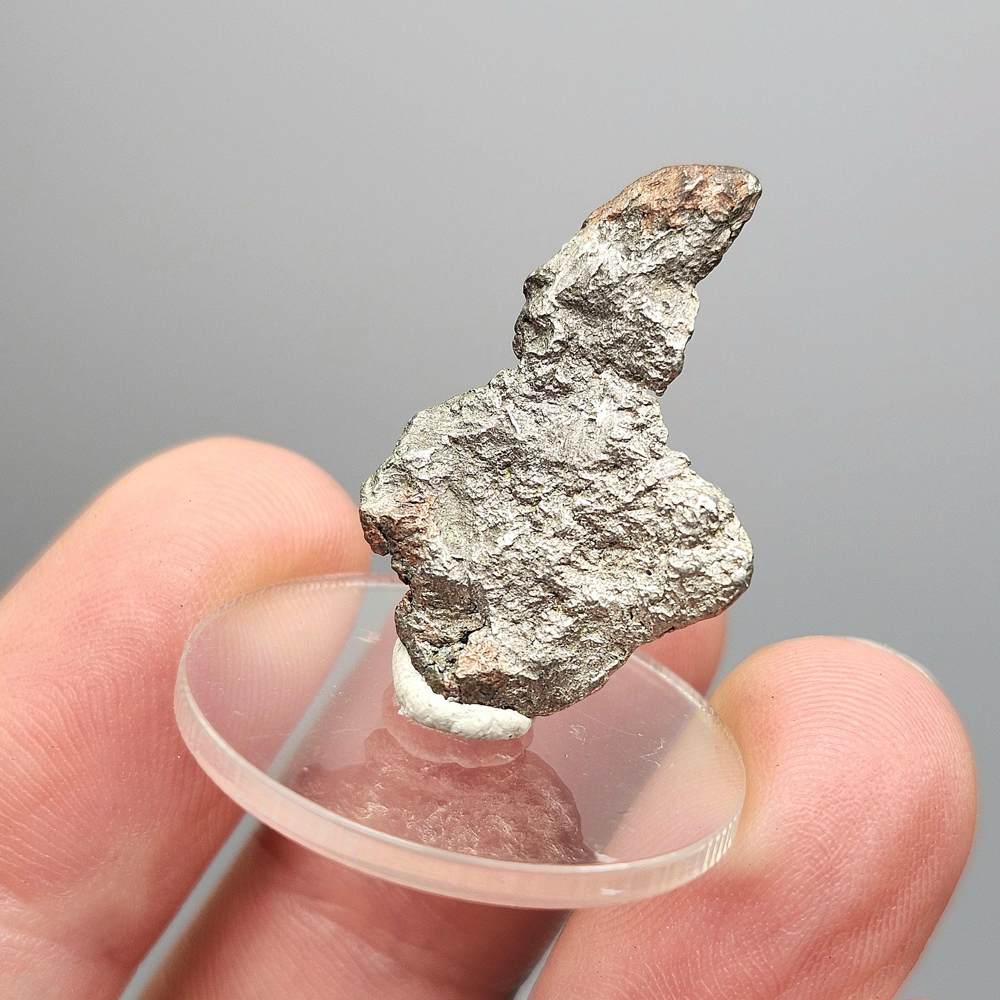 This native Silver and Copper nugget from Michigan is in its raw, natural form with metallic shine and a freeform shape. It contains a tiny hole - naturally occurring holes in stones are revered for their unique structure and symbolism. This specimen measures approximately 25mm by 16mm by 3mm and weighs 4.1 grams.