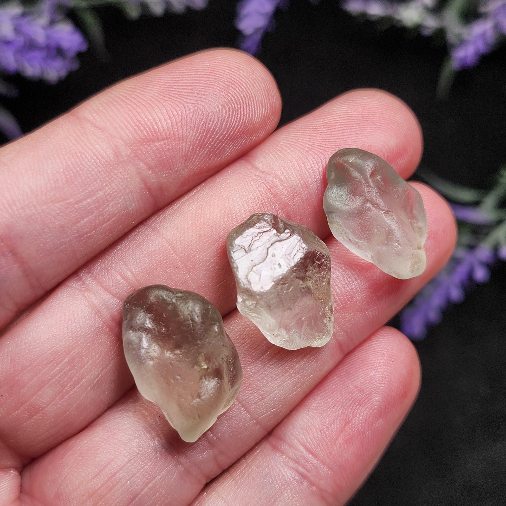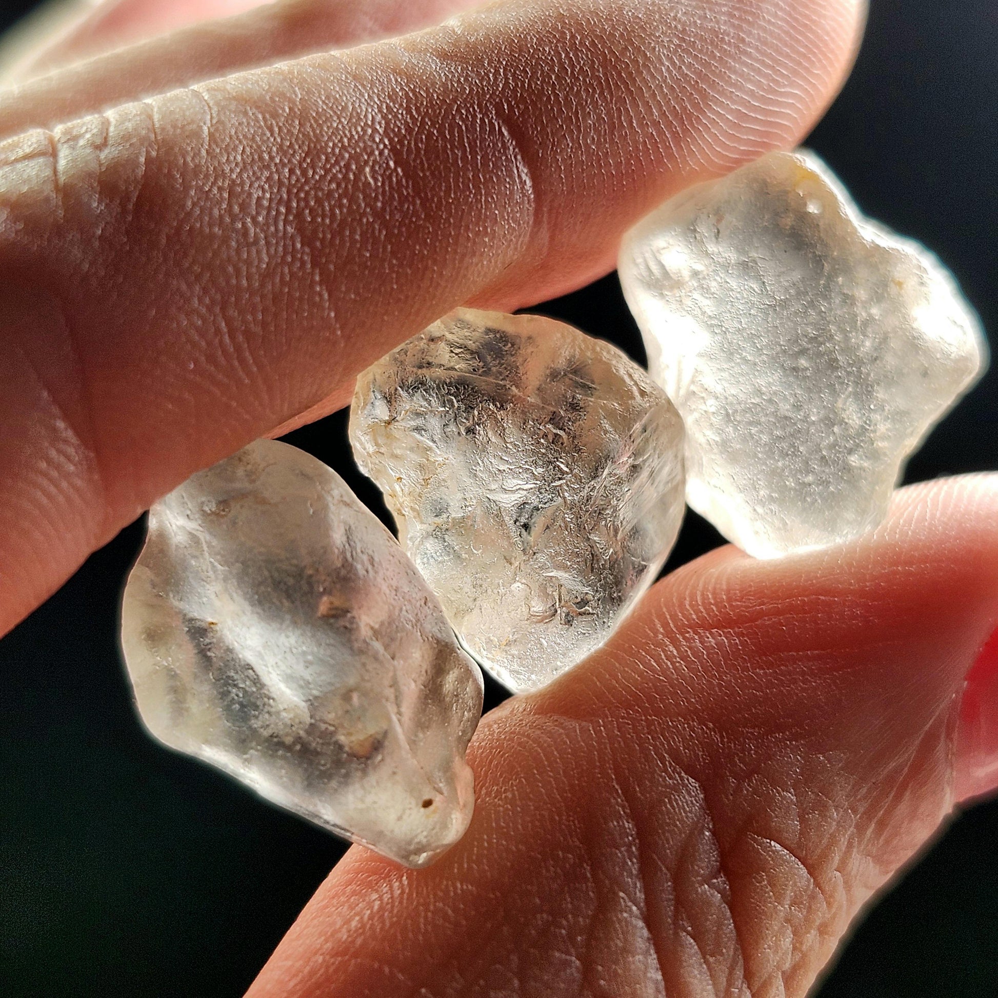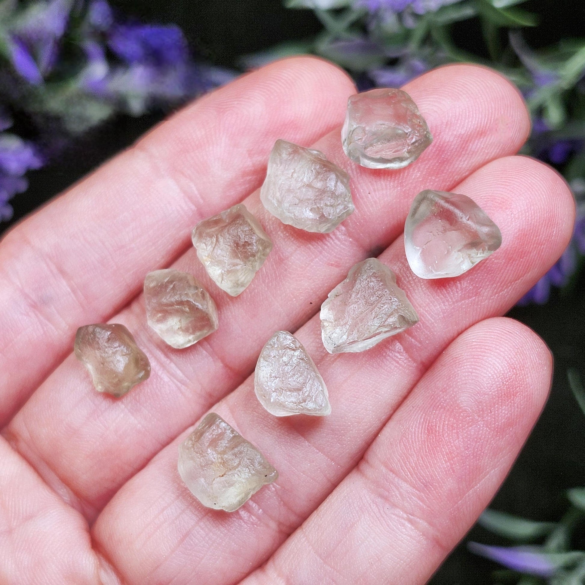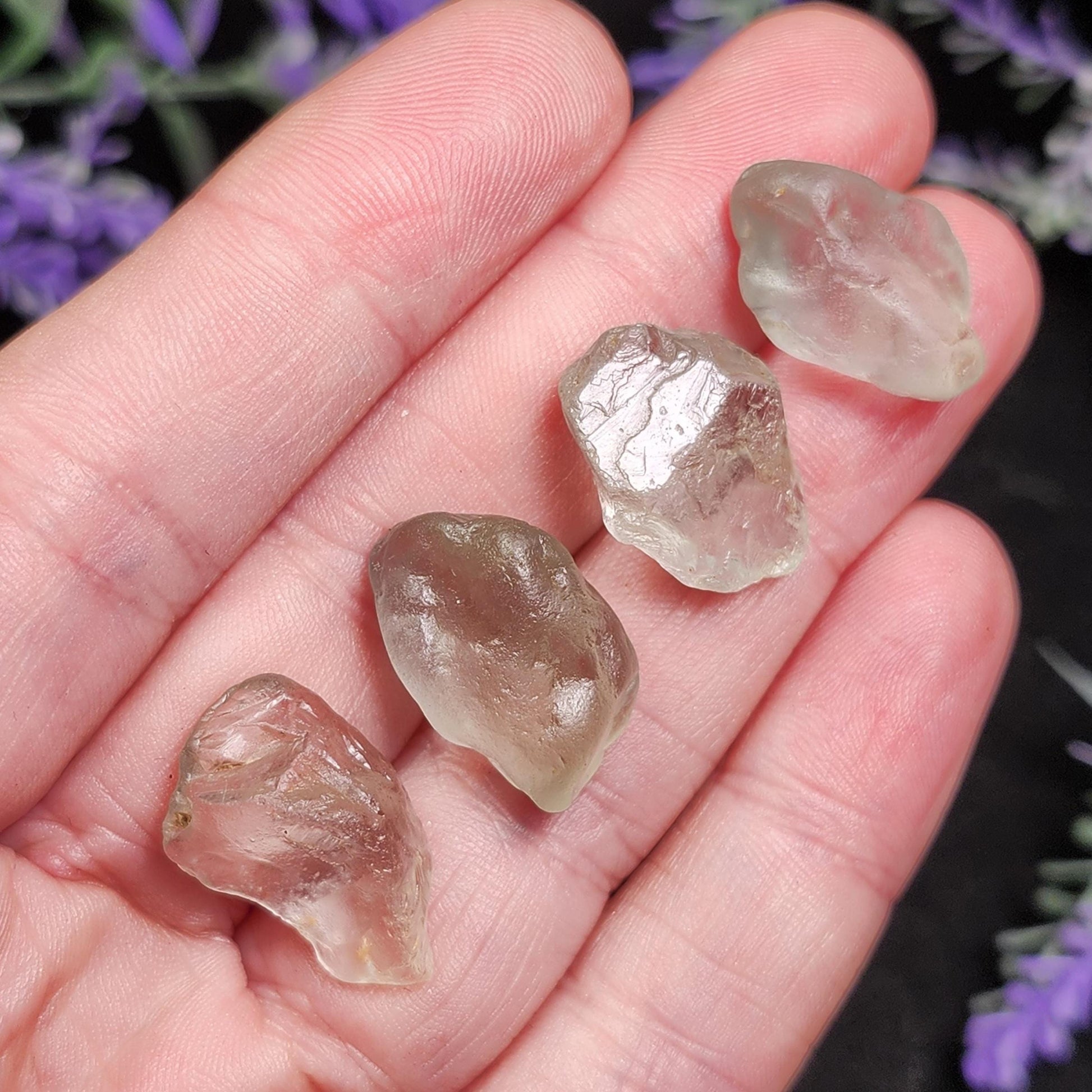 These Blue Topaz crystals are in their raw, natural form, exhibiting a slight polish from being river tumbled. They have a gemmy translucence with a golden hue and a very slight blue tone.