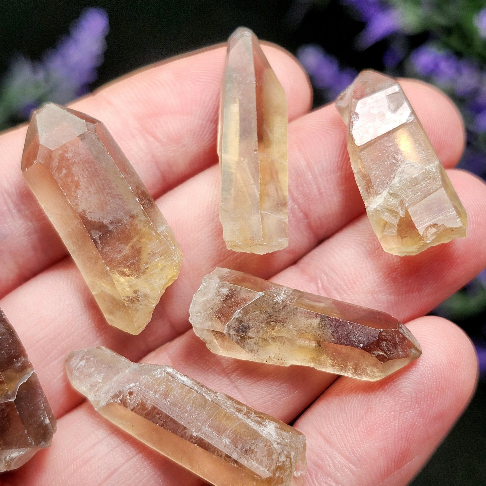 These Congo Citrine exhibit a smoky, golden transparency and have a high sheen on their natural facets. They may contain partial to full terminated points and some abrasions are to be expected in these raw specimens.