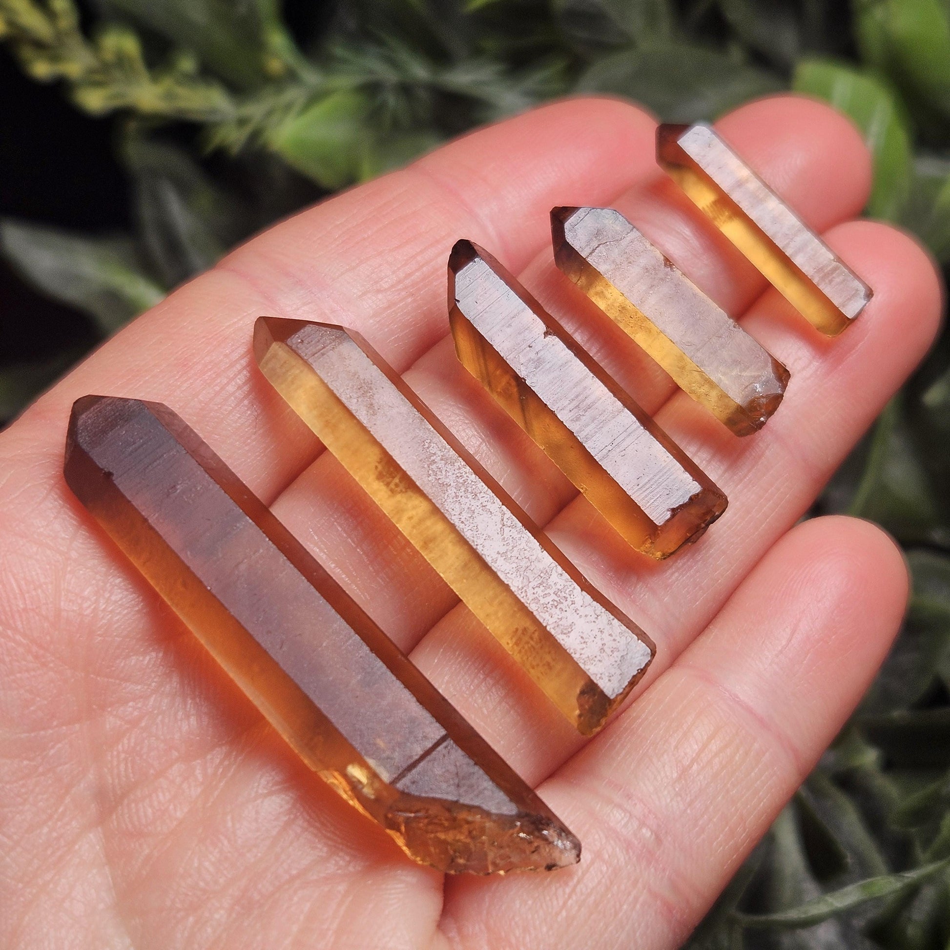 These natural Citrine crystals from the Republic of the Congo are presented in their raw form and feature naturally terminated points. They display a smoky golden hue and reveal a warm, glowing translucence when backlit. These specimens are particularly high quality, appearing almost illuminated as light passes through them. As natural crystals, minor surface abrasions may be present.