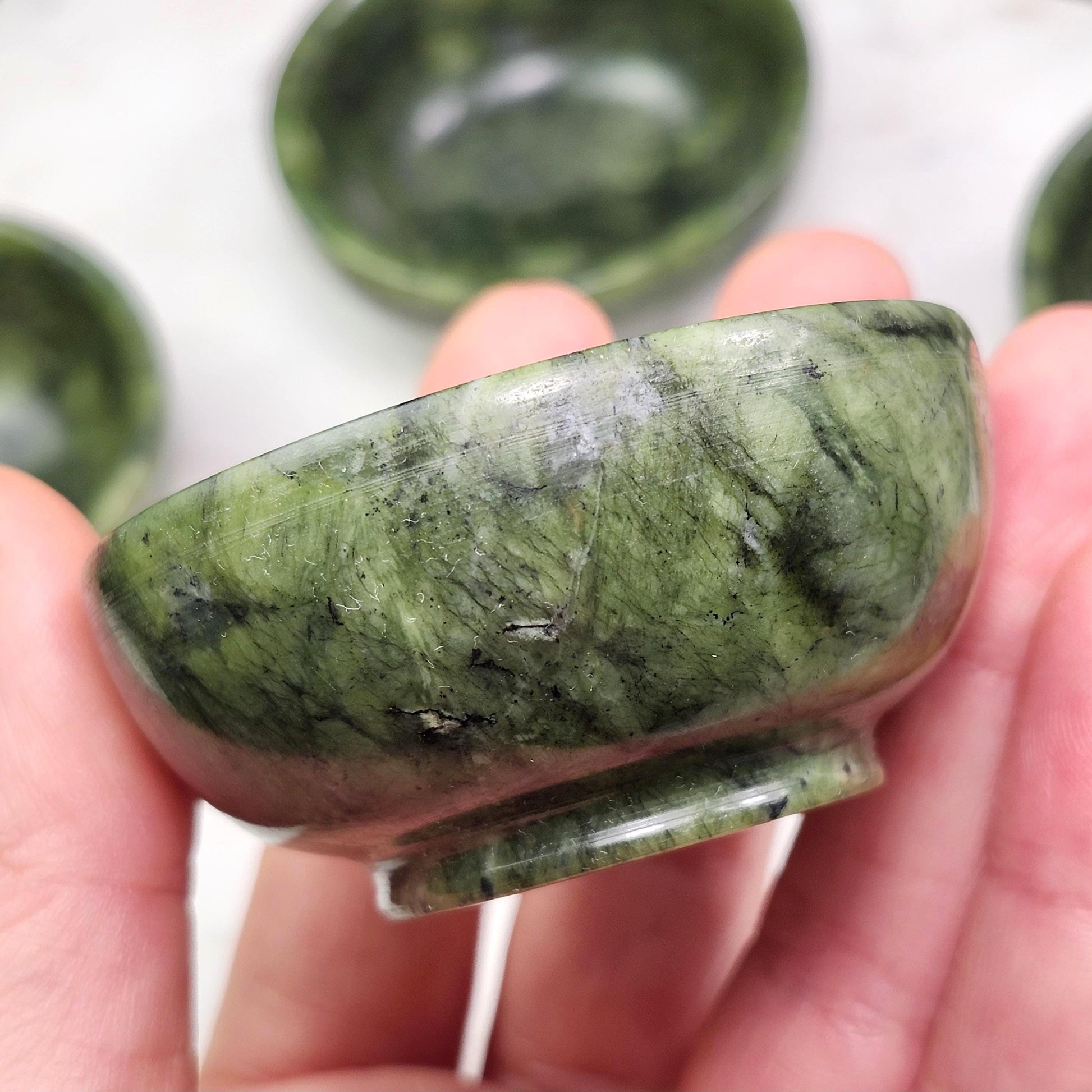 These natural Jade carvings showcase earthy green coloring mottled with black speckles and have a smooth polish. Perfect as a display piece or as functional artwork, these bowls have a flat base that allows them to sit flush and concave sides that accommodate holding small objects. Each specimen measures 2.25 inches across and stands 1 inch tall.