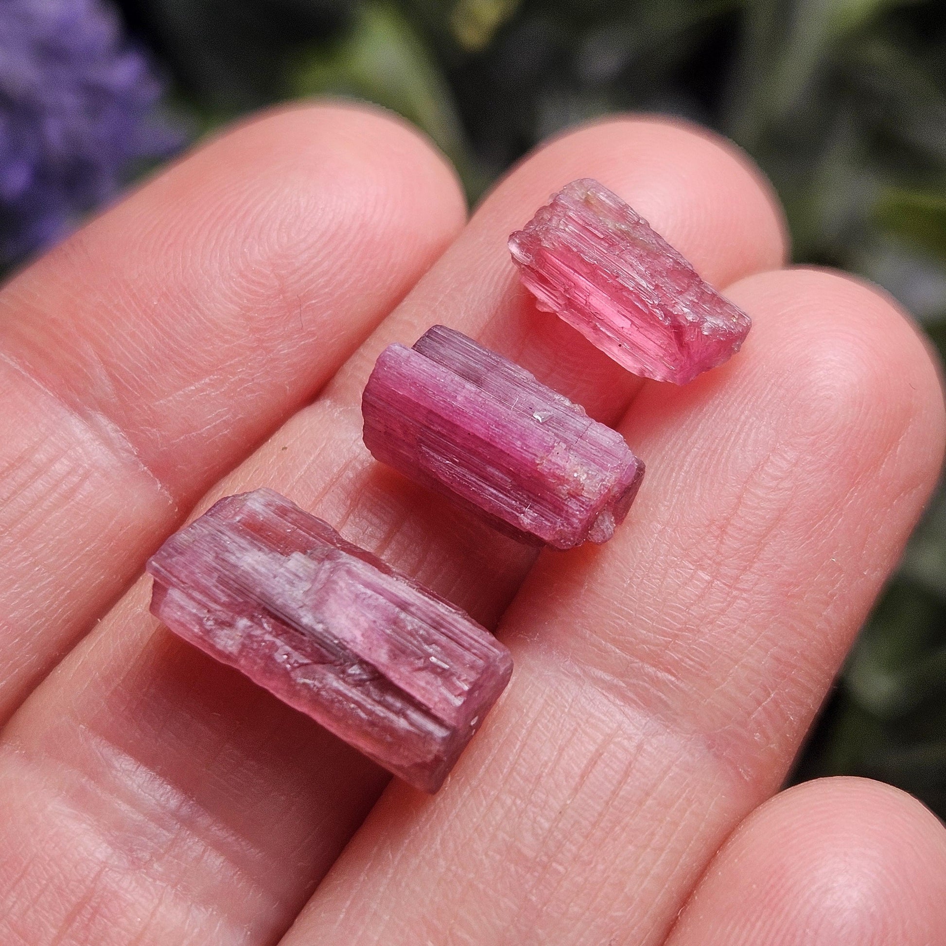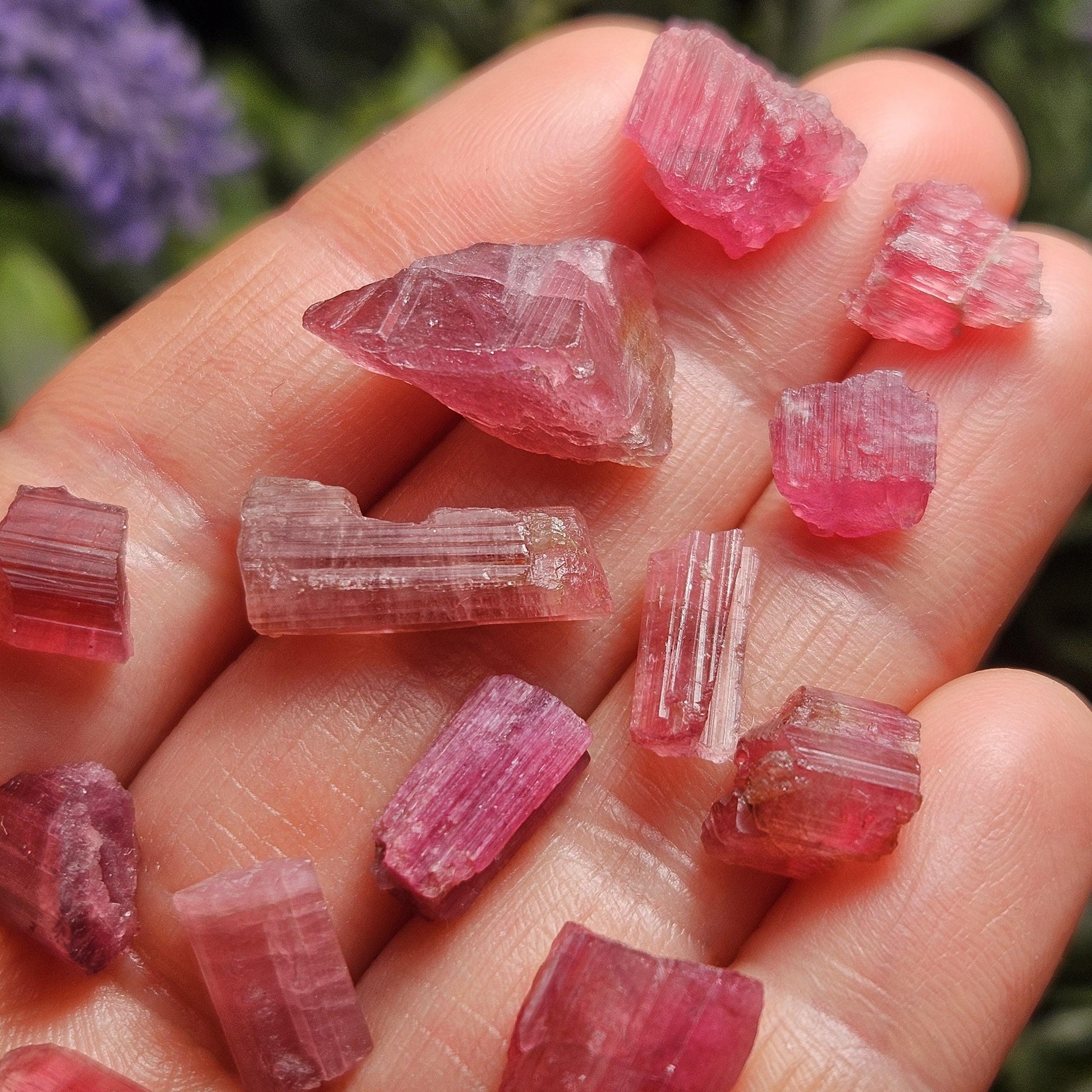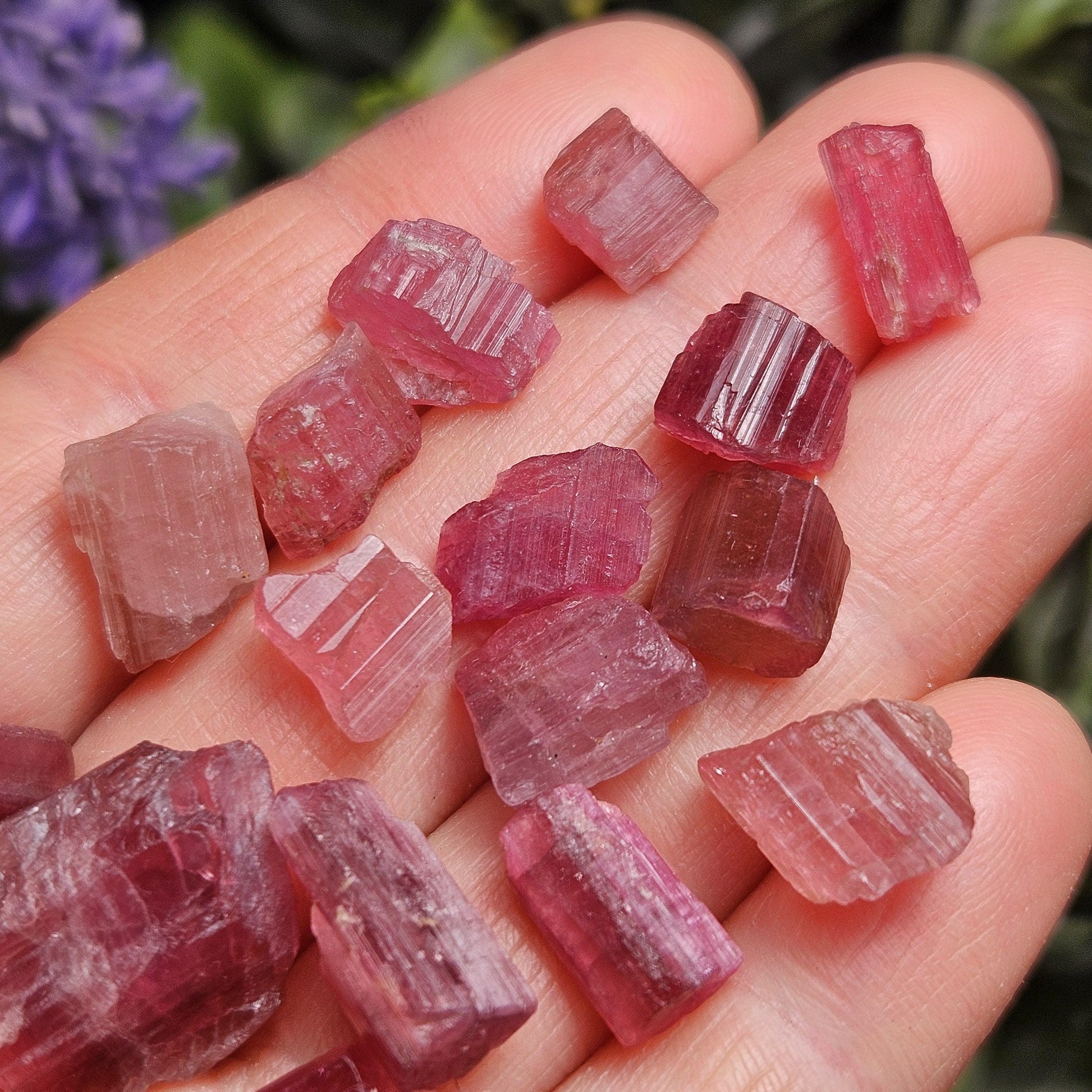 These Brazilian Pink Tourmaline crystals display rich raspberry hues and a glowing natural translucence. Each specimen features distinctly striated faces with pronounced growth lines, a classic characteristic of naturally formed tourmaline. These raw crystals occur in a range of vibrant pink tones and freeform natural shapes, making every specimen unique.