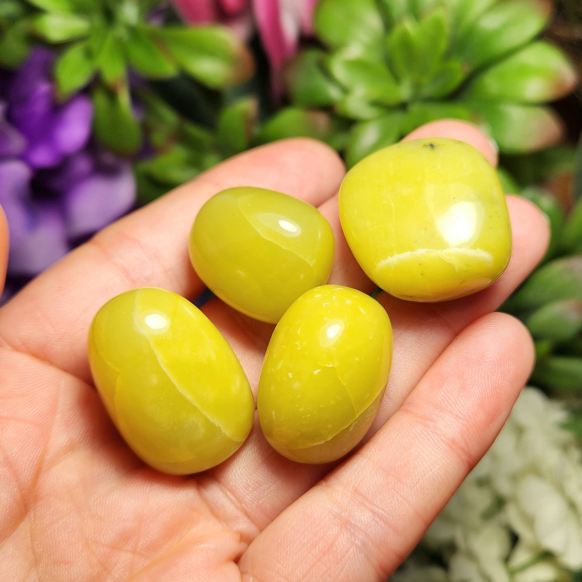 These Nephrite Jade stones display a bright chartreuse-green and have been tumbled to a smooth polish. Their already bright coloring becomes illuminated when backlight due to a slight translucence. Each specimen measures between .75 inches and 1 inch.