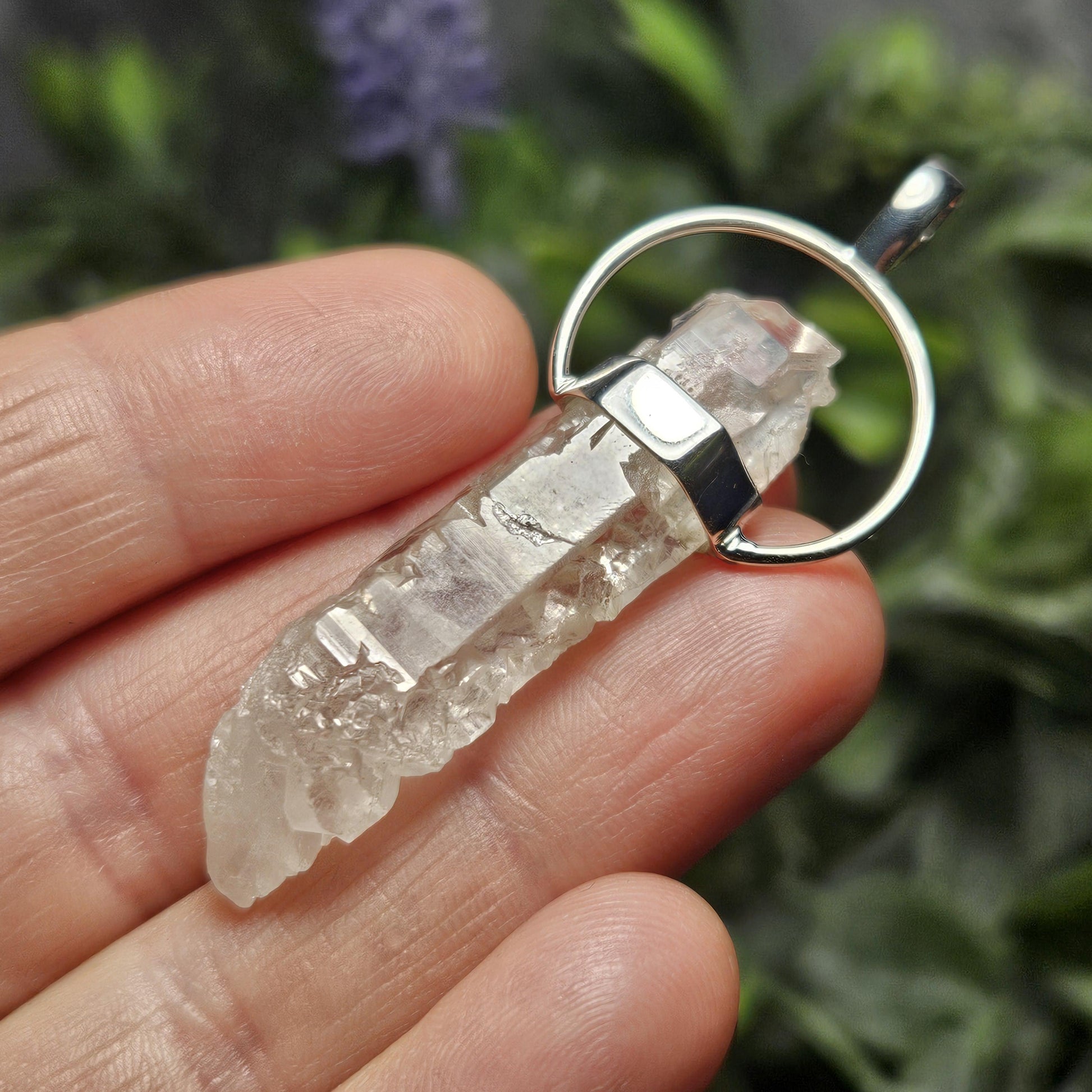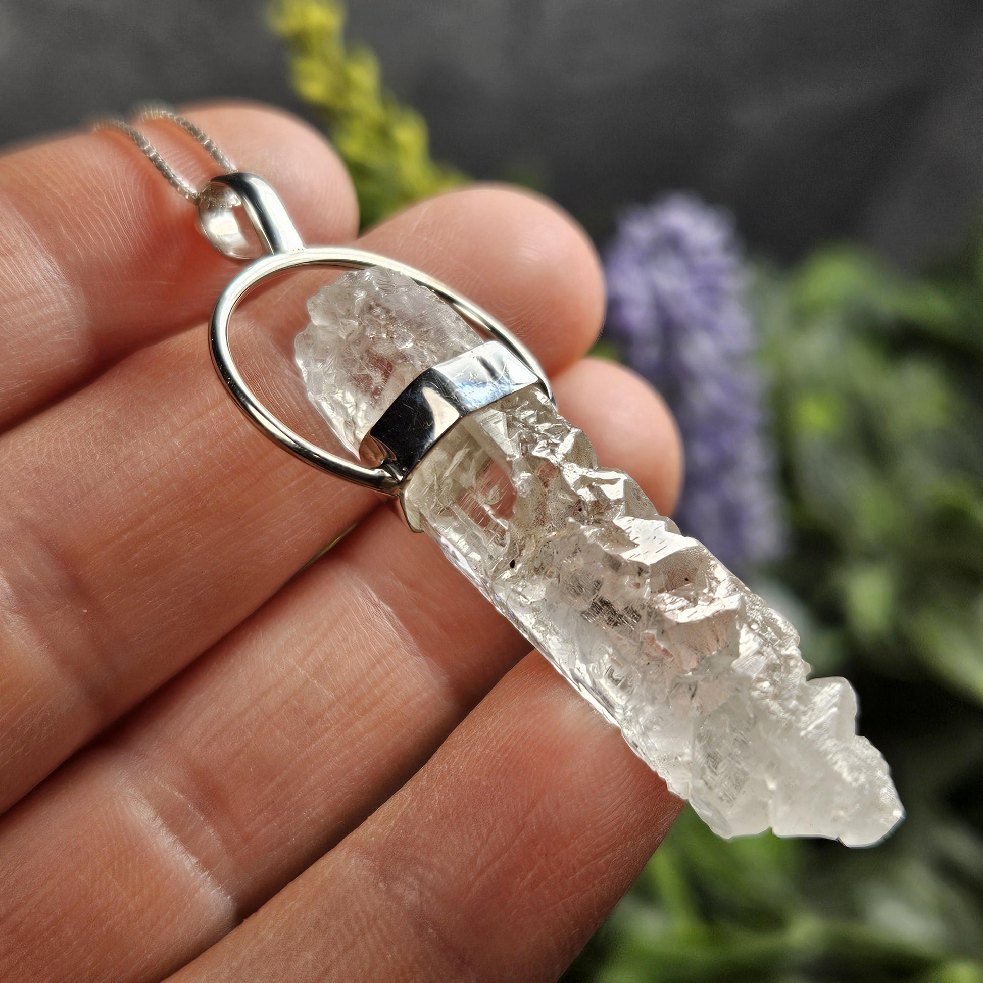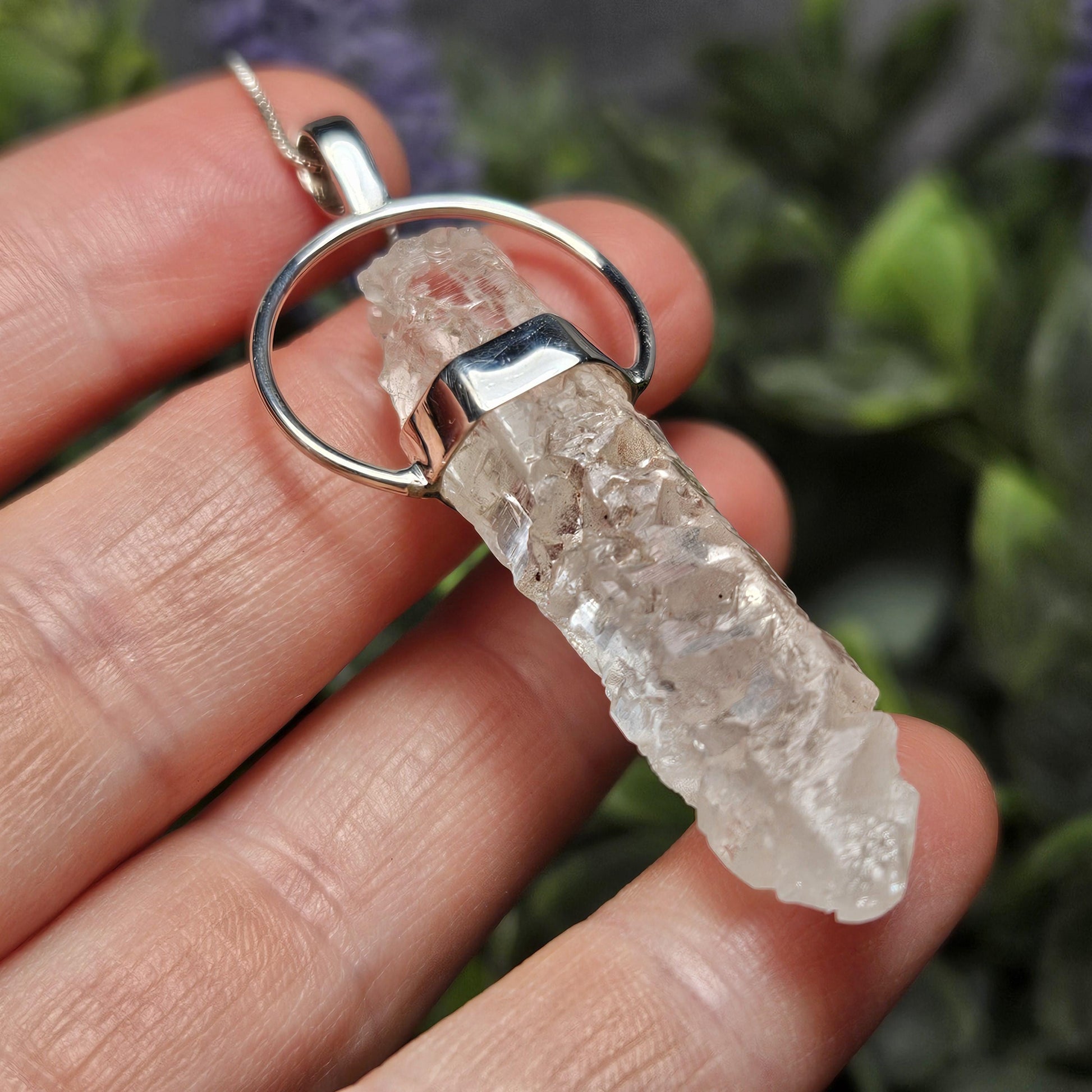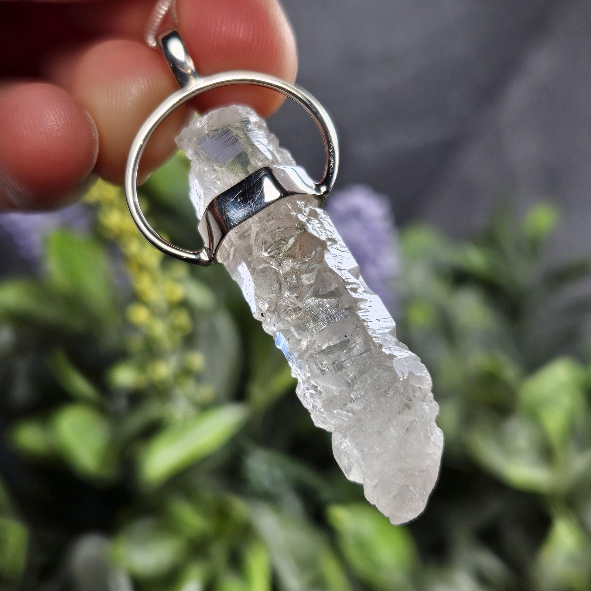 This striking Nirvana Quartz stone has an icy translucence and an intricate, etched surface. This crystal has been custom created into a sturdy piece of jewelry using .925 Sterling Silver. This pendant measures approximately 55mm by 20mm. The silver chain used in the photos is to help envision how this pendant will look while adorned but is not included in the listing.