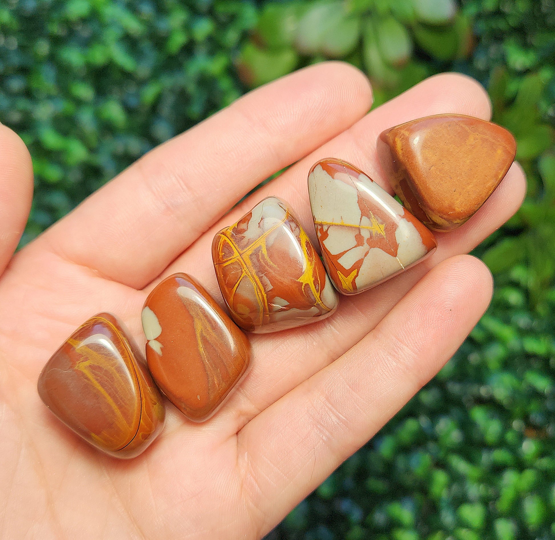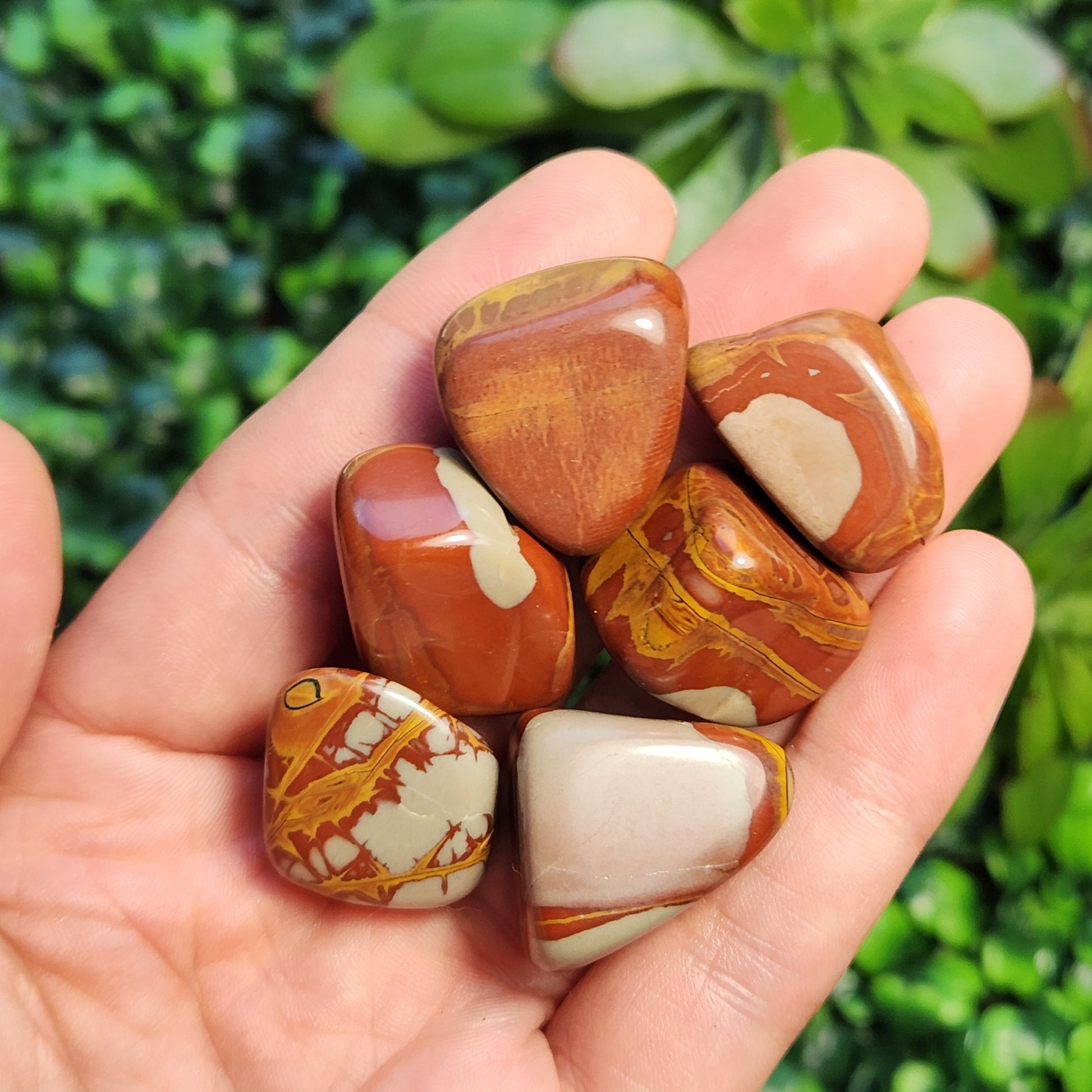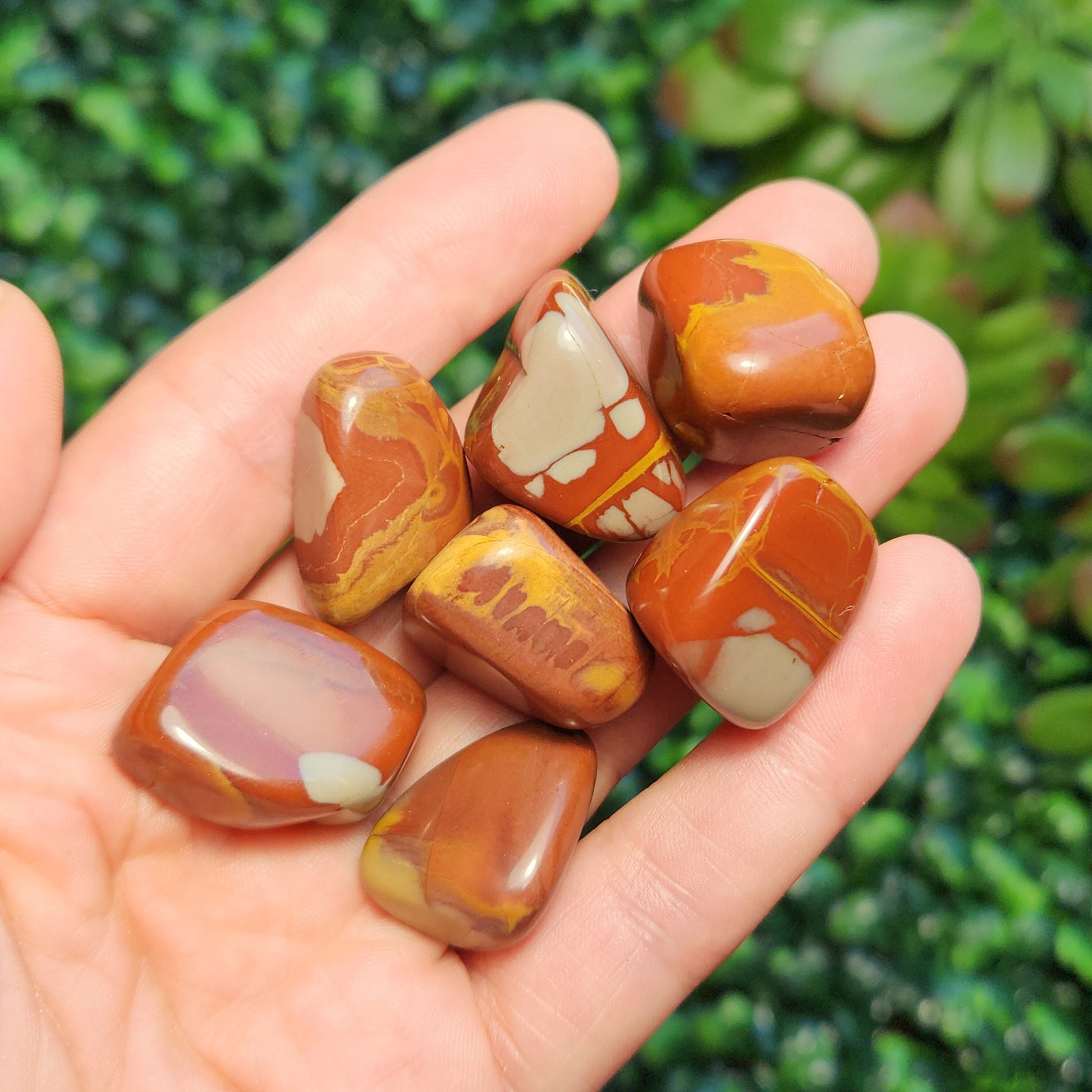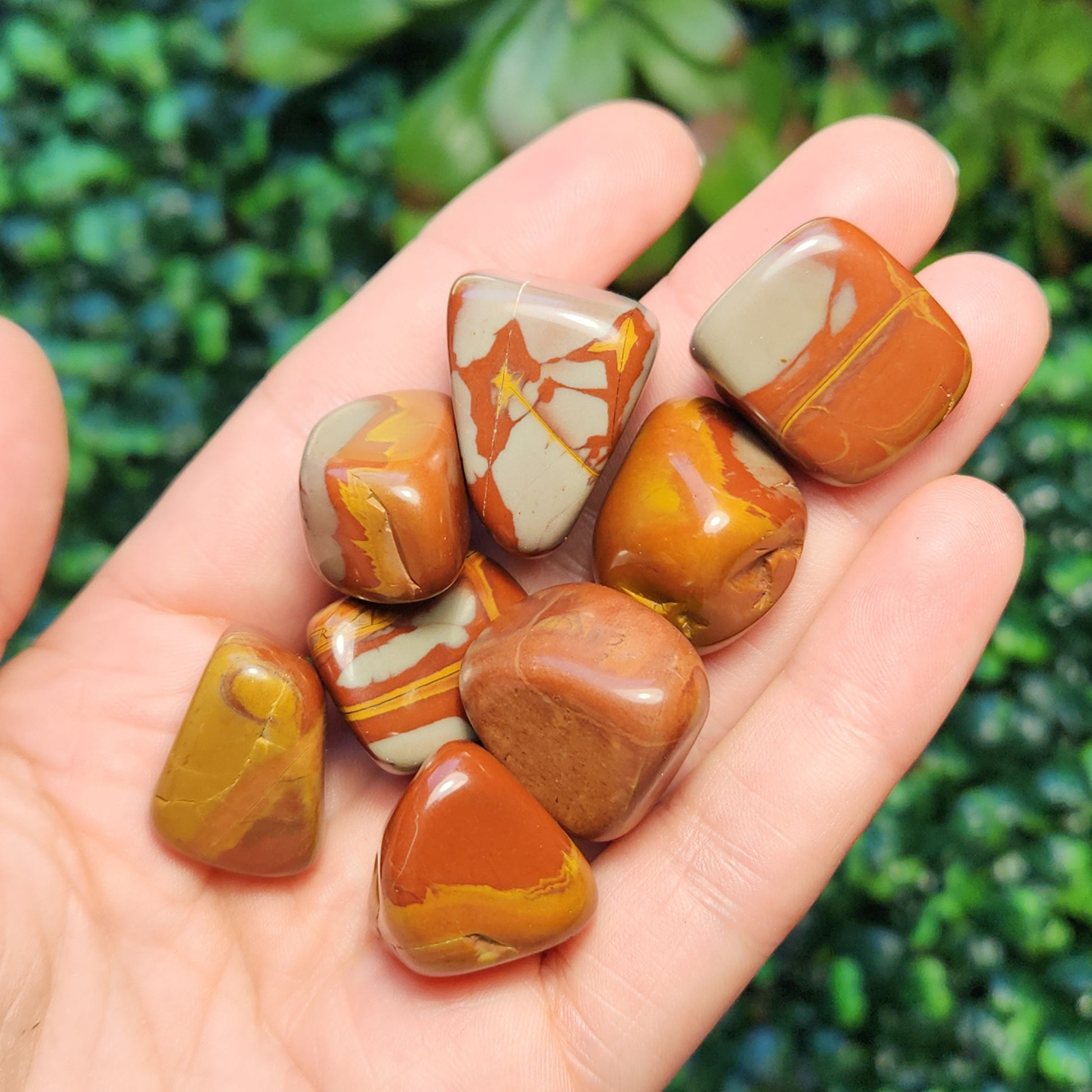 These Noreena Jasper stones have been tumbled to a smooth polish. They exhibit brick red coloring with possible grey or yellow patterns, each with its own unique look. Each specimen measures approximately 15 to 25 millimeters in size.