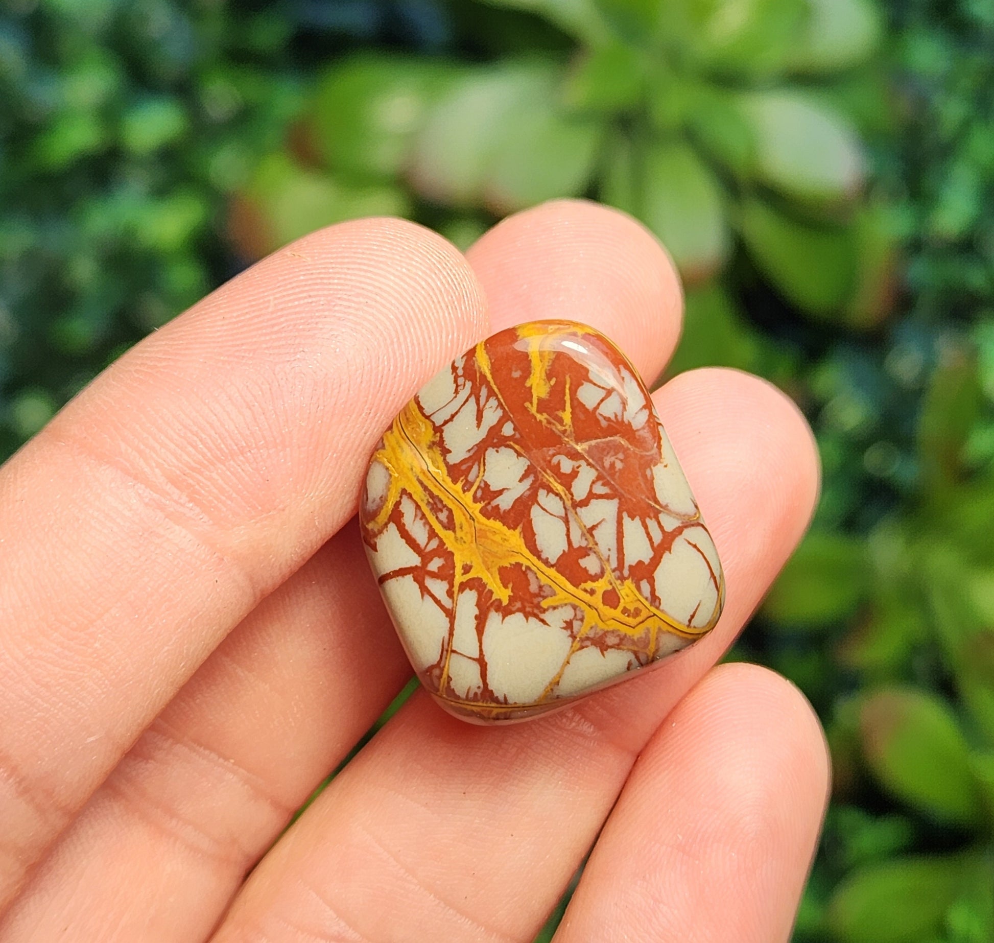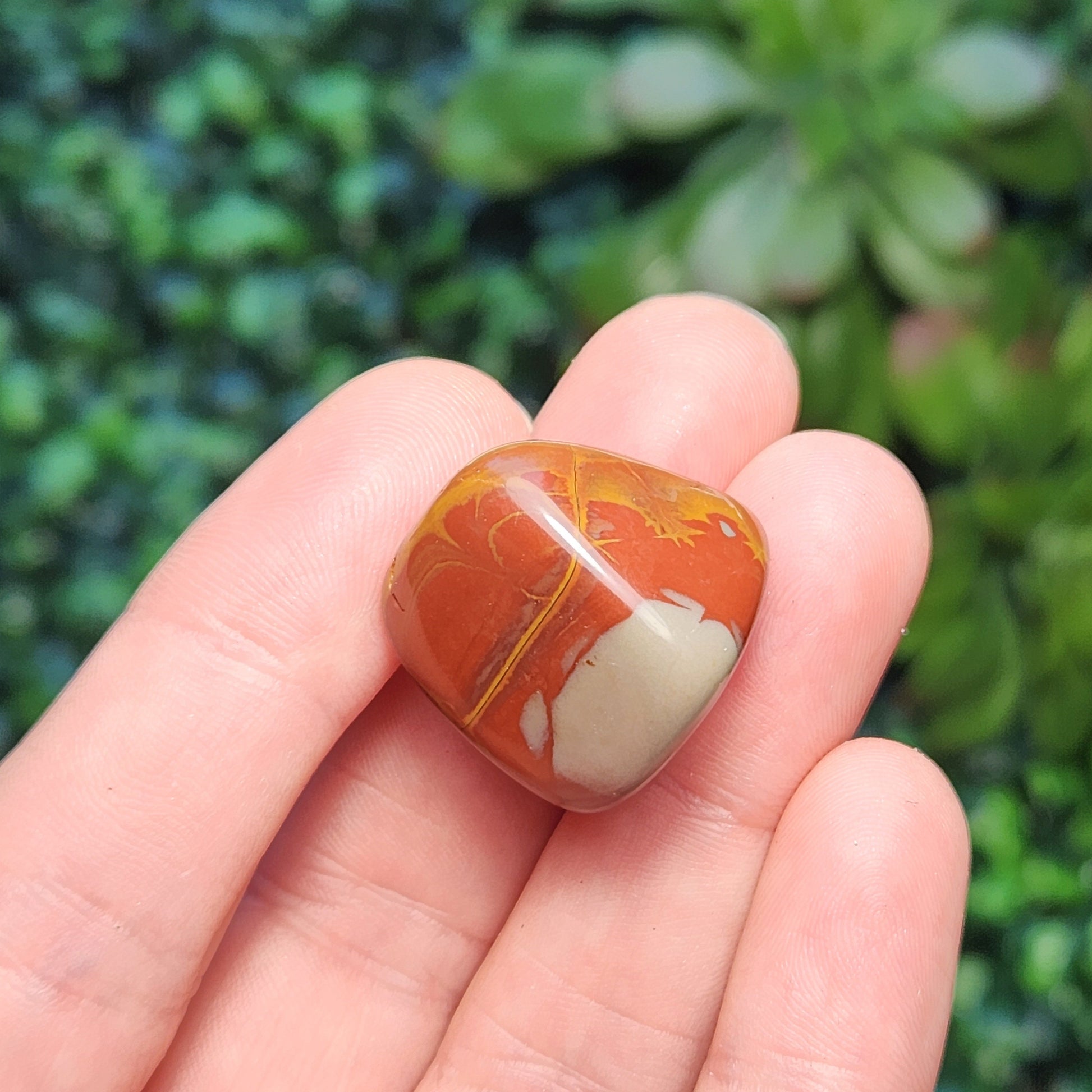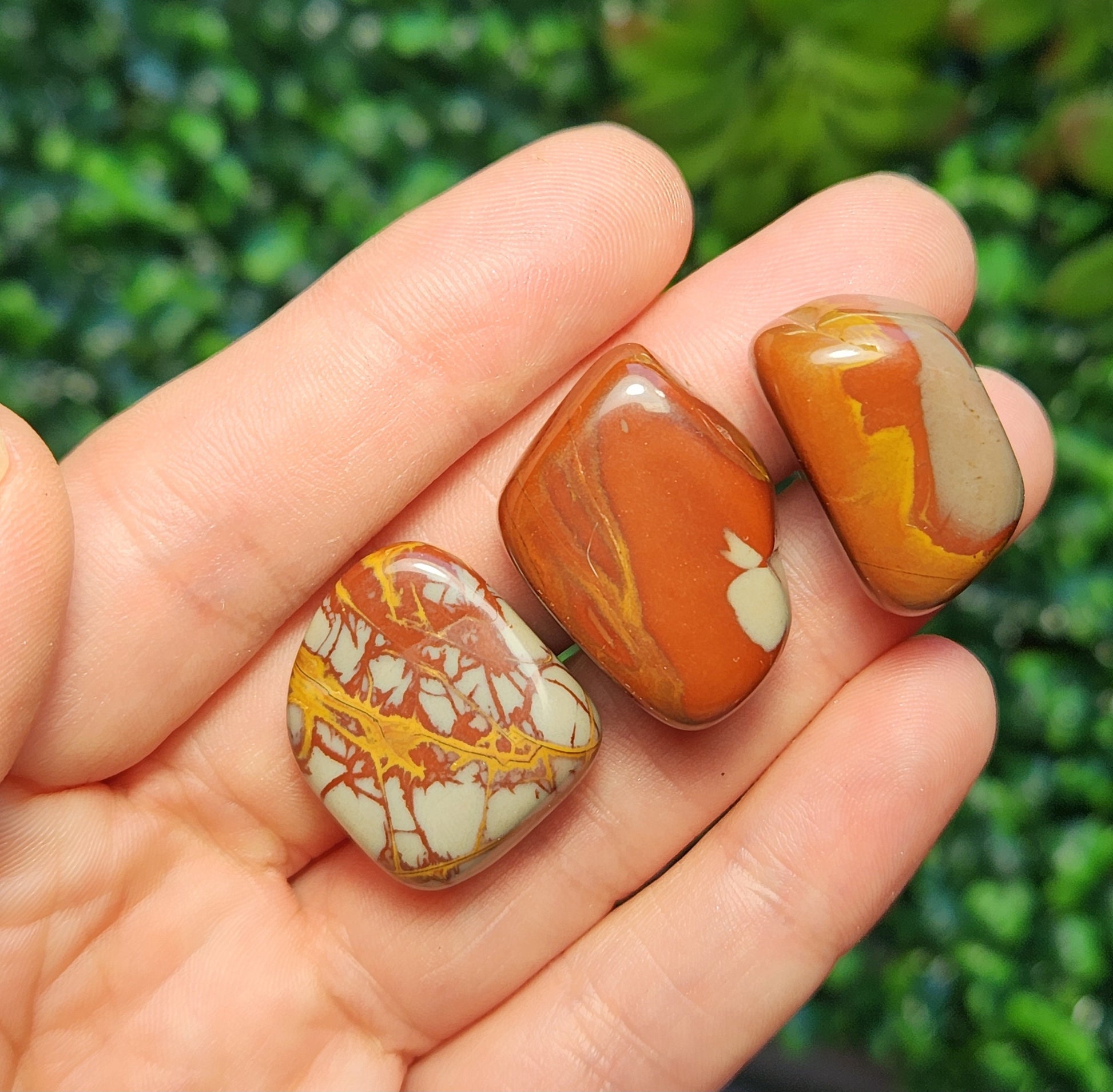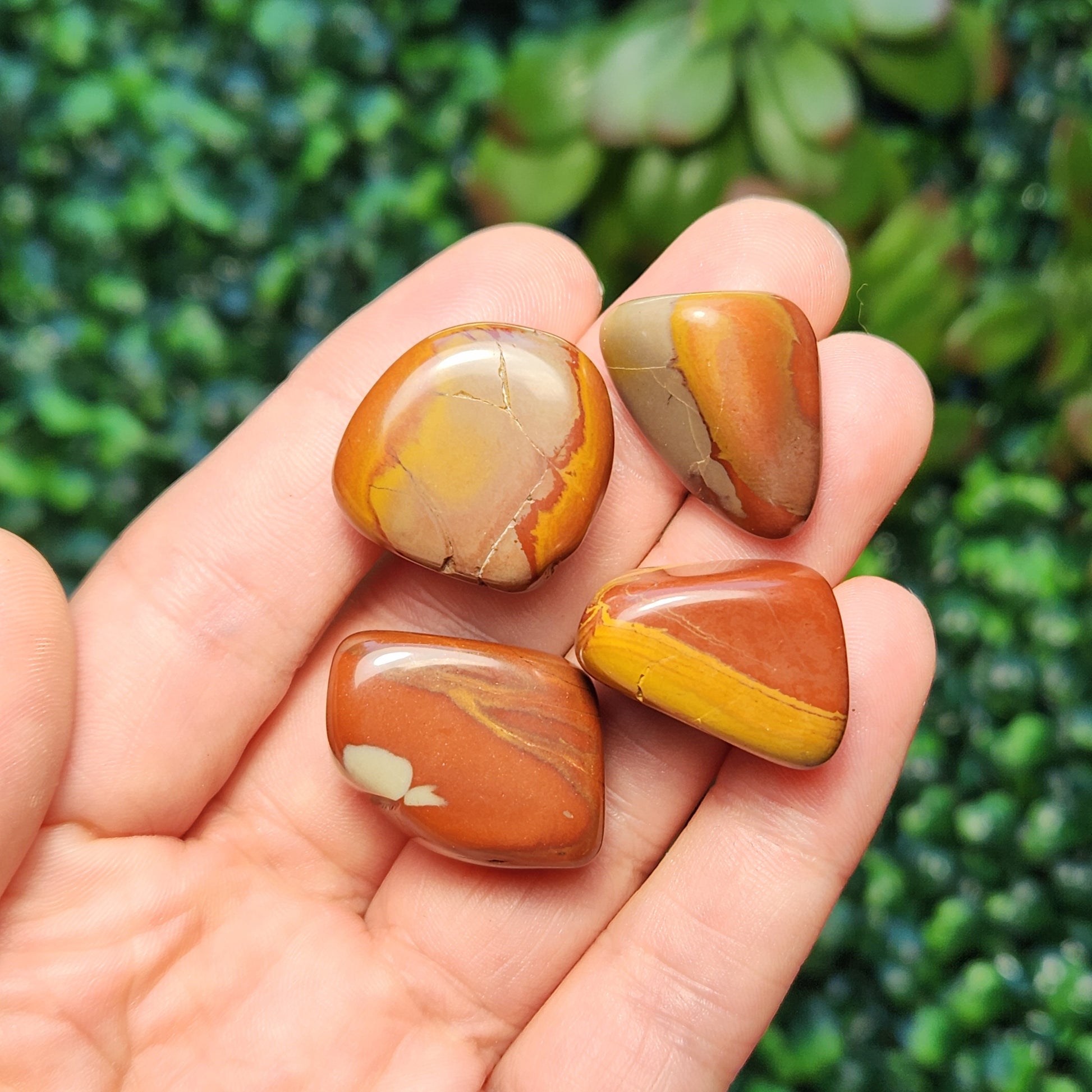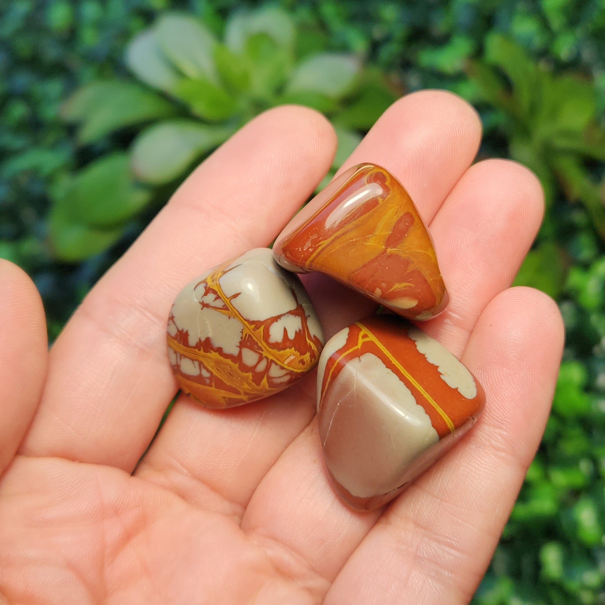 These Noreena Jasper stones have been tumbled to a smooth polish. They exhibit brick red coloring with possible grey or yellow patterns, each with its own unique look. Each specimen measures approximately 15 to 25 millimeters in size.