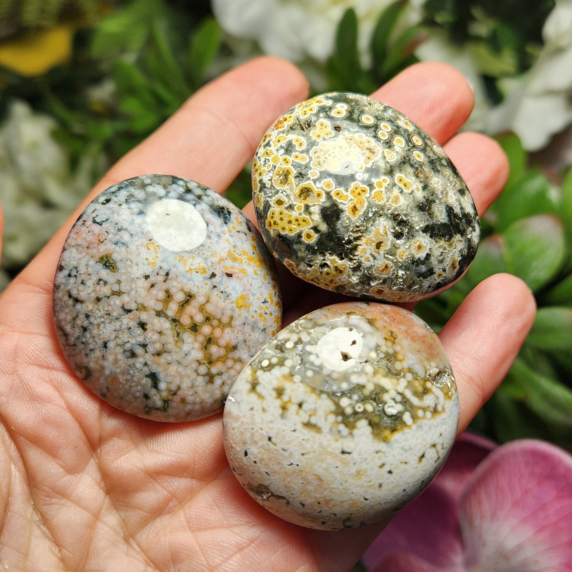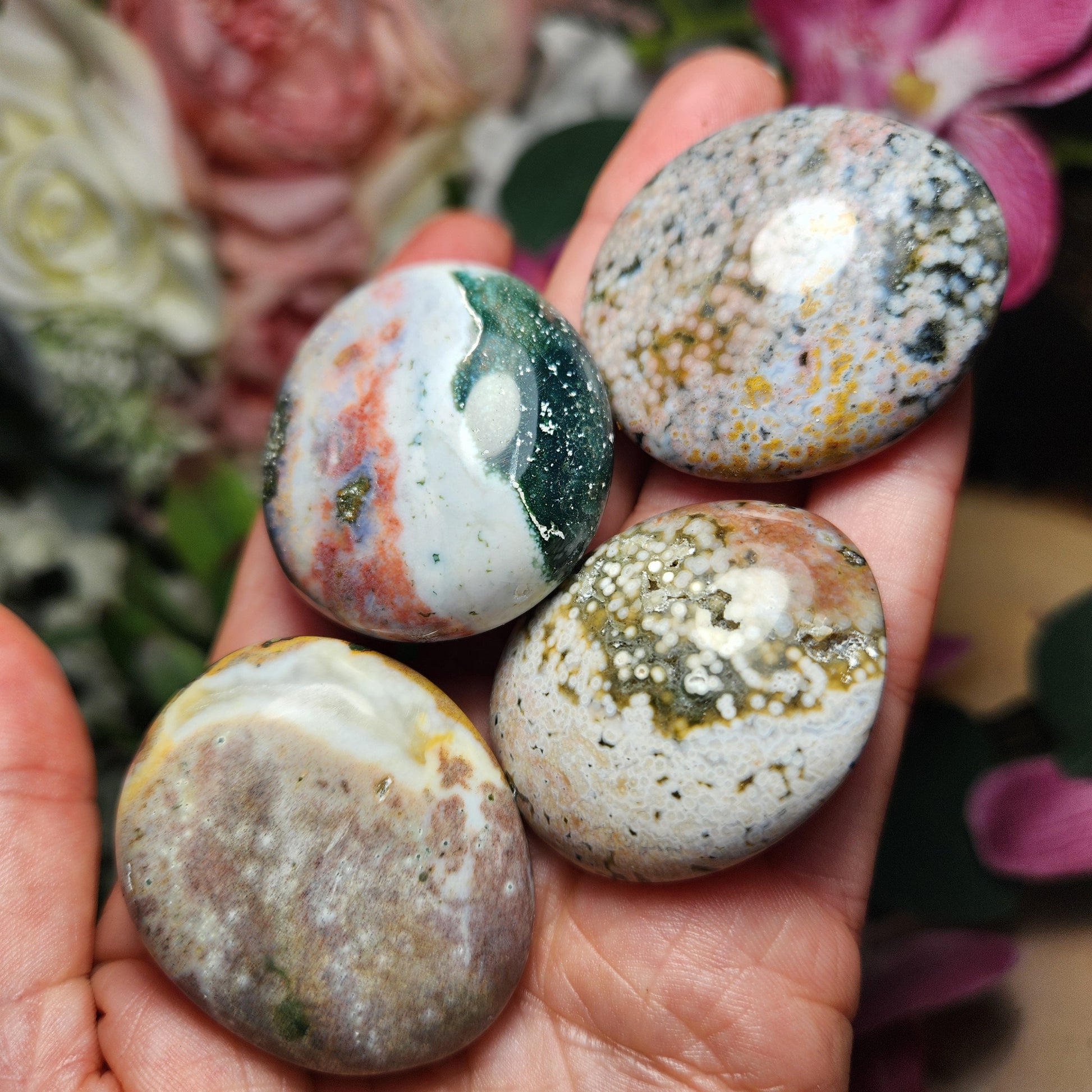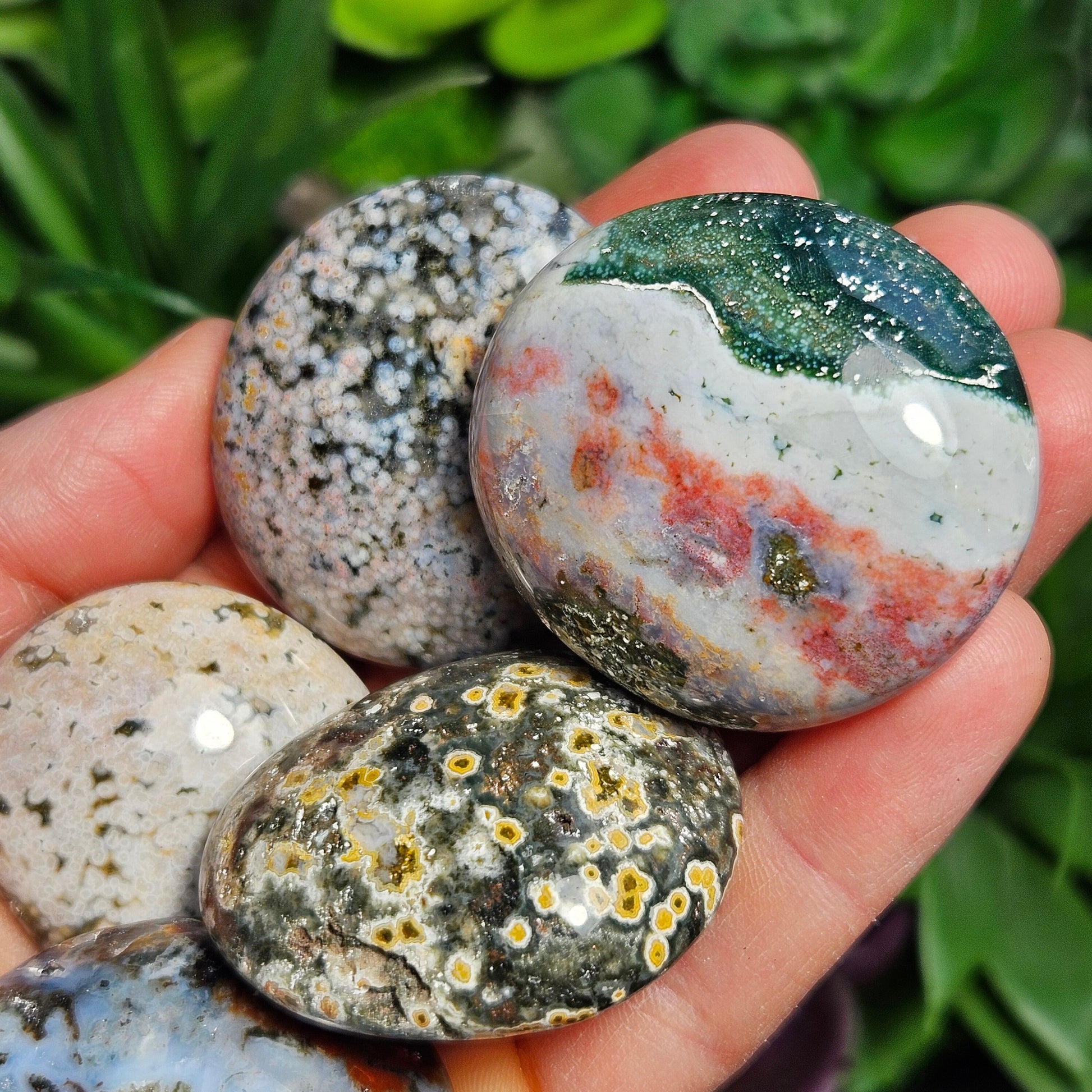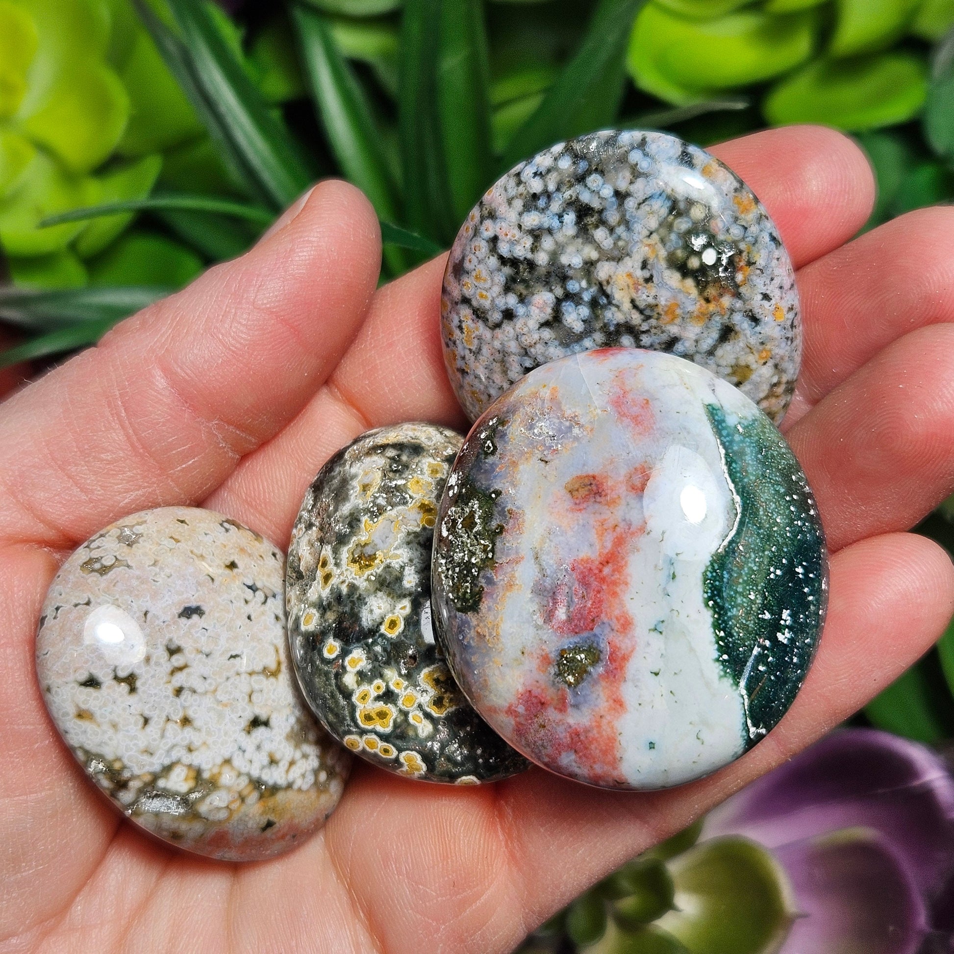 Ocean Jasper are pieces of fossilized coral, you can even see the little circles where the coral used to be! These Ocean Jasper stones have rounded shapes and a smooth polish. They exhibit a wide variety of colors, each with their own unique pattern. This material ranges from completely opaque to having a muddy translucence. Each specimen measures approximately 1.5 inches.