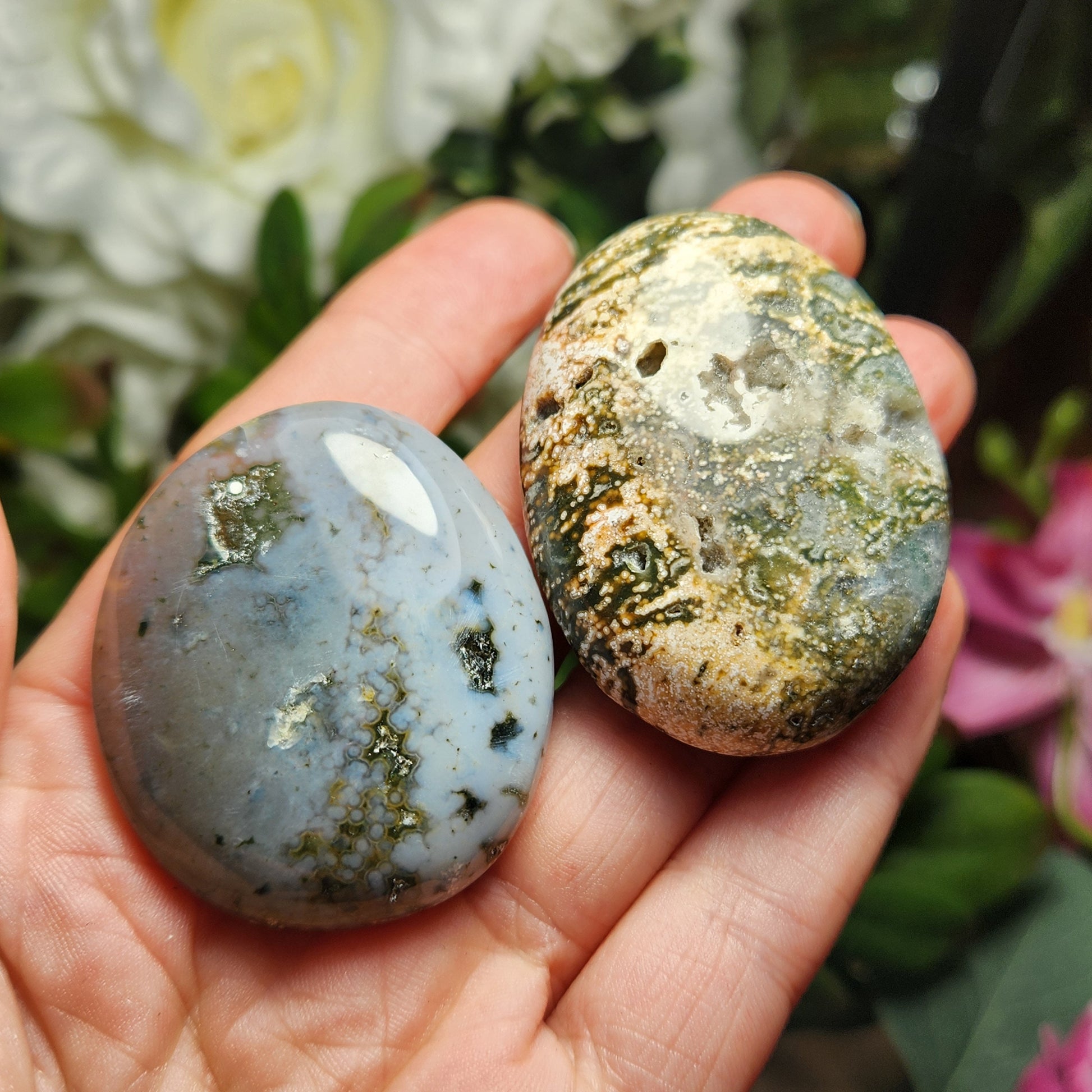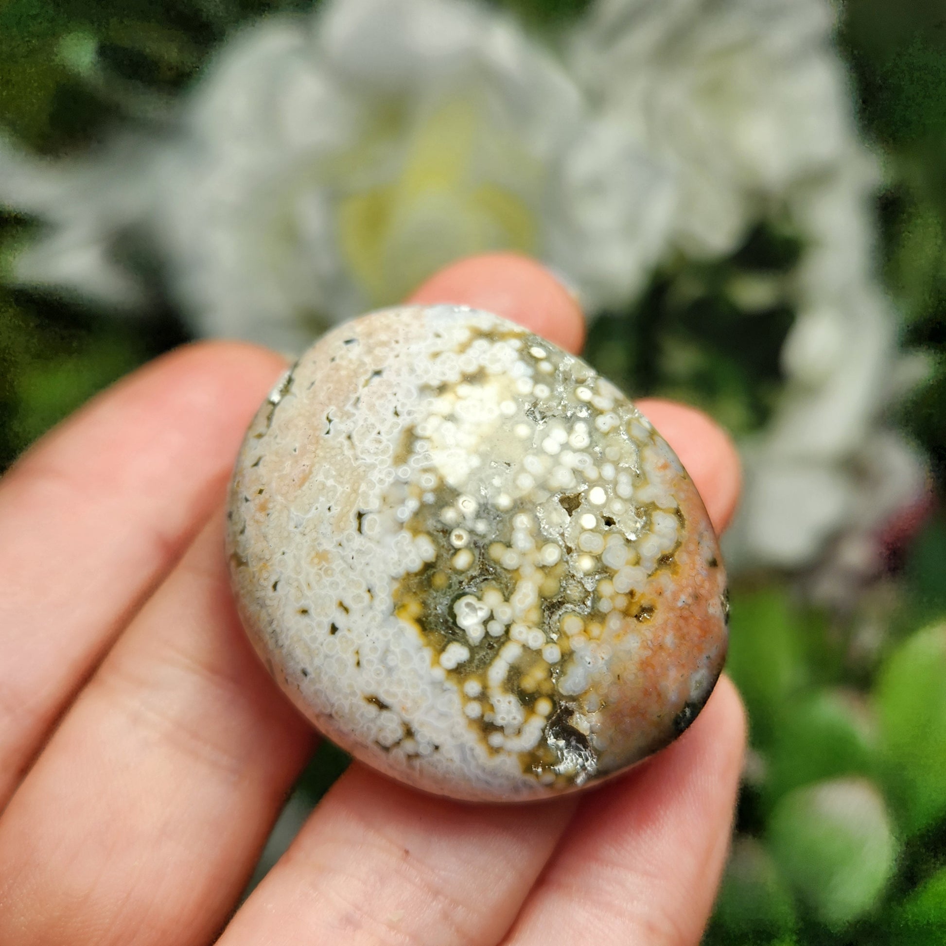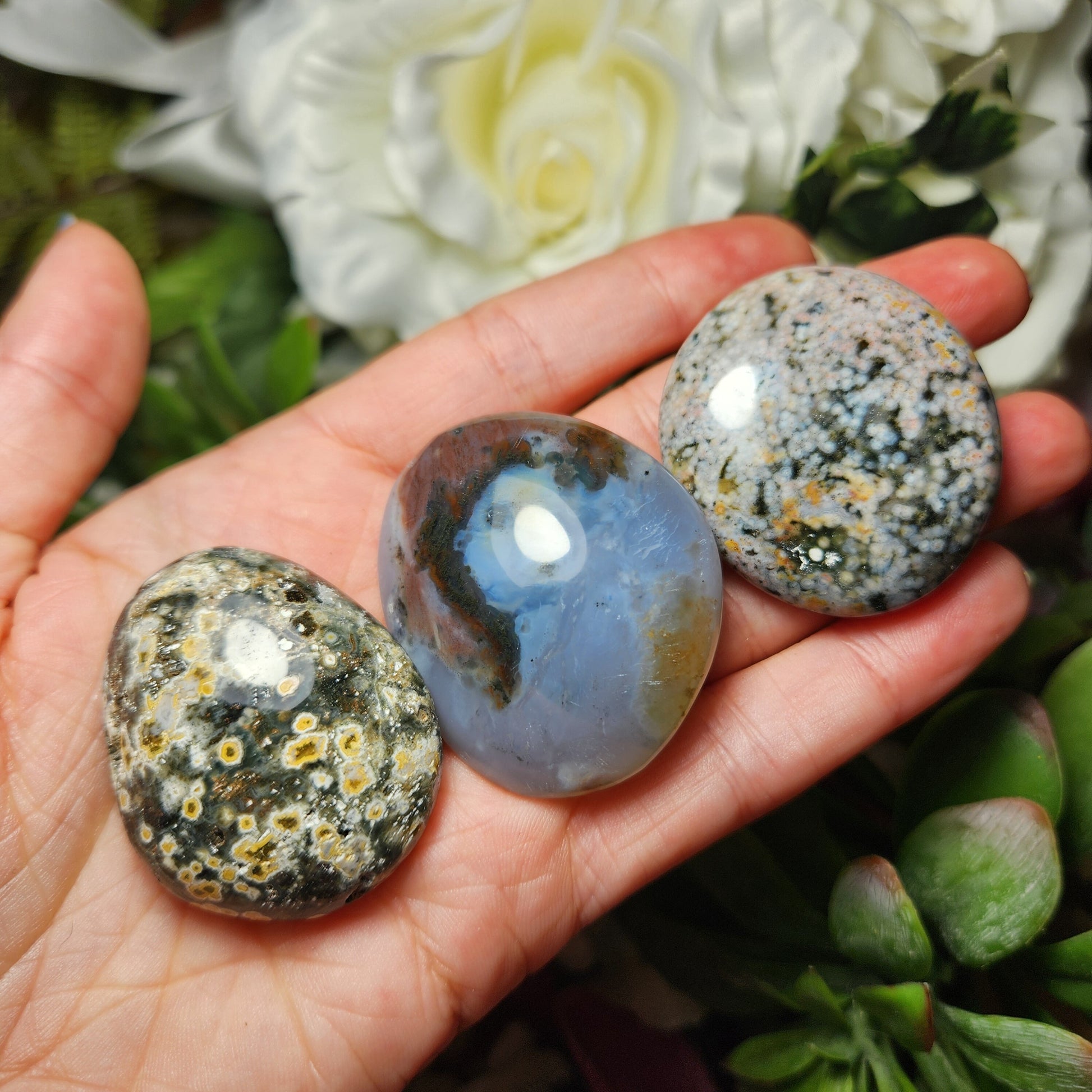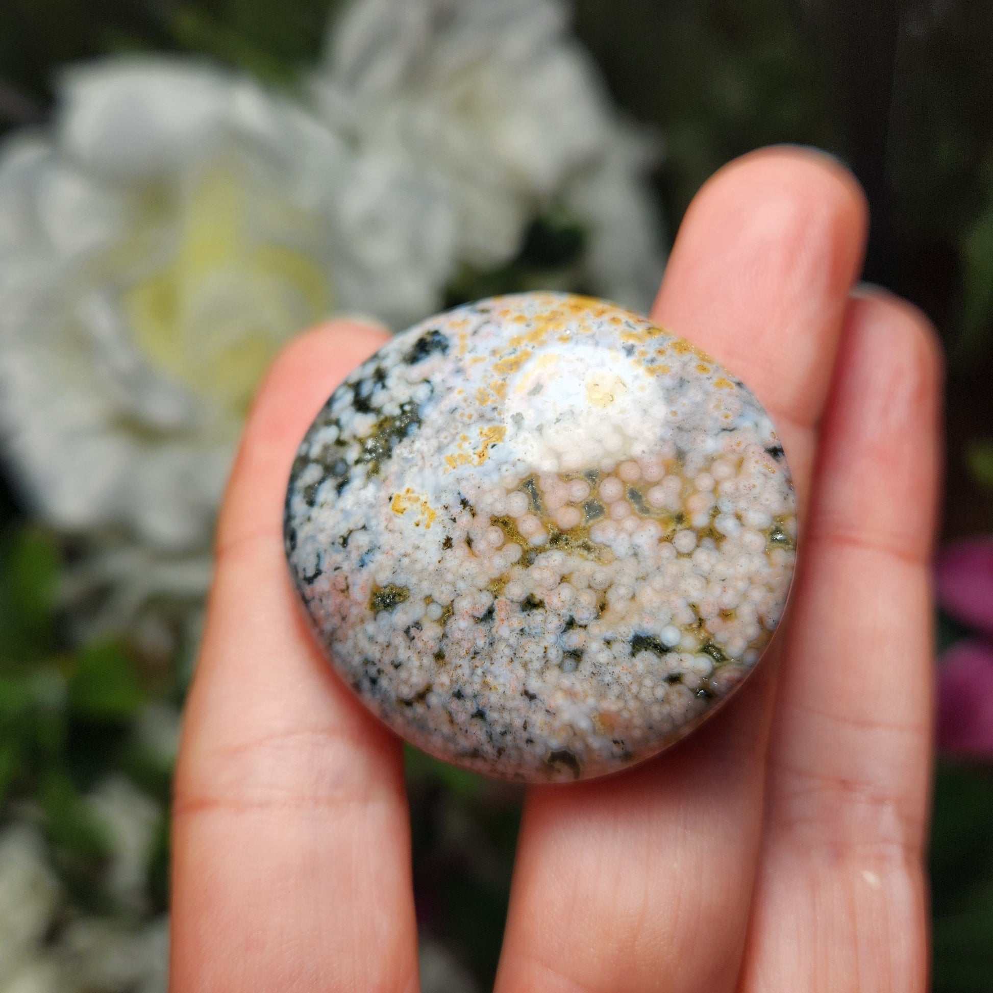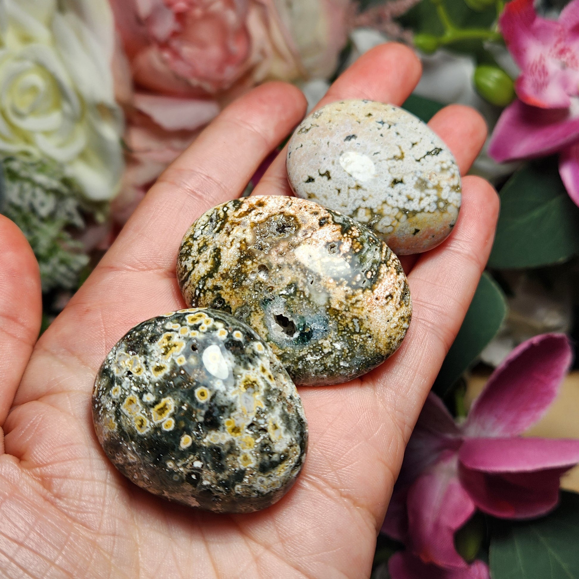 Ocean Jasper are pieces of fossilized coral, you can even see the little circles where the coral used to be! These Ocean Jasper stones have rounded shapes and a smooth polish. They exhibit a wide variety of colors, each with their own unique pattern. This material ranges from completely opaque to having a muddy translucence. Each specimen measures approximately 1.5 inches.