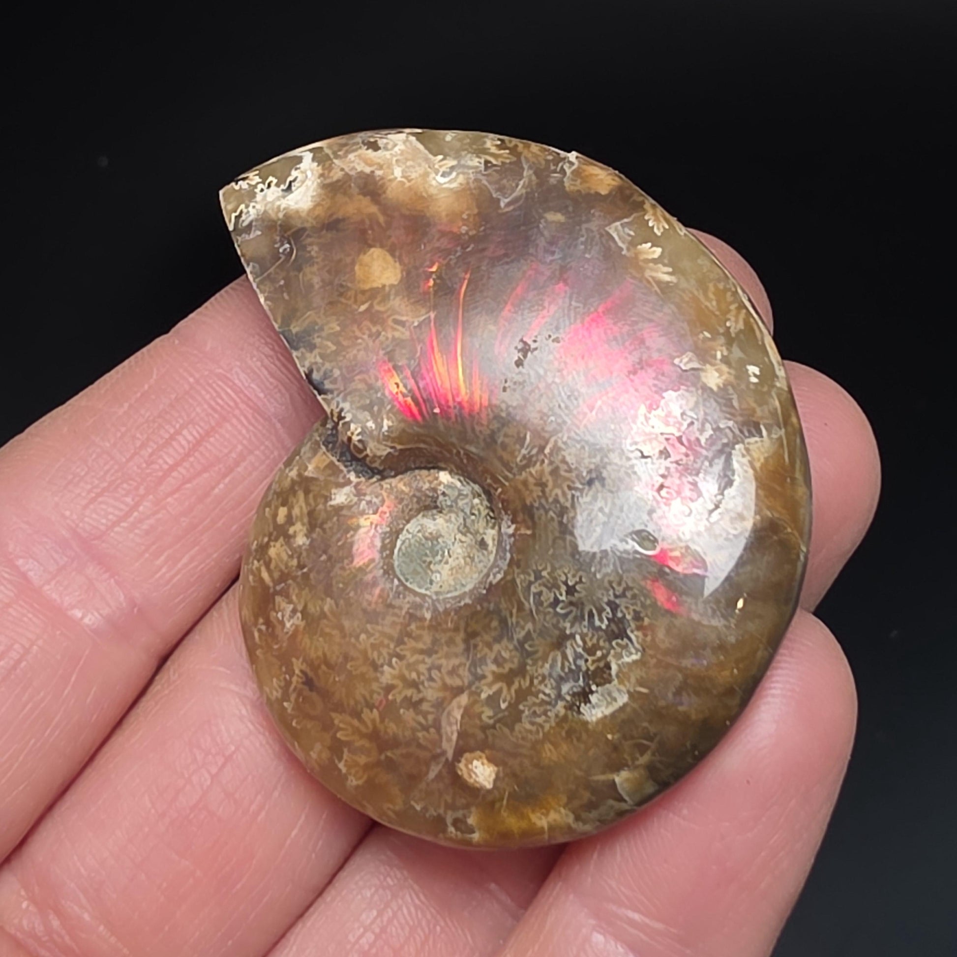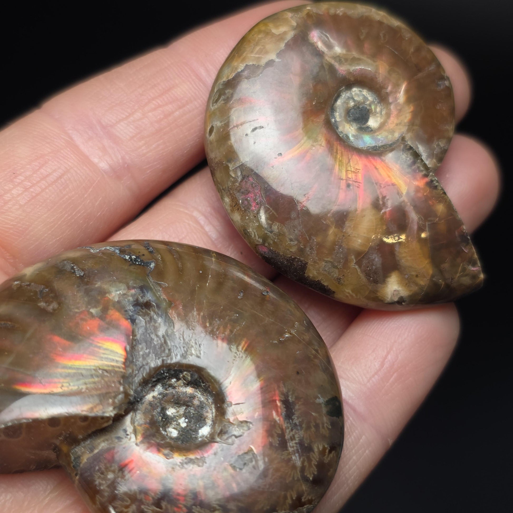 A beautiful example of the Fibonacci spiral exhibiting itself in nature, the Ammonite is a shelled nautilus that was part of a now extinct group of invertebrate marine animals. These Ammonite specimens from Madagascar each exhibit areas of red iridescent opalized sheen. This natural opalization is a rare effect that is sometimes a part of these ancient fossils. You can expect that these Ammonite fossils may have chips or abrasions interspersed with polish and color, a normal characteristic of these natural specimens. These are each unique and require movement under lighting to show off their opalized flare! Measurements are taken from the longest points. Choose the size you prefer from the menu above.