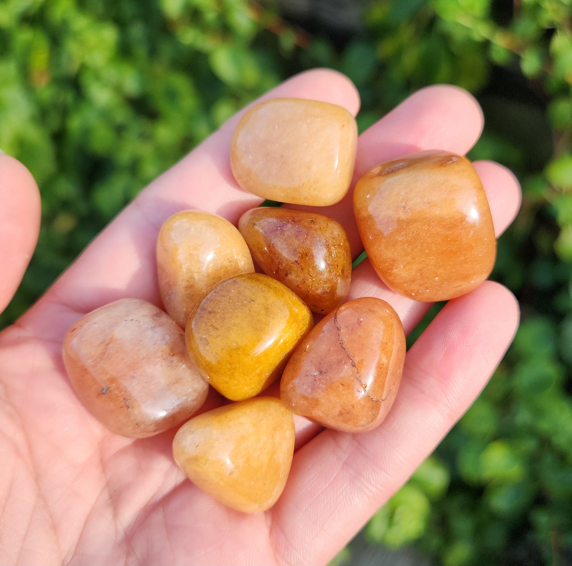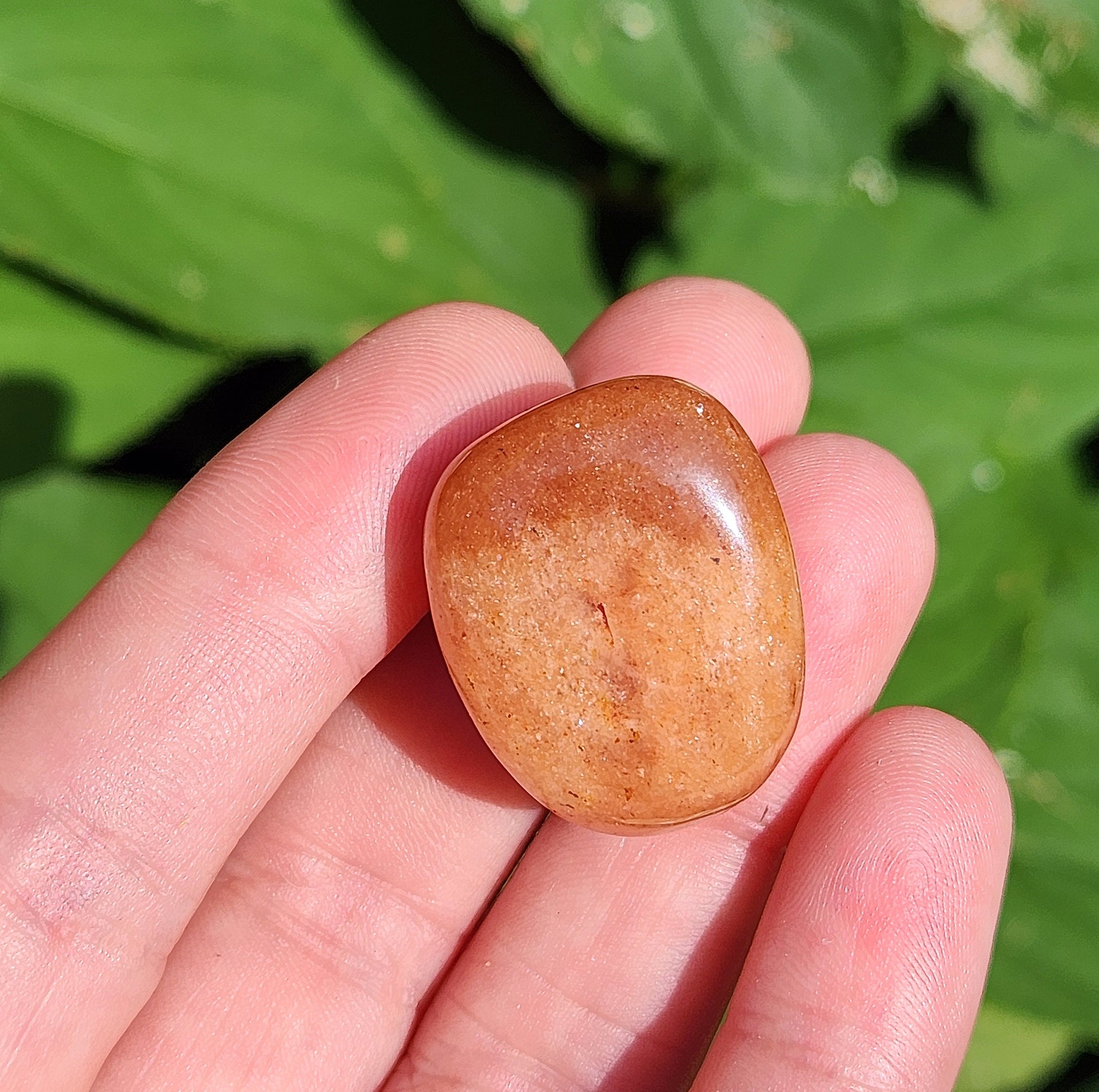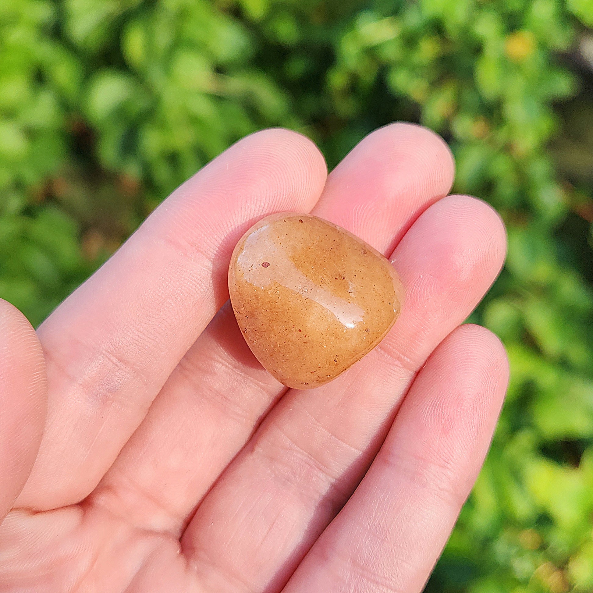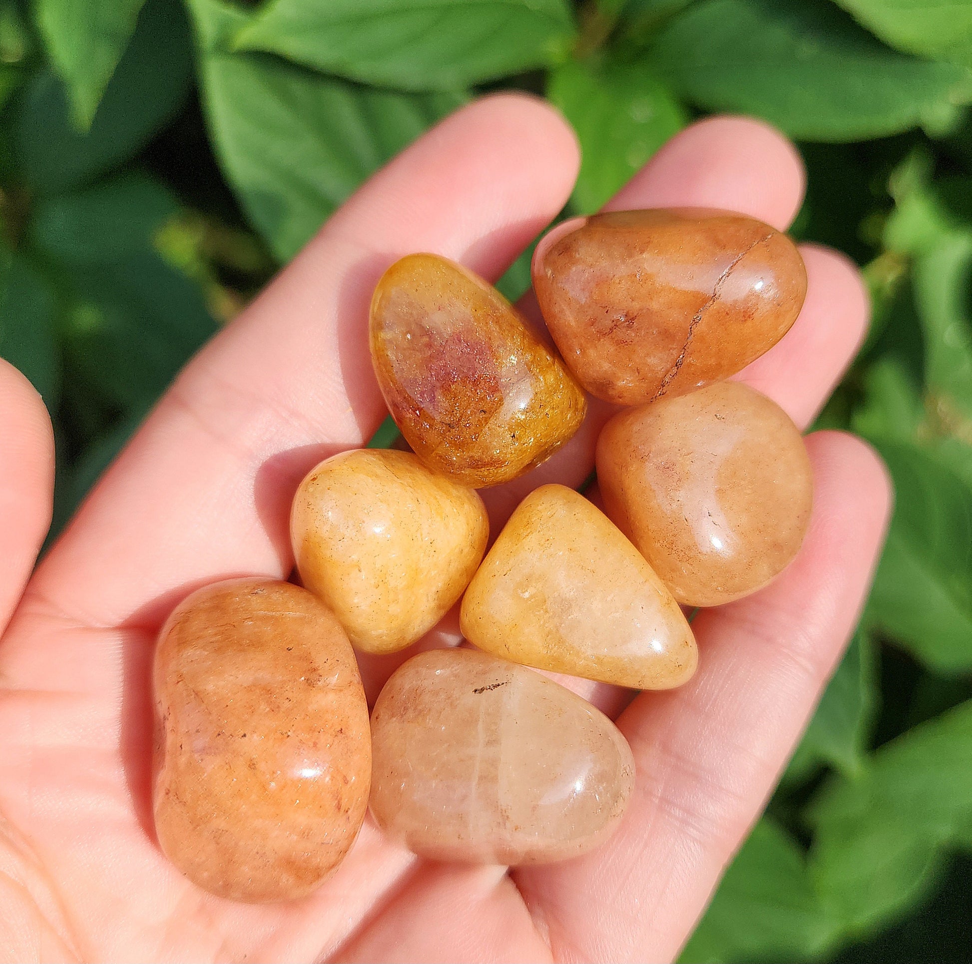 These Orange Aventurine stones have been tumbled to a smooth polish. They display a range of honey and peach tones, ranging from completely opaque to slightly translucent. Each specimen measures approximately .75 inches.