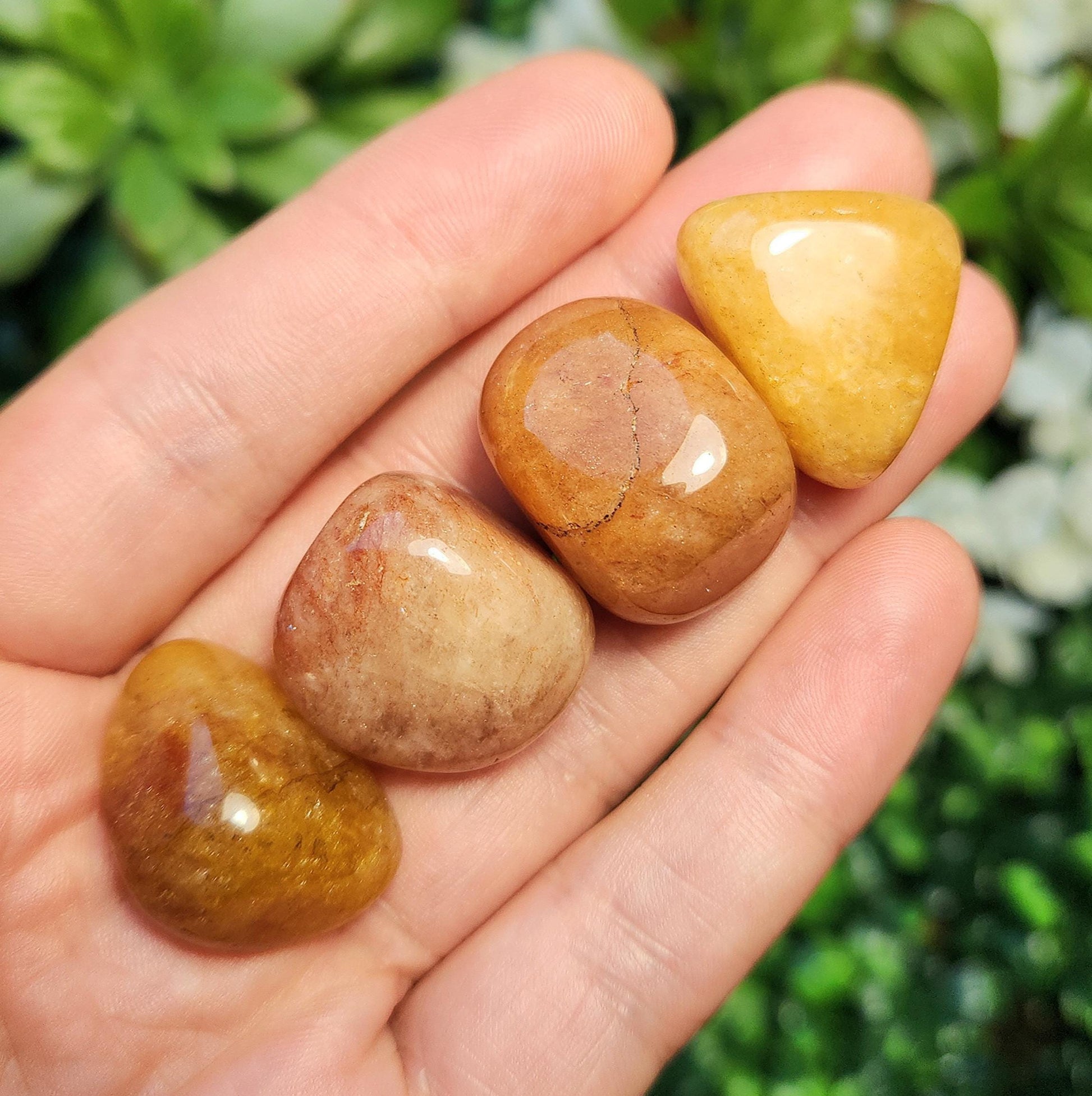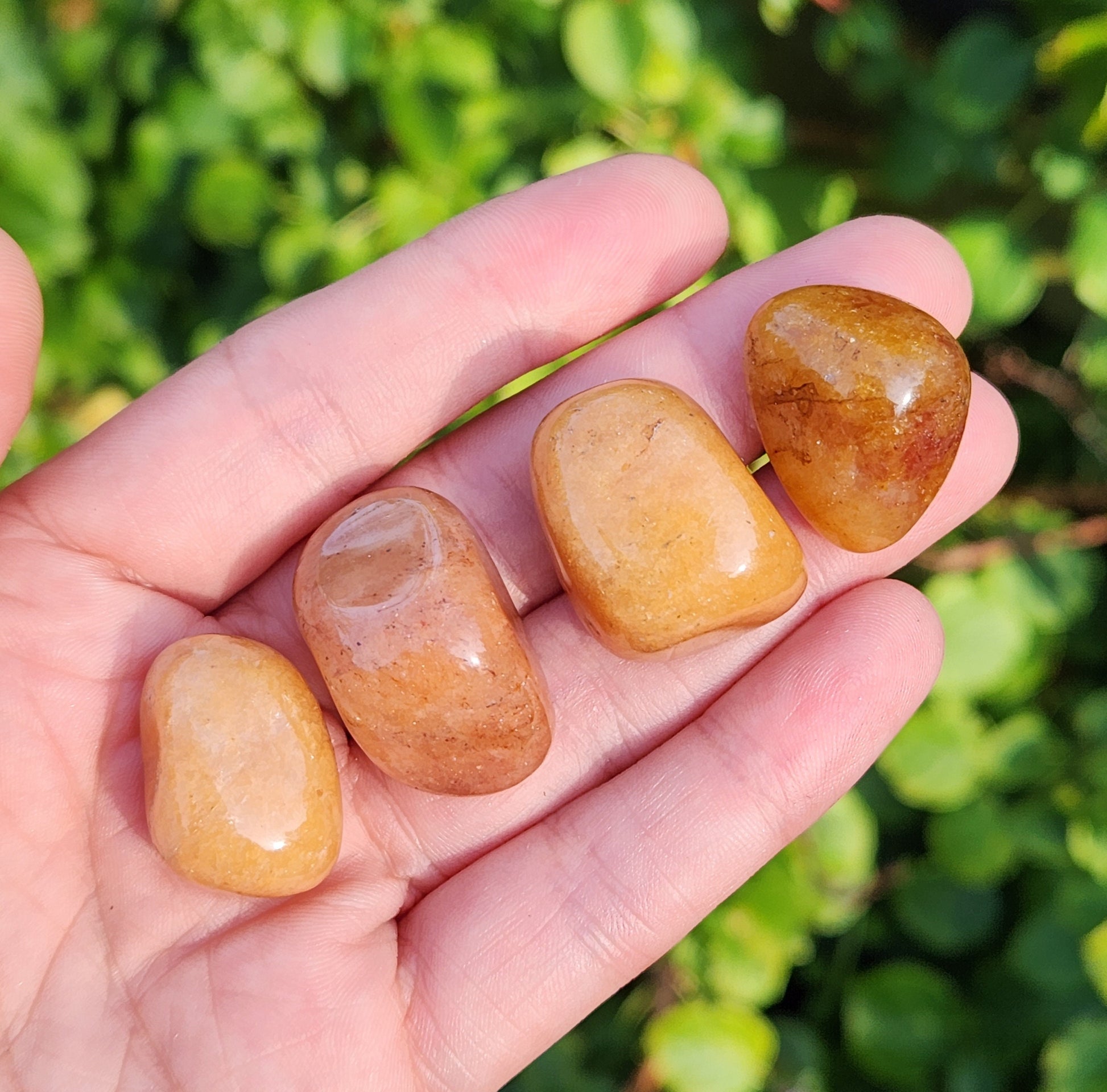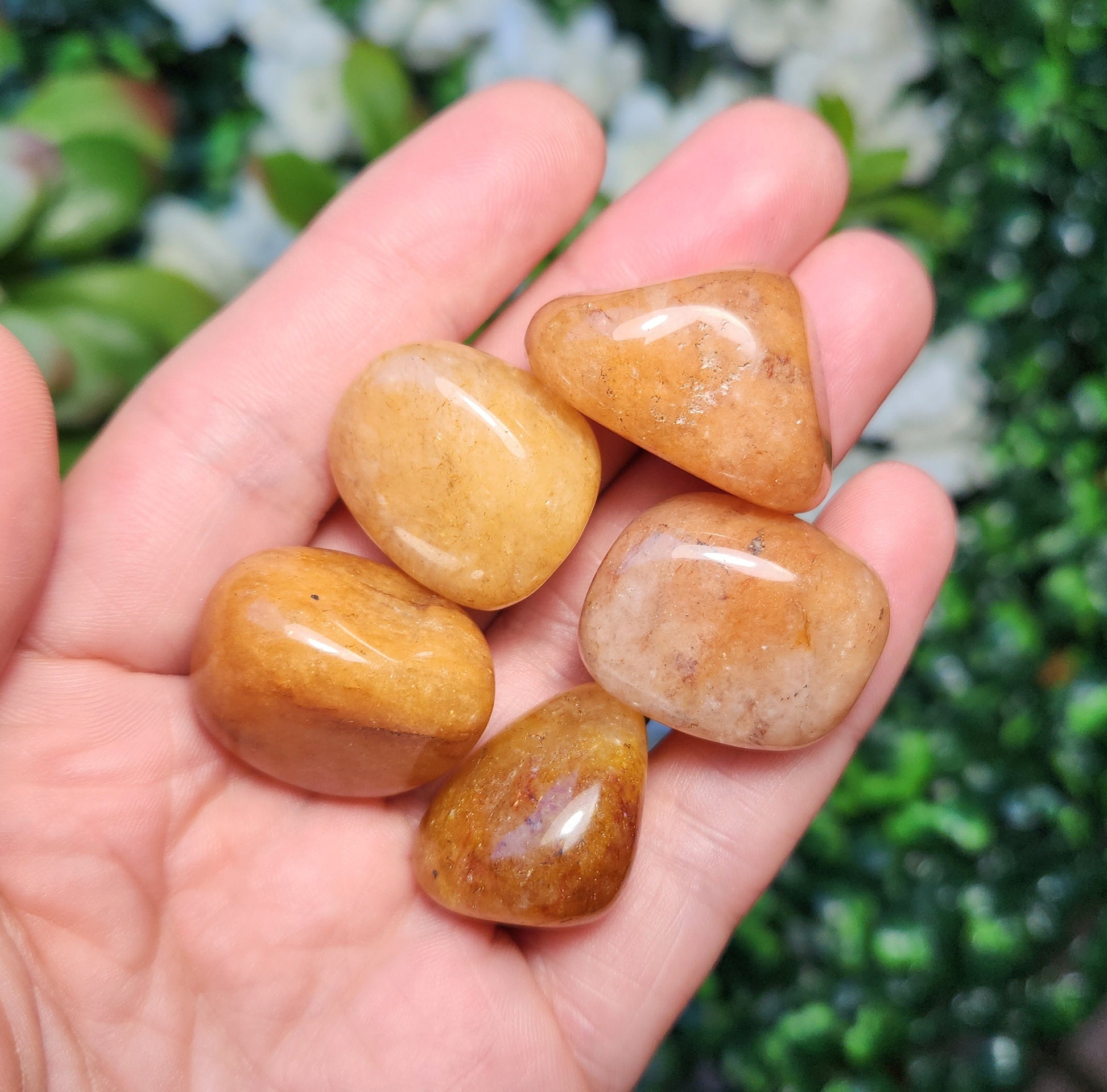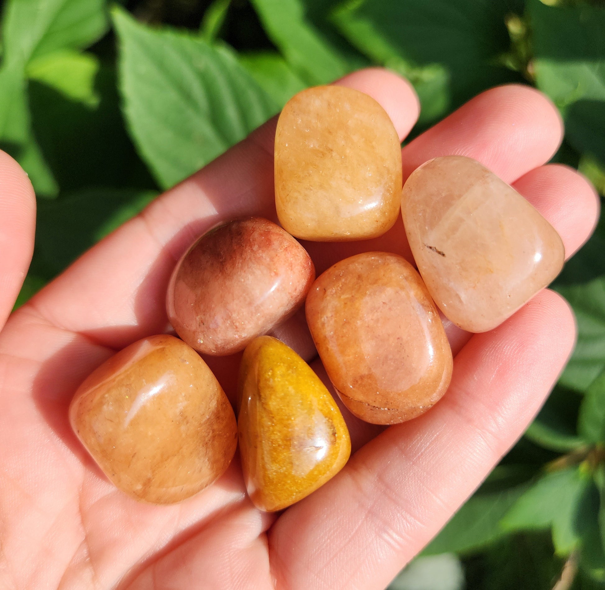 These Orange Aventurine stones have been tumbled to a smooth polish. They display a range of honey and peach tones, ranging from completely opaque to slightly translucent. Each specimen measures approximately .75 inches.