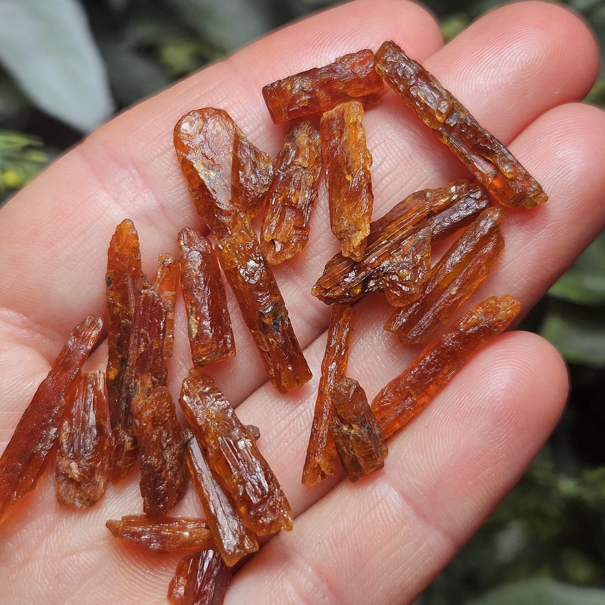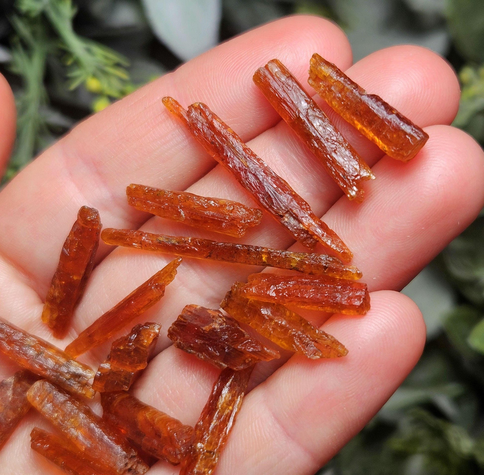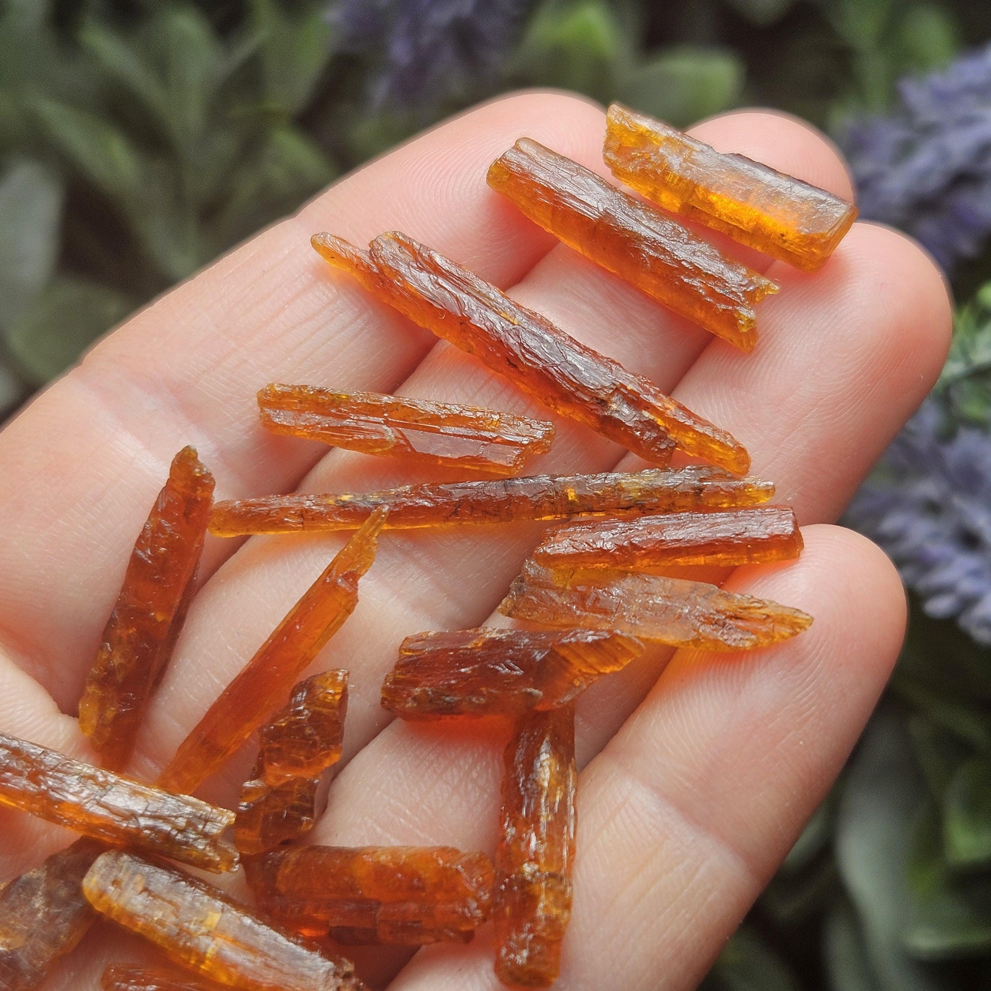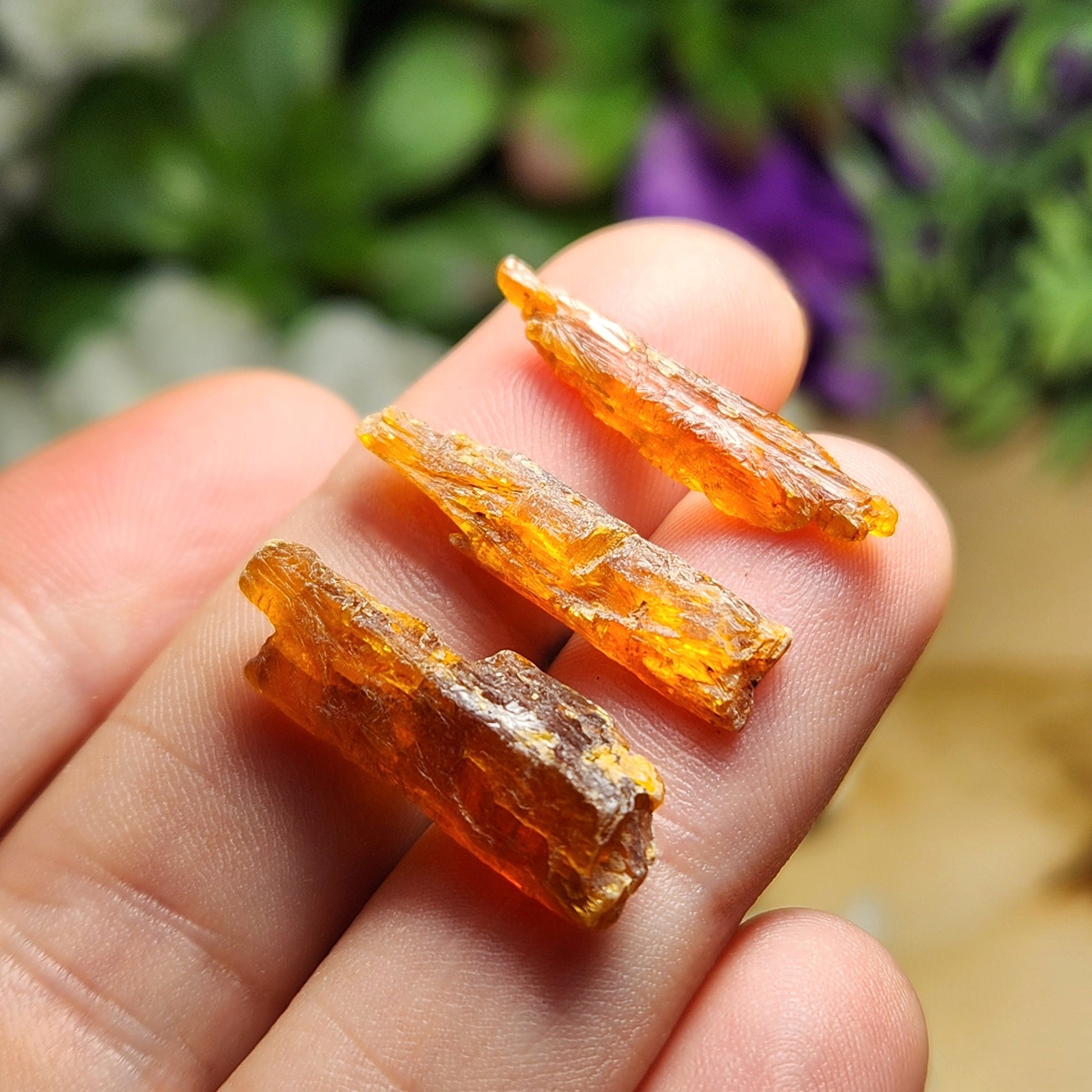 These Kyanite crystals are in their raw, natural form. They exhibit a brilliant orange coloring and may reveal some translucence when held up to the light.