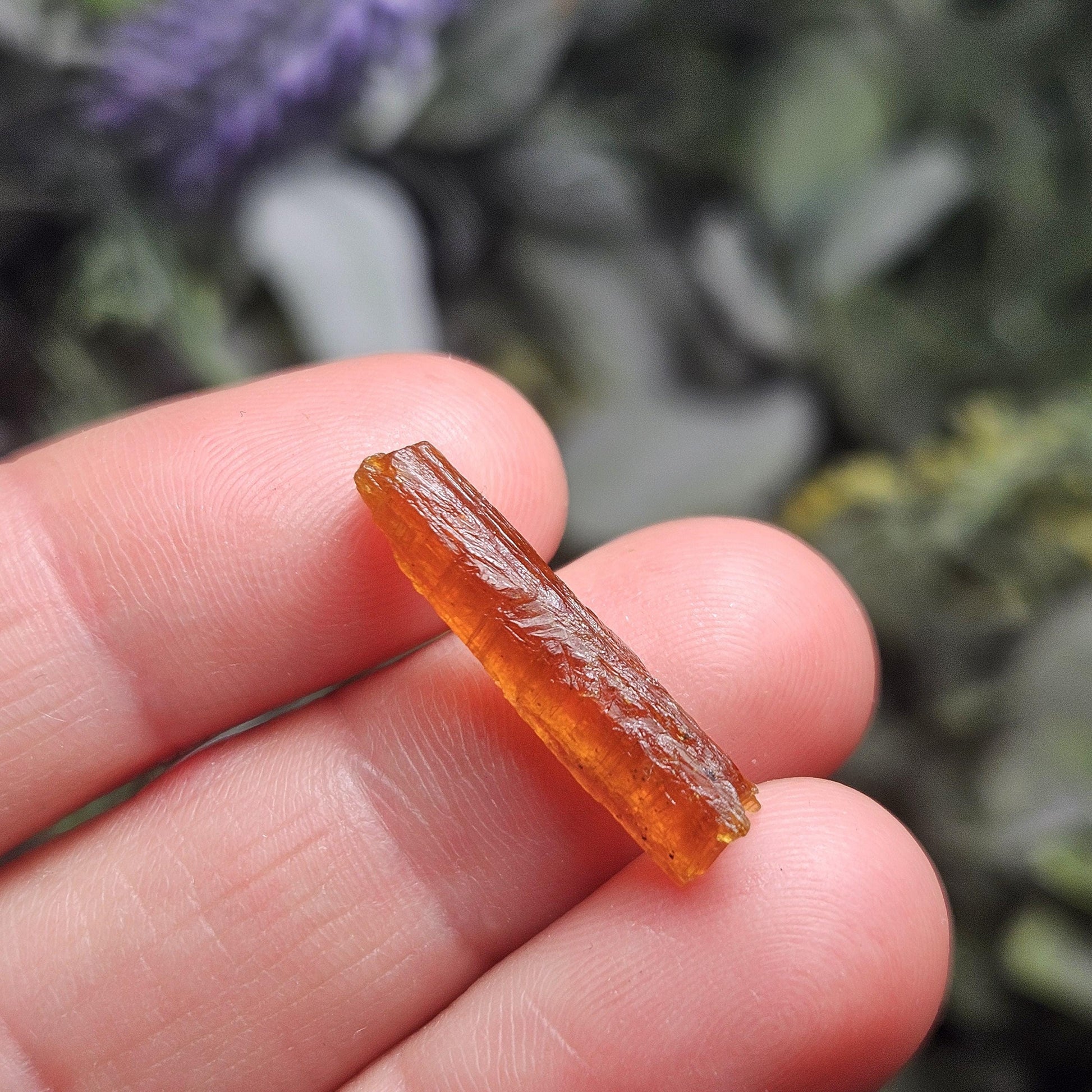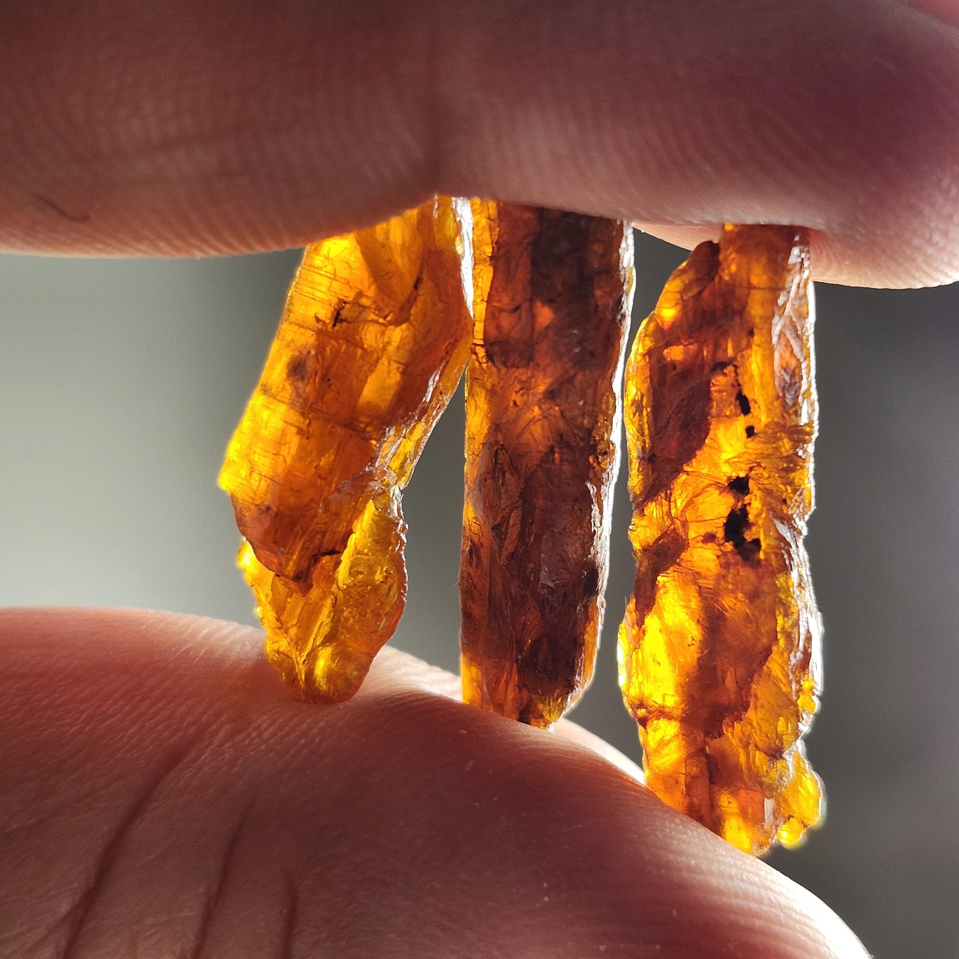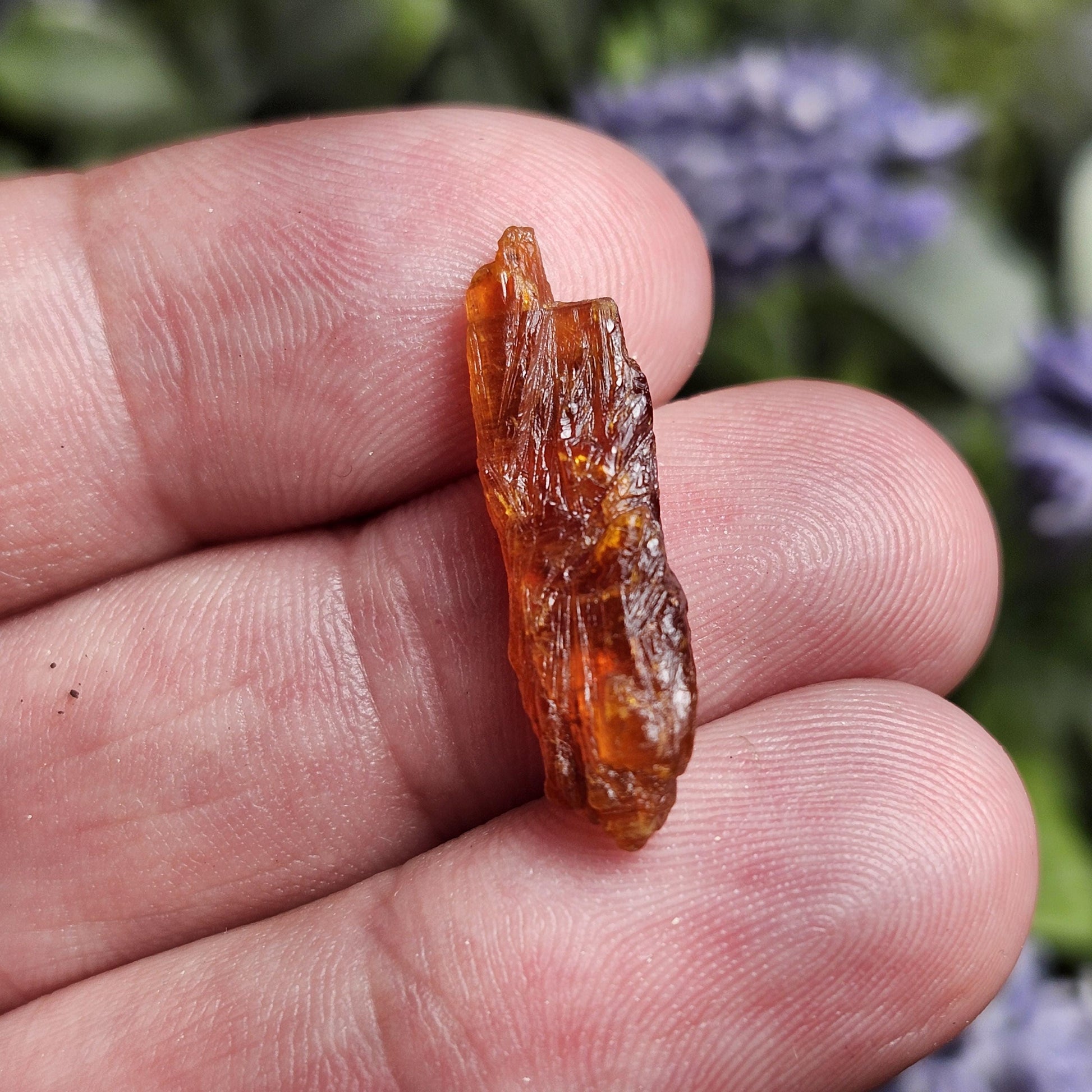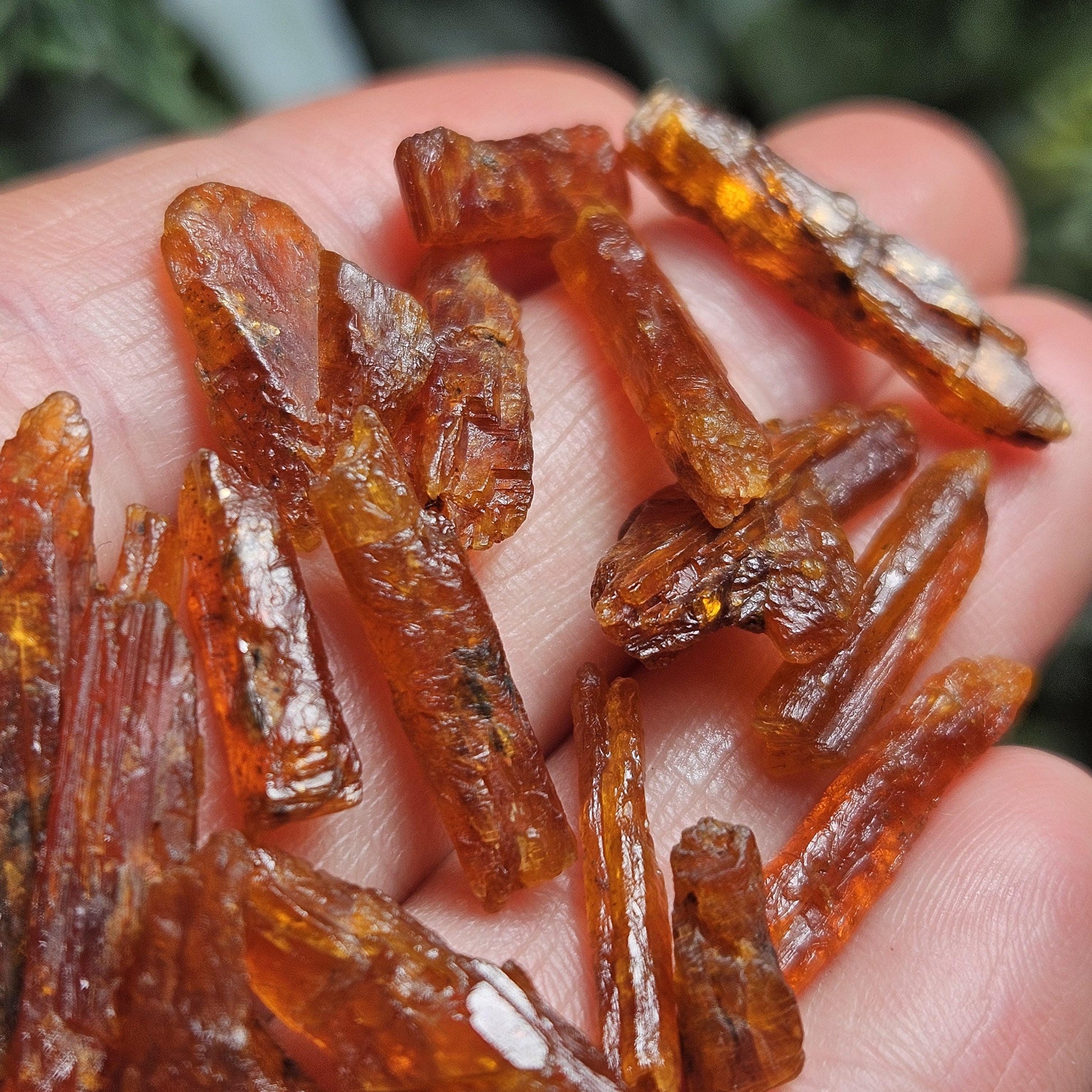 These Kyanite crystals are in their raw, natural form. They exhibit a brilliant orange coloring and may reveal some translucence when held up to the light.
