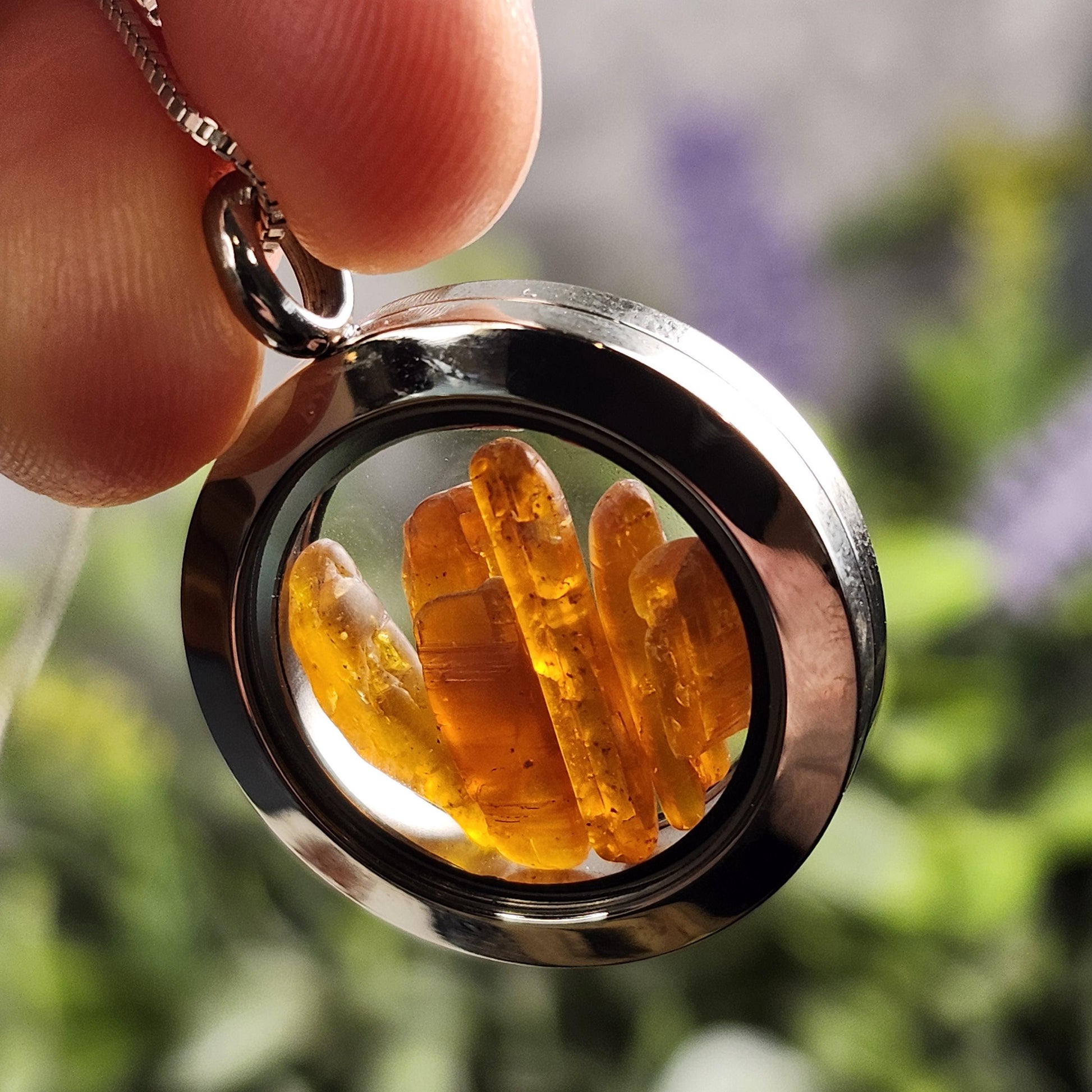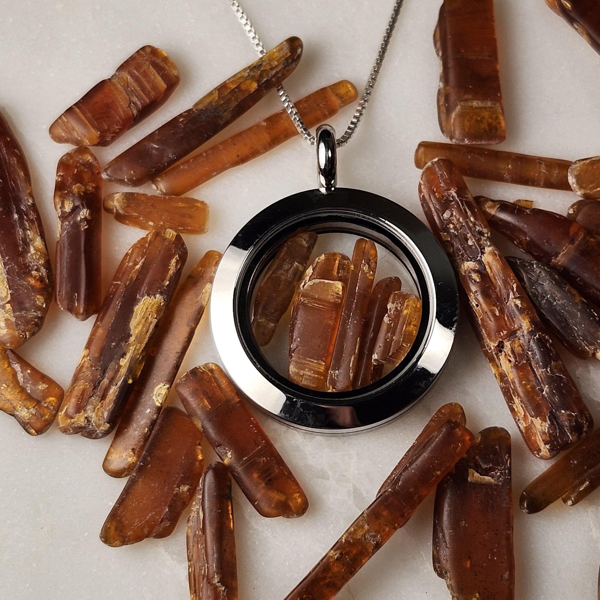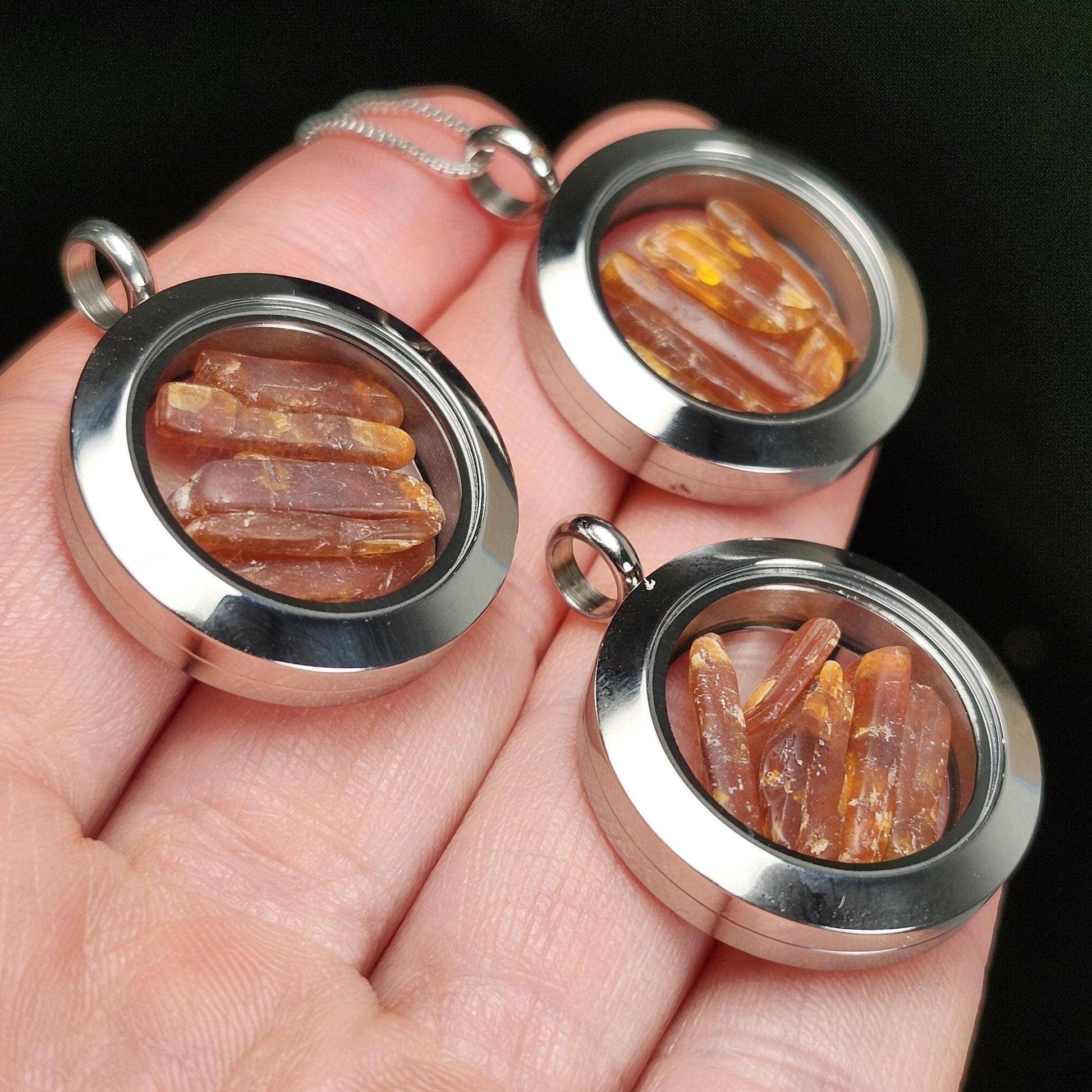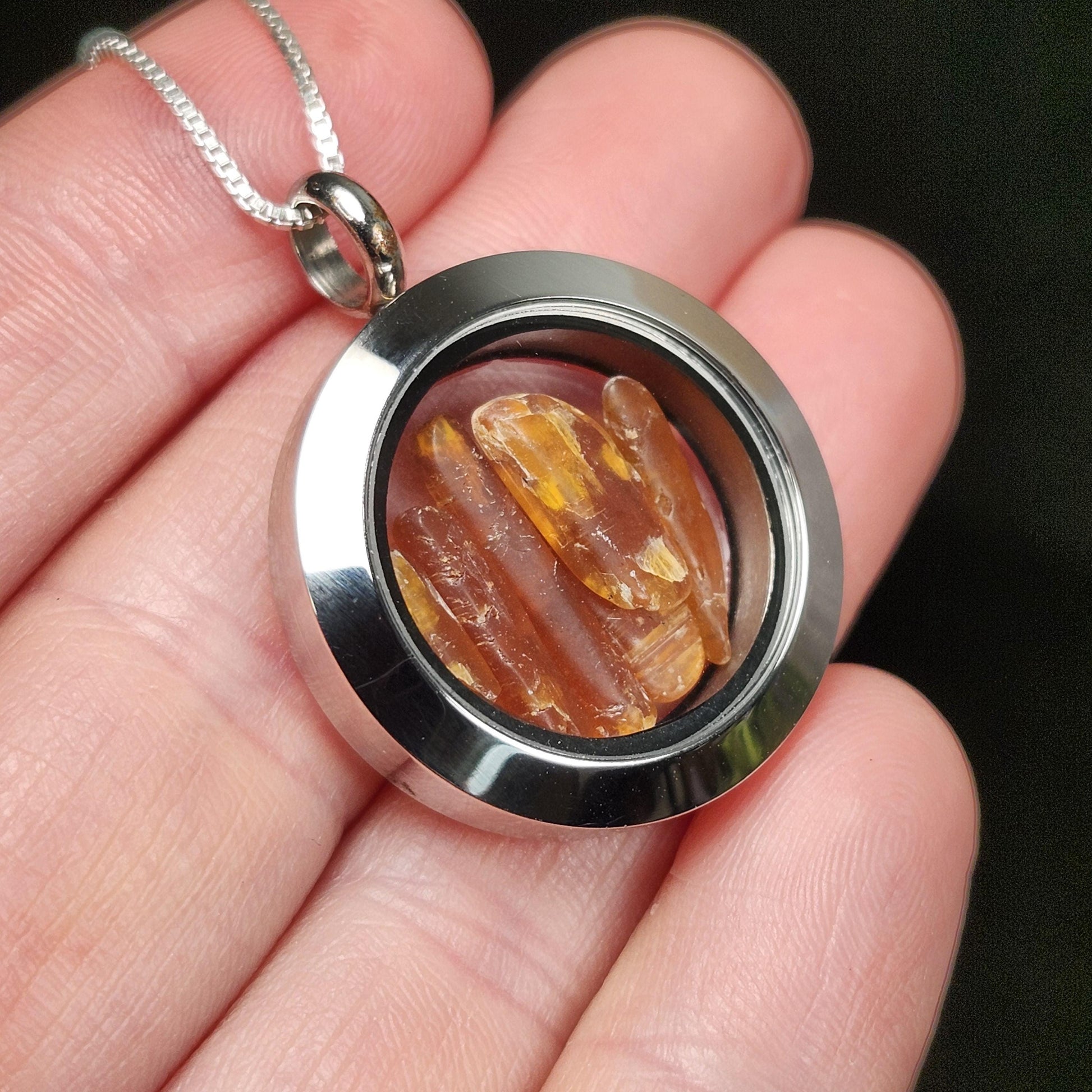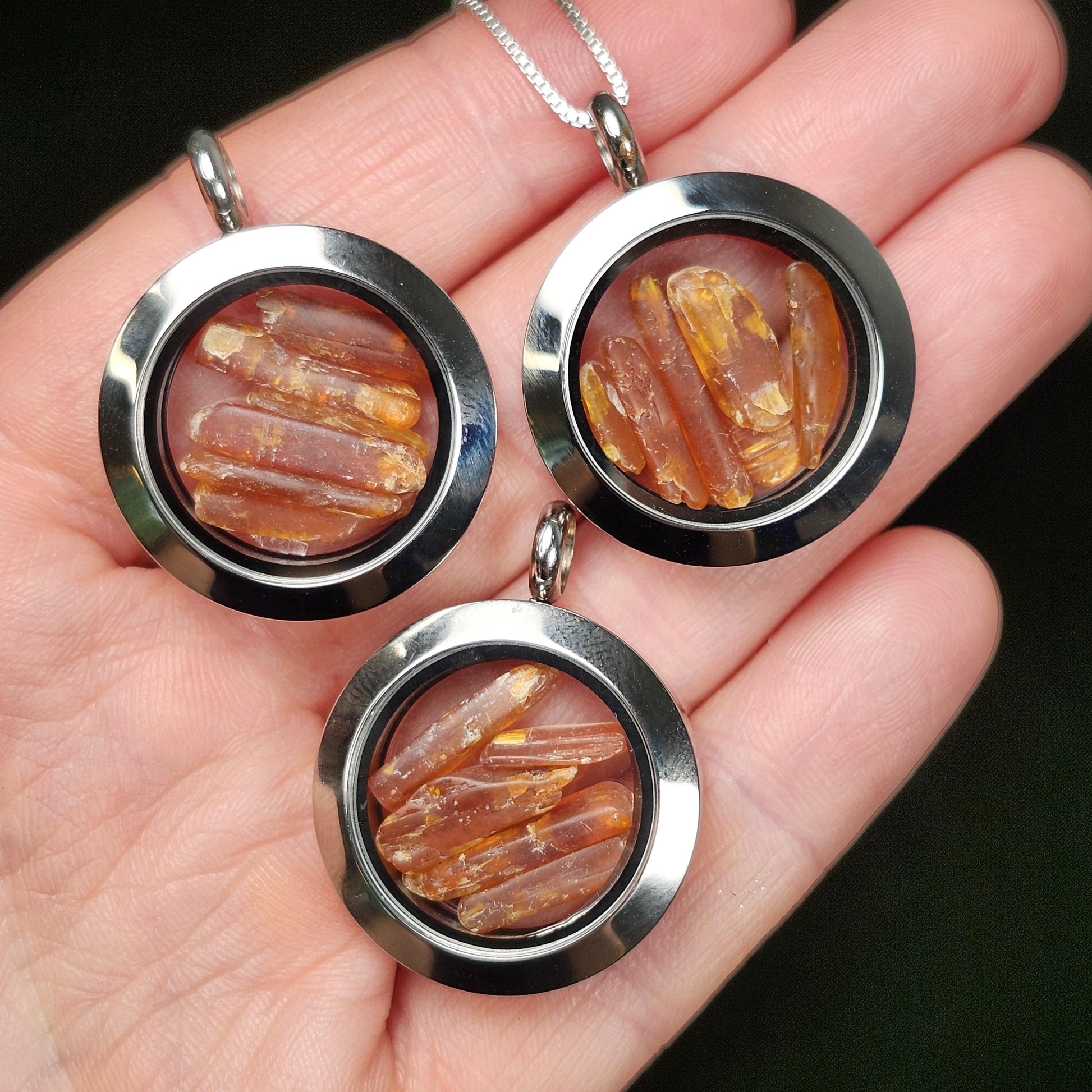 These lovely Orange Kyanite crystals haven been polished to a smooth satin finish. They exhibit a brilliant orange coloring and may reveal some translucence when held up to the light. These gemstones are gently nestled inside of a high-quality, stainless-steel locket. These lockets are assembled with two pieces that connect with a threaded screw attachment. We recommend securing the attachments with a dab of epoxy for a more permanent option. Each pendant measures approximately 32mm by 25mm. We offer a range of lengths of .925 Sterling Silver box chains that pair perfectly with these locket pendants.