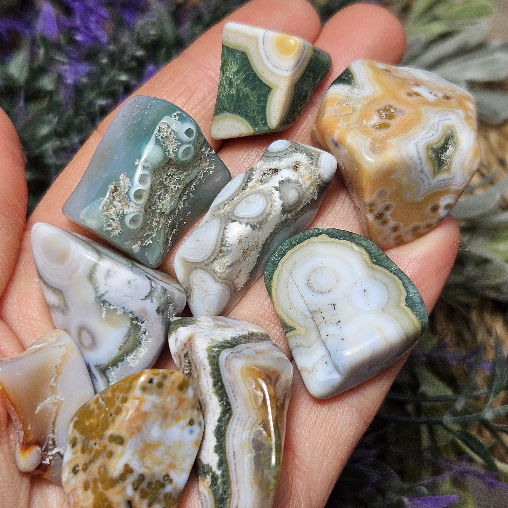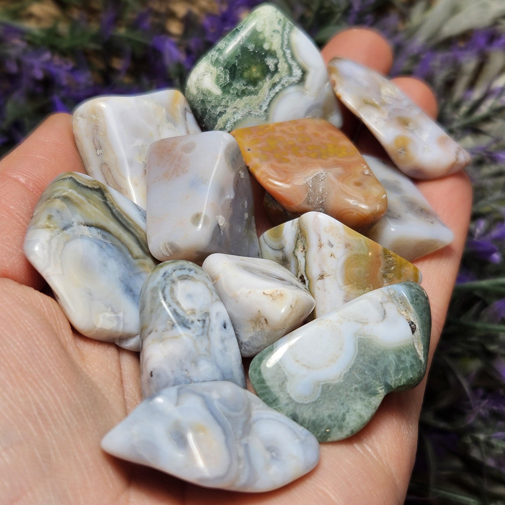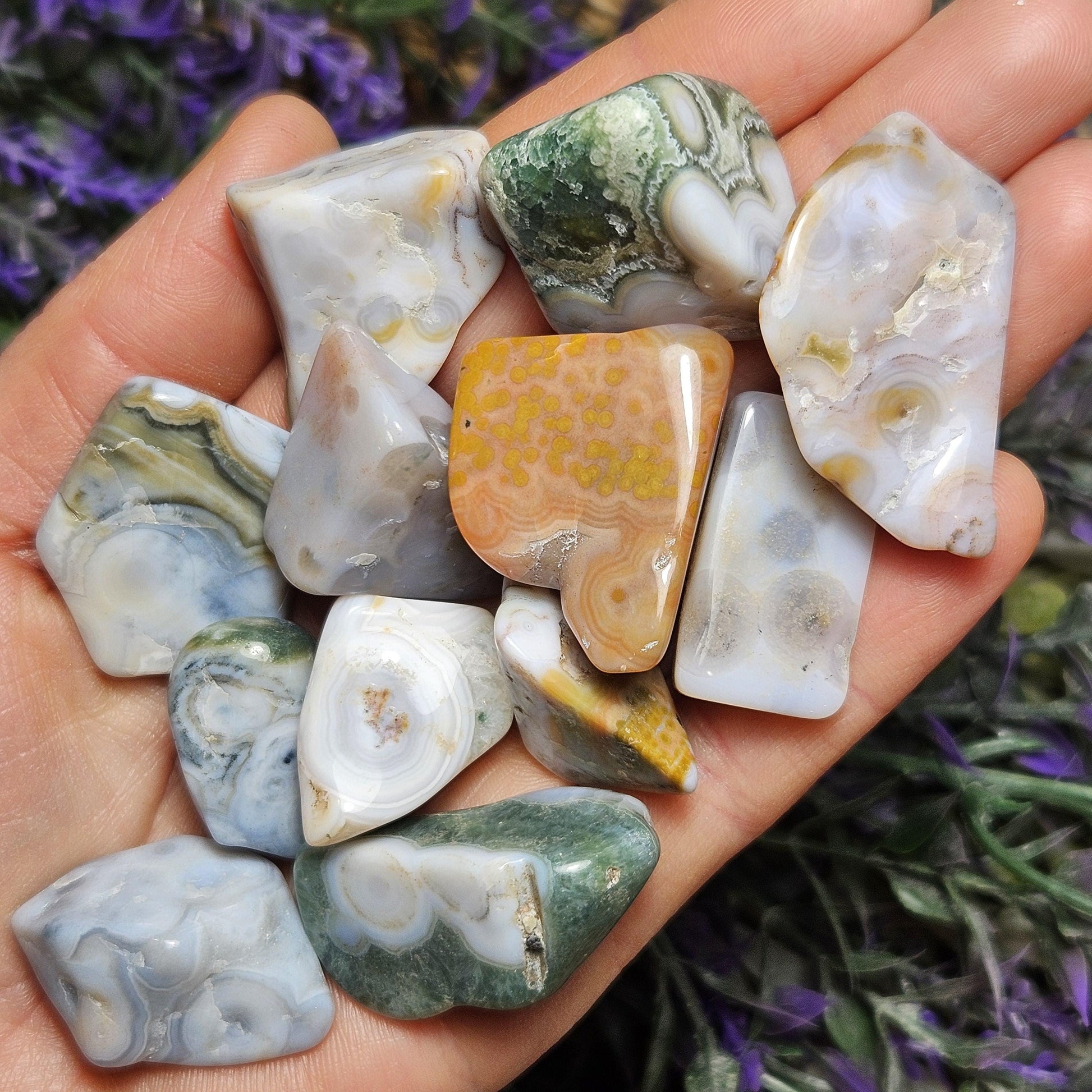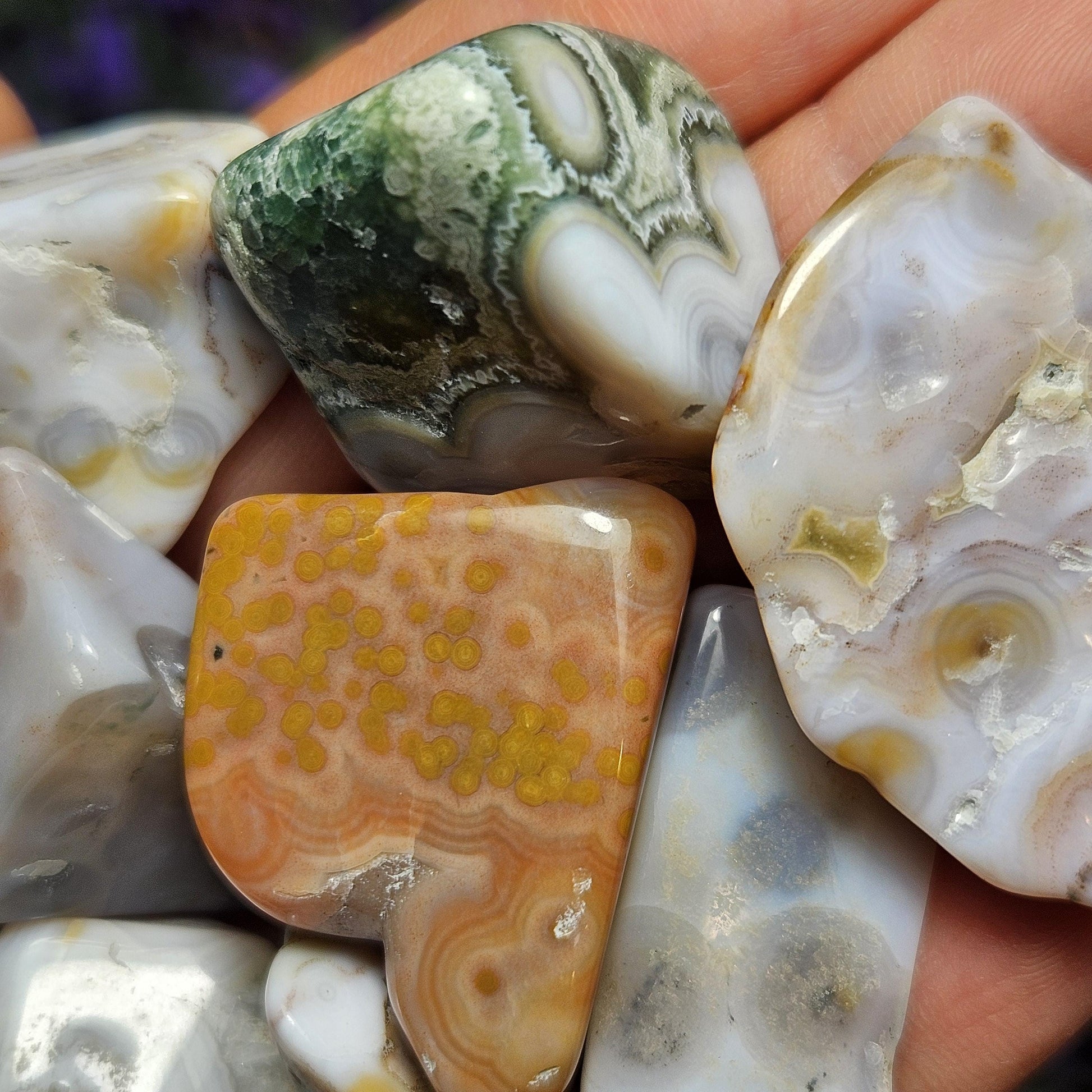 Ocean Jasper are pieces of fossilized coral, you can even see the little circles where the coral used to be! These Ocean Jasper stones have smooth, angular shapes and exhibit an amazing array of small orbicular inclusions. They have a wide variety of colors, each with their own unique pattern.