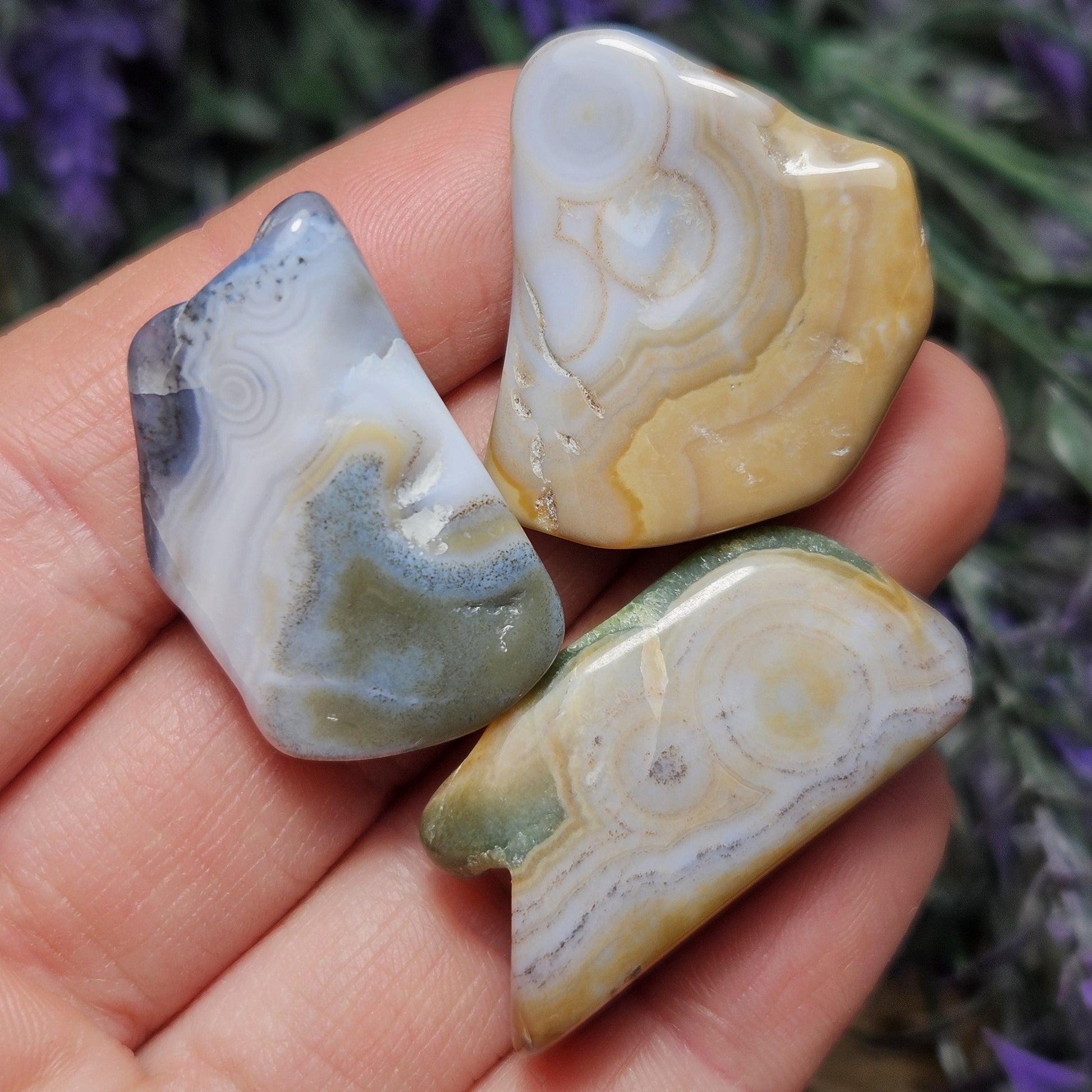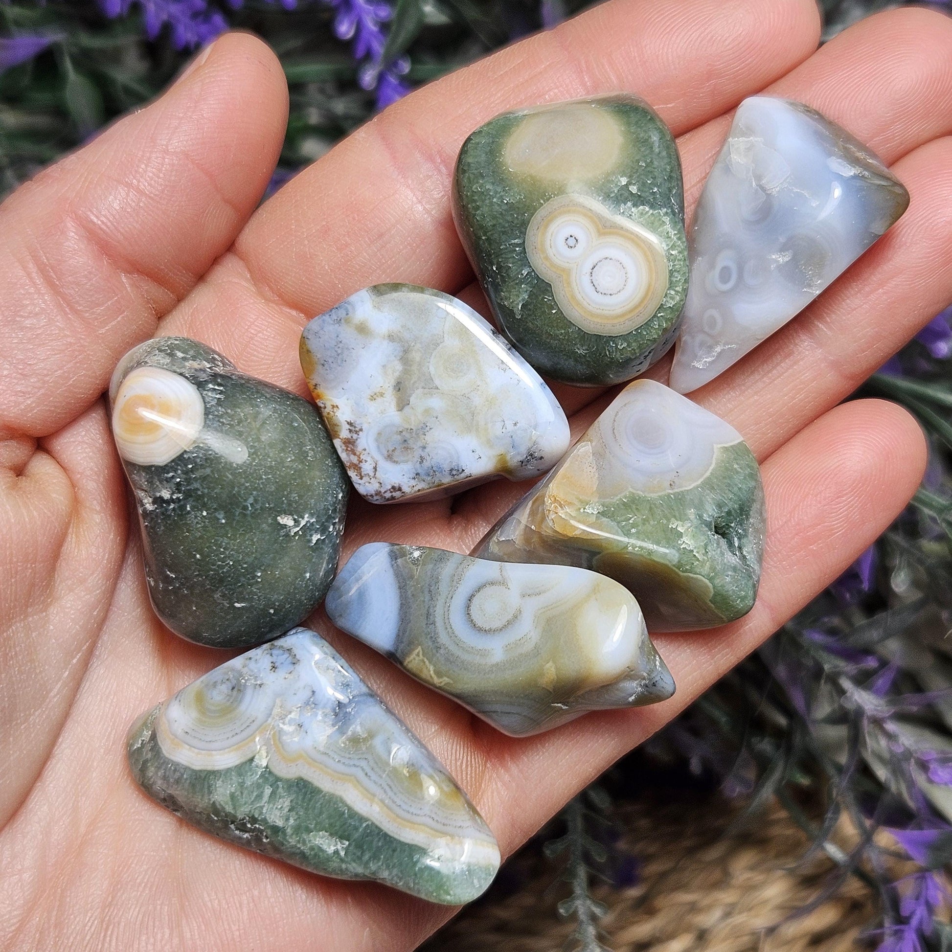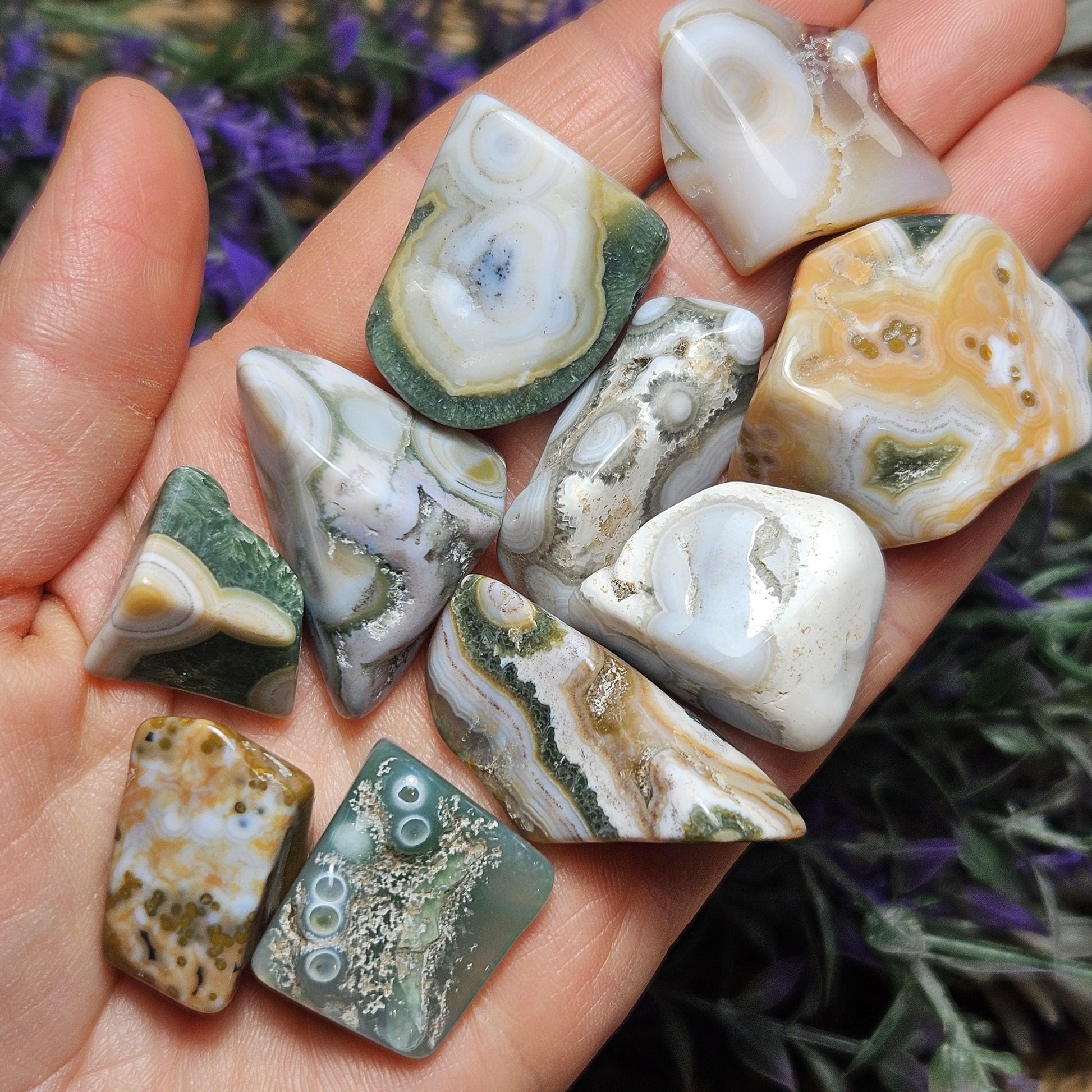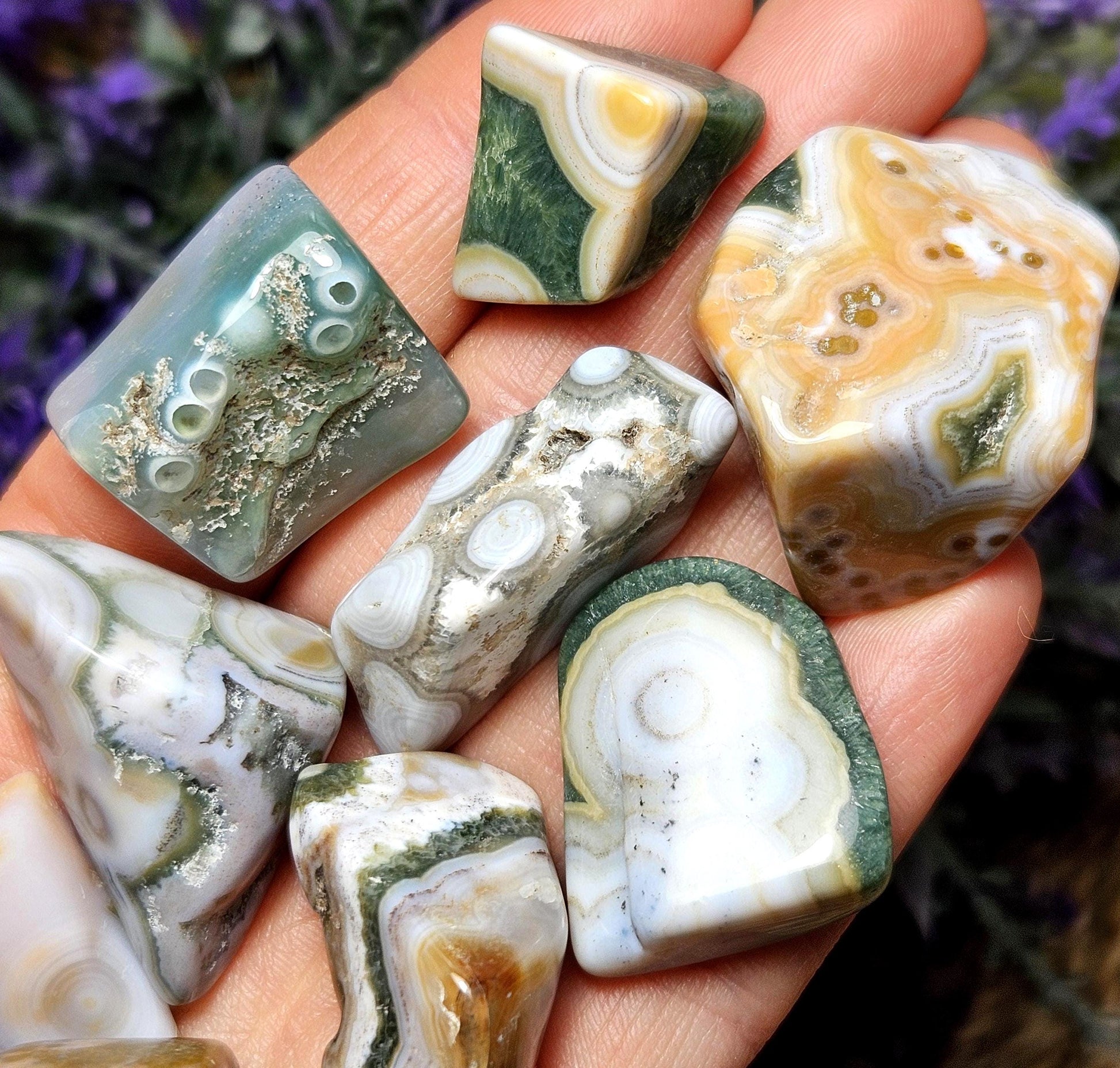 Ocean Jasper are pieces of fossilized coral, you can even see the little circles where the coral used to be! These Ocean Jasper stones have smooth, angular shapes and exhibit an amazing array of small orbicular inclusions. They have a wide variety of colors, each with their own unique pattern.