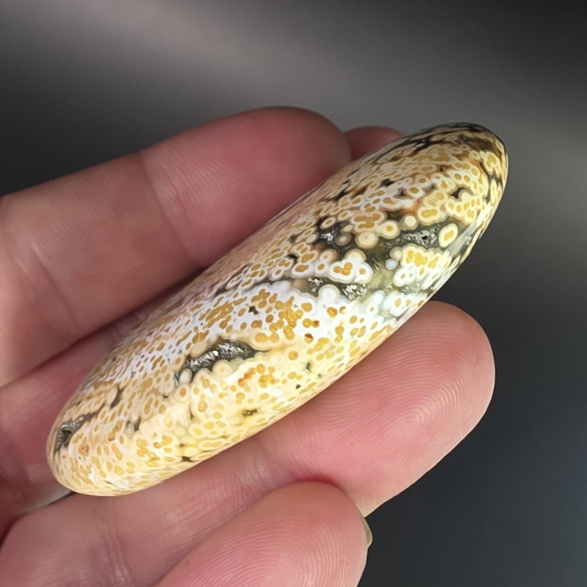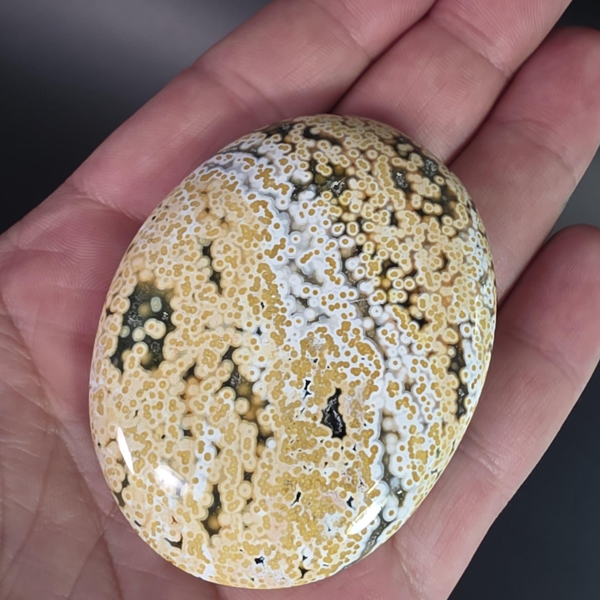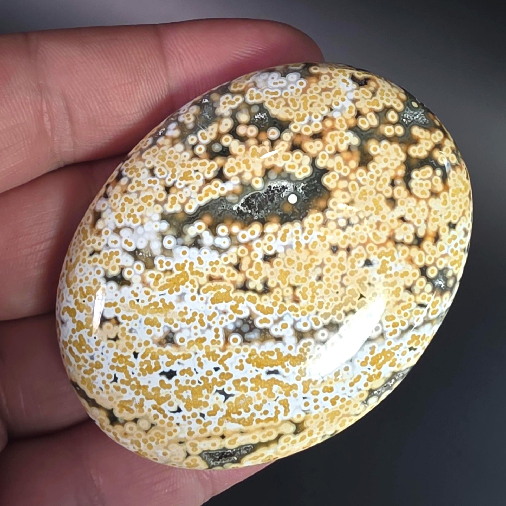 Ocean Jasper are pieces of fossilized coral, you can even see the little circles where the coral used to be! This one-of-a-kind Ocean Jasper palm stone features vibrant green fields woven with yellow and cream colored orbs — a true specimen of the original Vein 7 deposit, long since depleted and deeply prized by collectors. I have a small supply of OLD STOCK I'm releasing, containing a beautiful array of colors and breathtaking orbicular patterns. This specimen measures approximately 65mm by 48mm in diameter and weighs 72 grams.