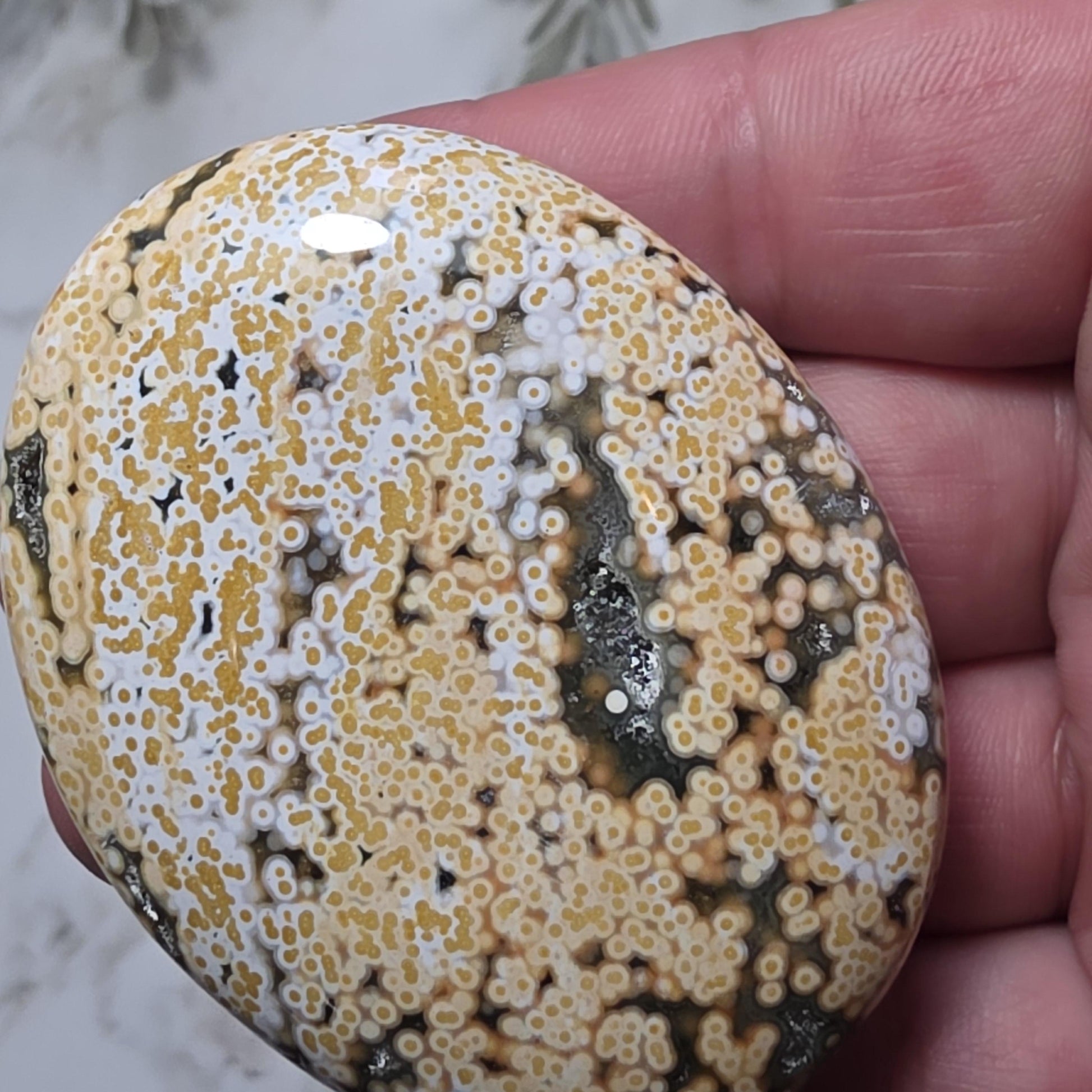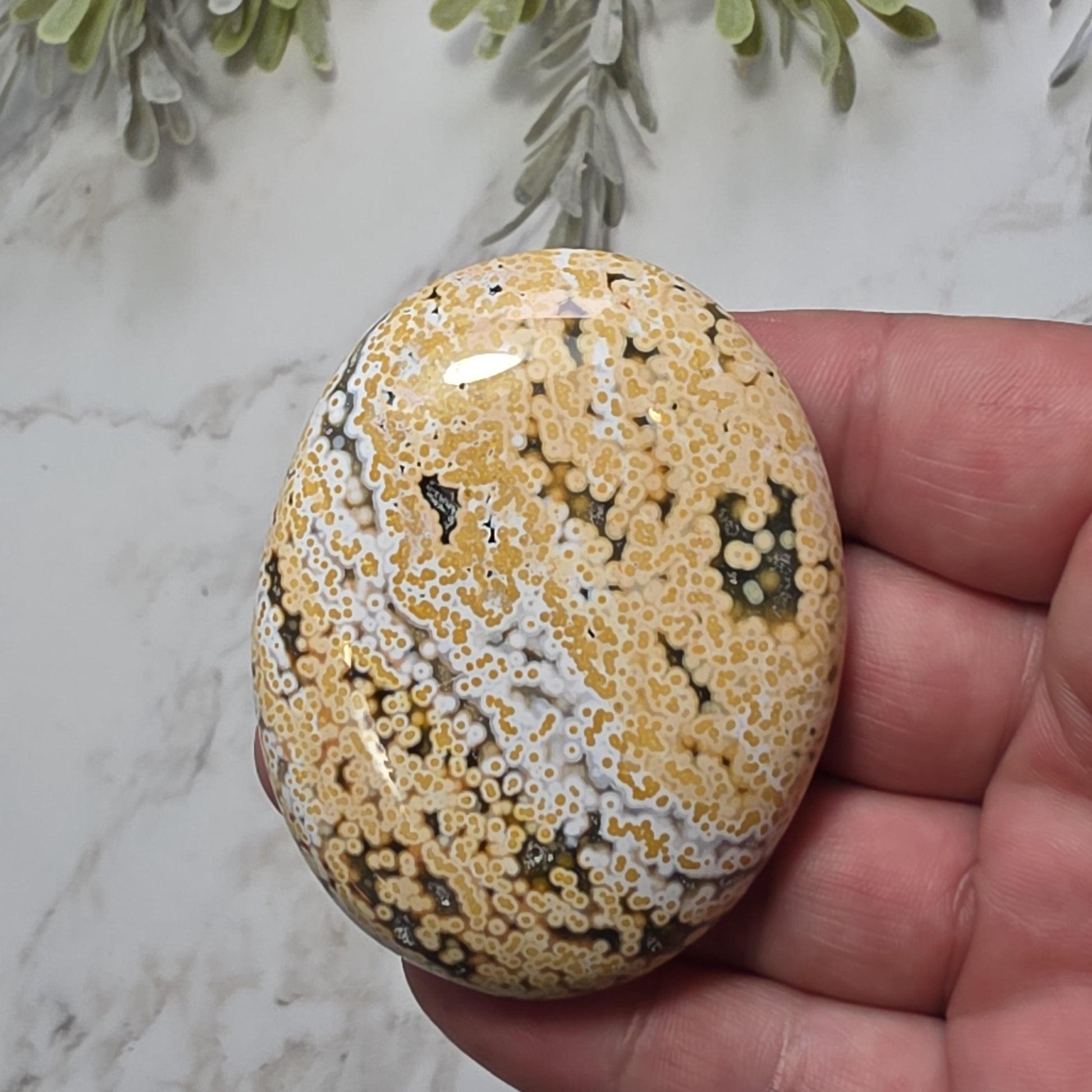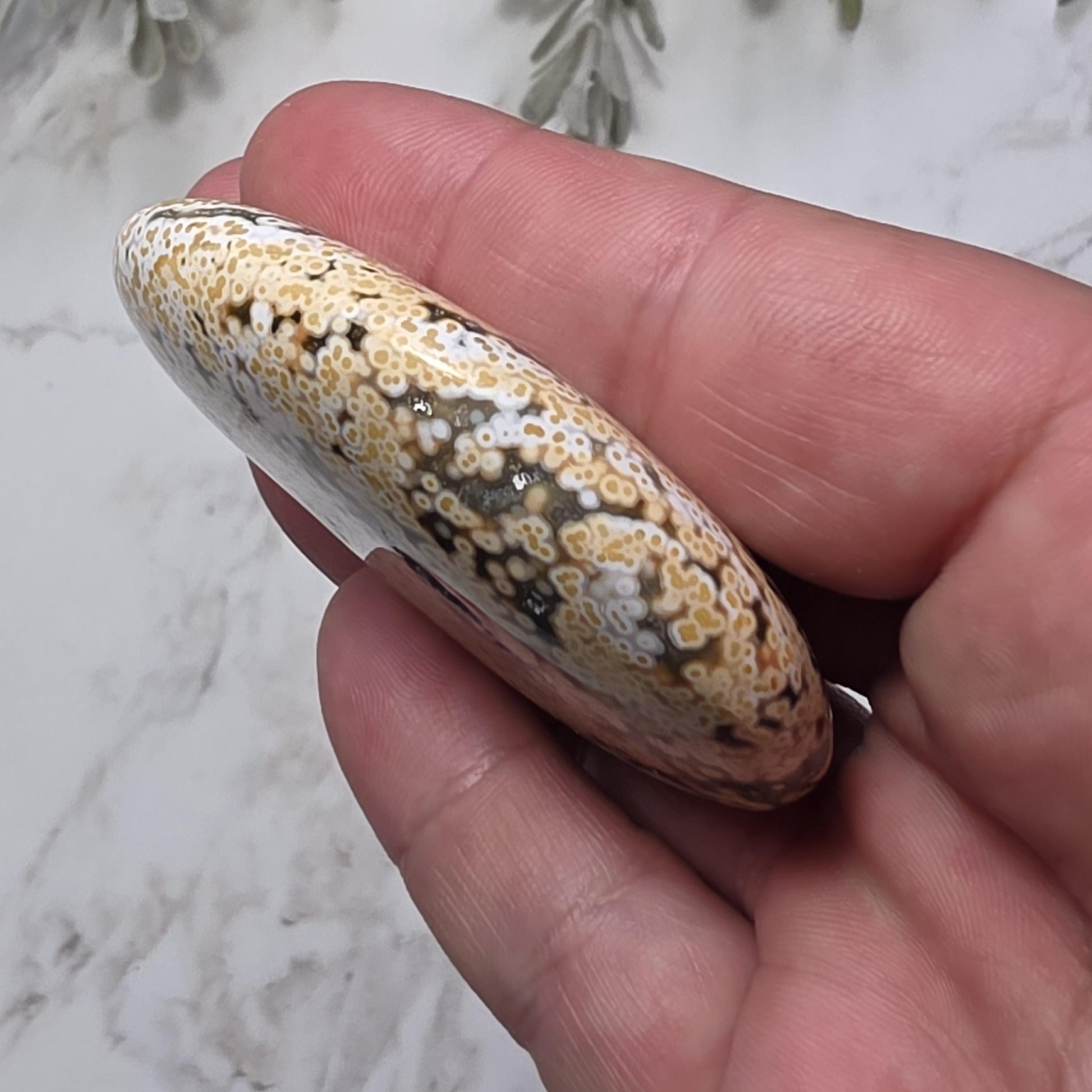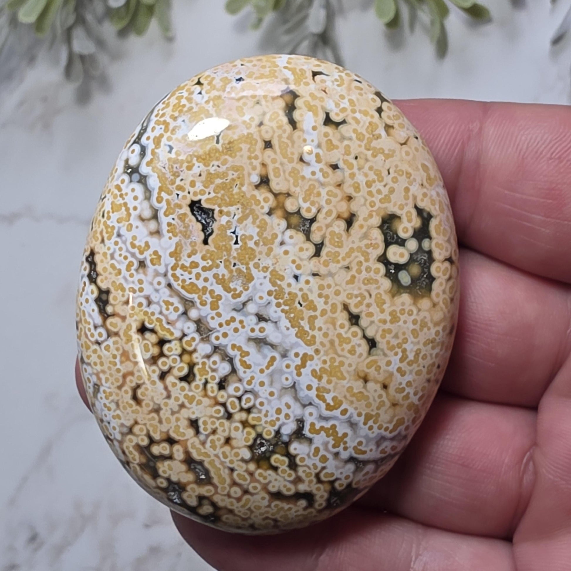Ocean Jasper are pieces of fossilized coral, you can even see the little circles where the coral used to be! This one-of-a-kind Ocean Jasper palm stone features vibrant green fields woven with yellow and cream colored orbs — a true specimen of the original Vein 7 deposit, long since depleted and deeply prized by collectors. I have a small supply of OLD STOCK I'm releasing, containing a beautiful array of colors and breathtaking orbicular patterns. This specimen measures approximately 65mm by 48mm in diameter and weighs 72 grams.
