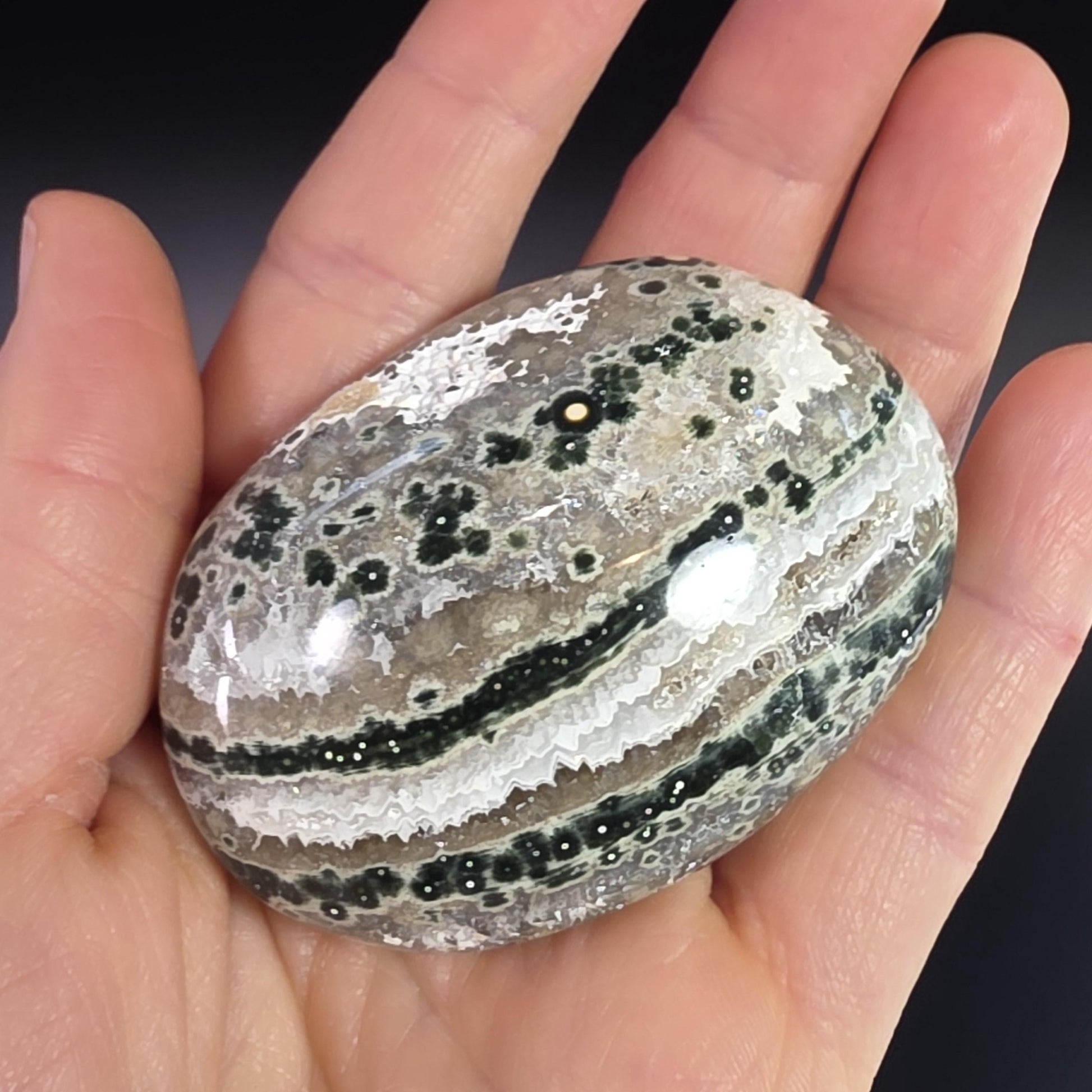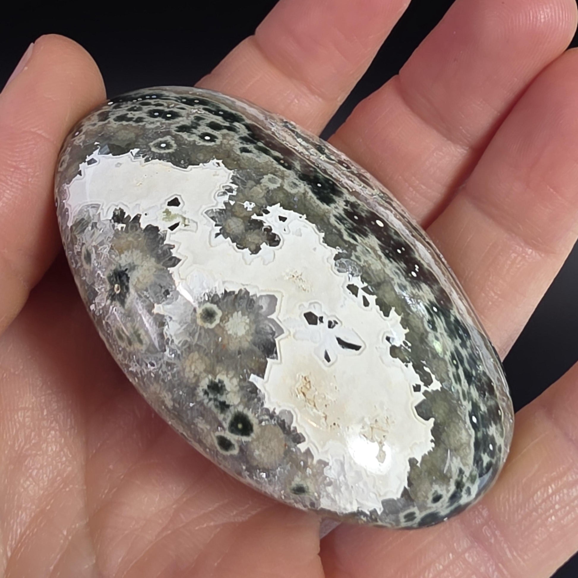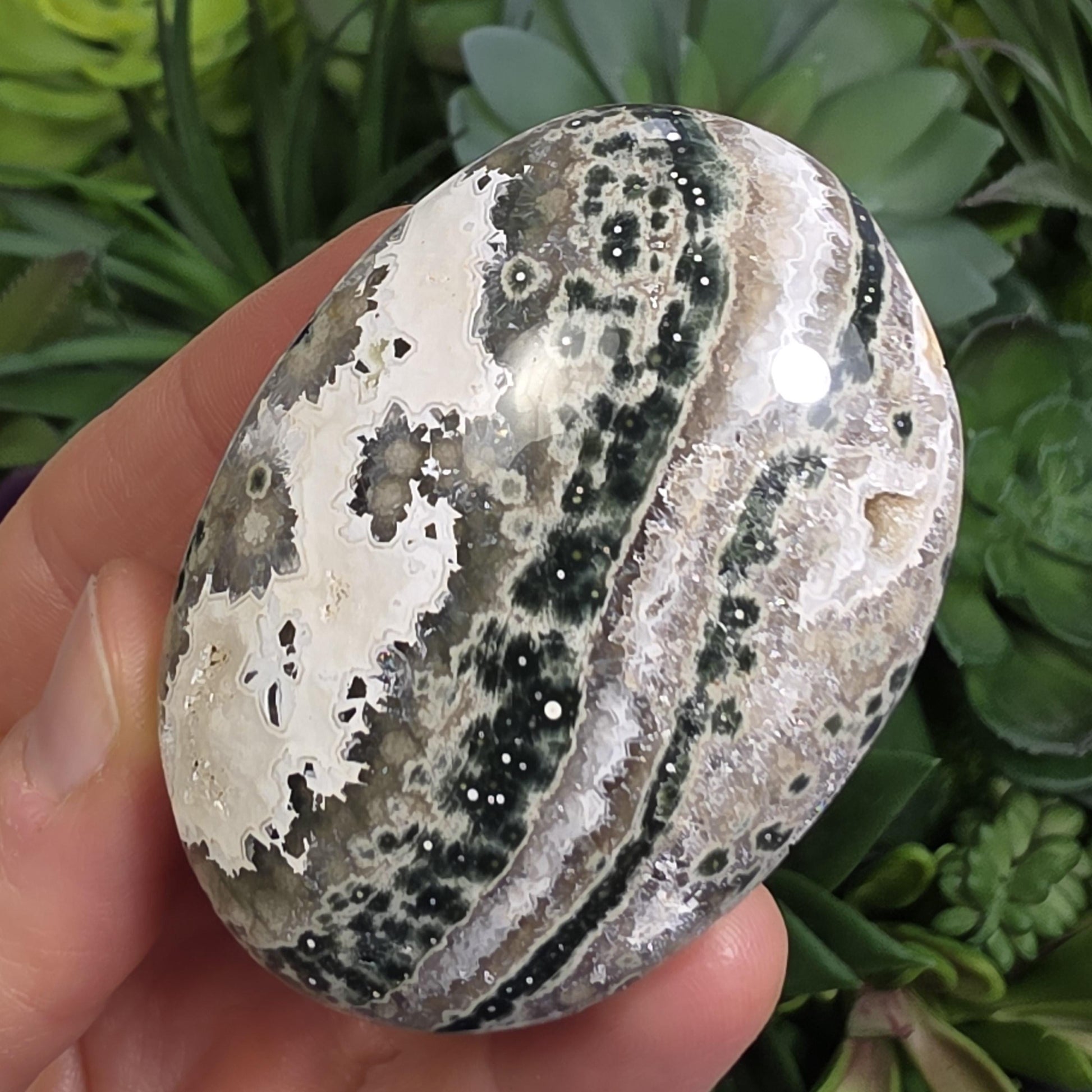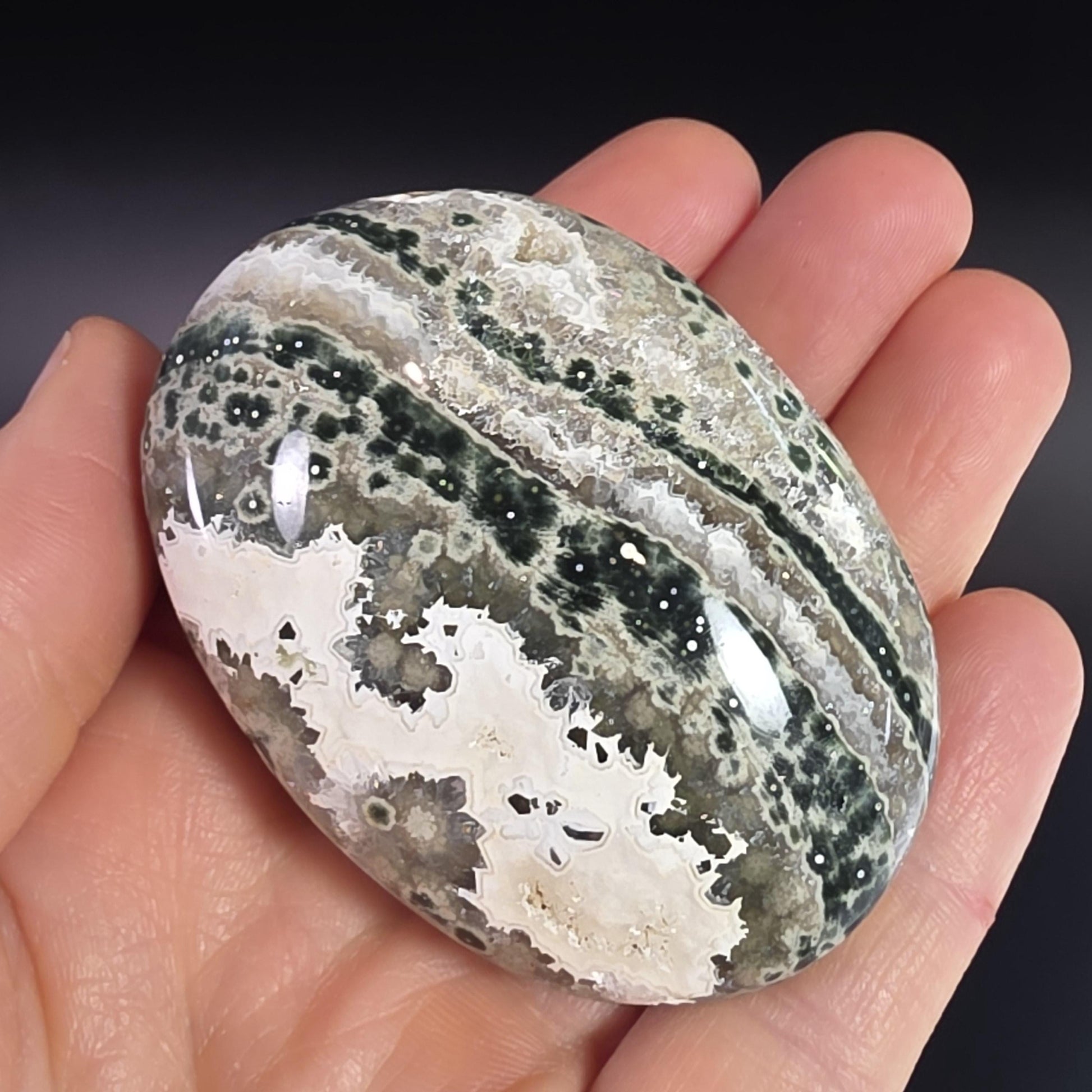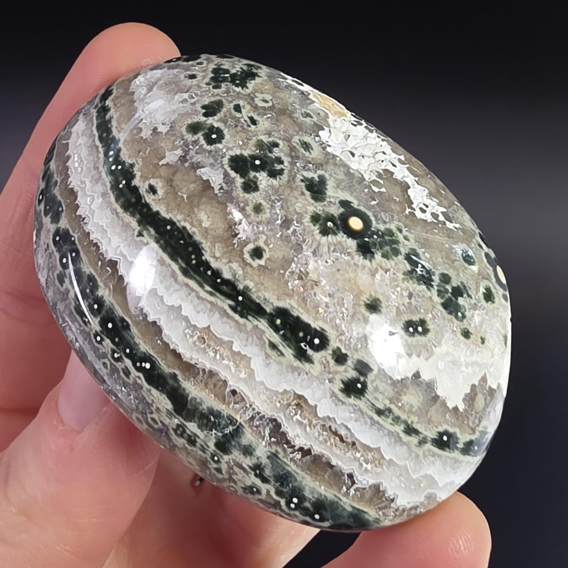 Ocean Jasper are pieces of fossilized coral, you can even see the little circles where the coral used to be! This one-of-a-kind Ocean Jasper palm stone features grey fields woven with deep green orbs and underlying botryoidal growth present — a true specimen of the original Vein 7 deposit, long since depleted and deeply prized by collectors. I have a small supply of OLD STOCK I'm releasing, containing a beautiful array of colors and breathtaking orbicular patterns. This specimen measures approximately 60mm by 40mm in diameter and weighs 85 grams.