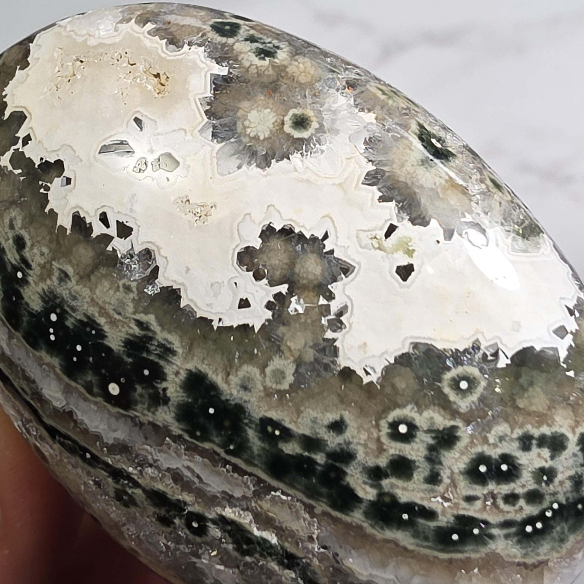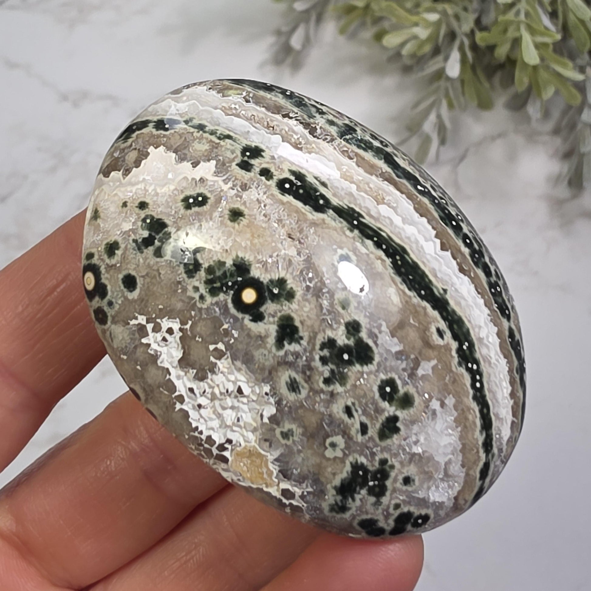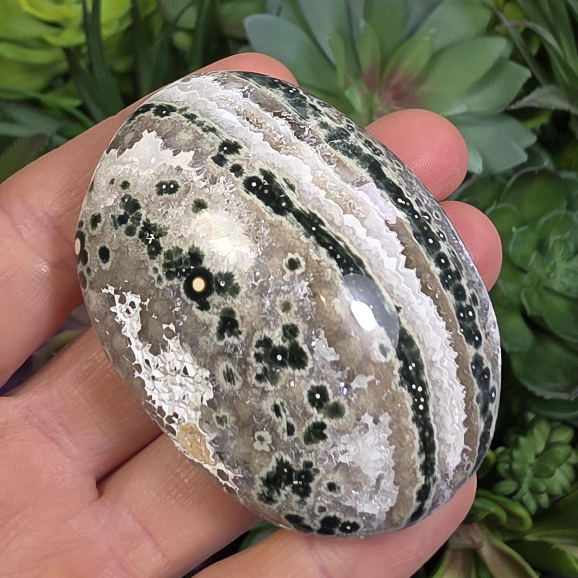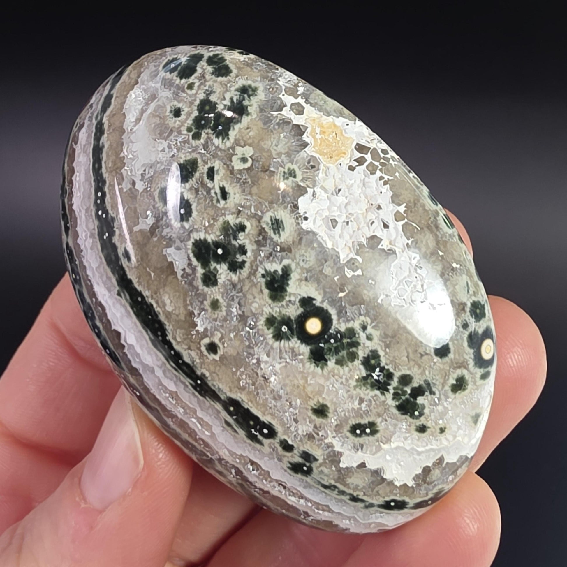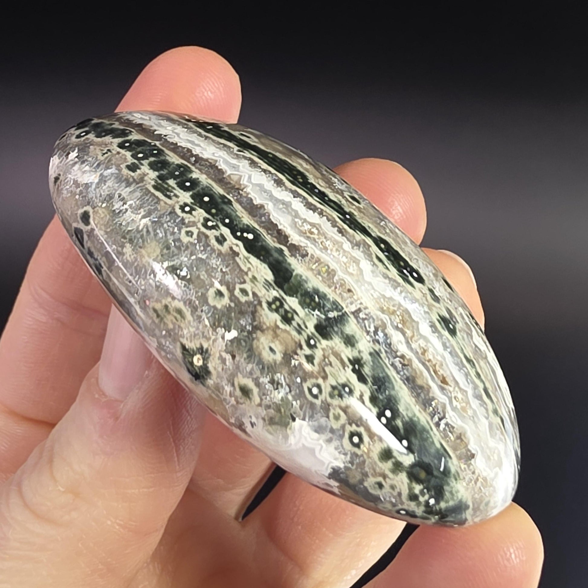 Ocean Jasper are pieces of fossilized coral, you can even see the little circles where the coral used to be! This one-of-a-kind Ocean Jasper palm stone features grey fields woven with deep green orbs and underlying botryoidal growth present — a true specimen of the original Vein 7 deposit, long since depleted and deeply prized by collectors. I have a small supply of OLD STOCK I'm releasing, containing a beautiful array of colors and breathtaking orbicular patterns. This specimen measures approximately 60mm by 40mm in diameter and weighs 85 grams.