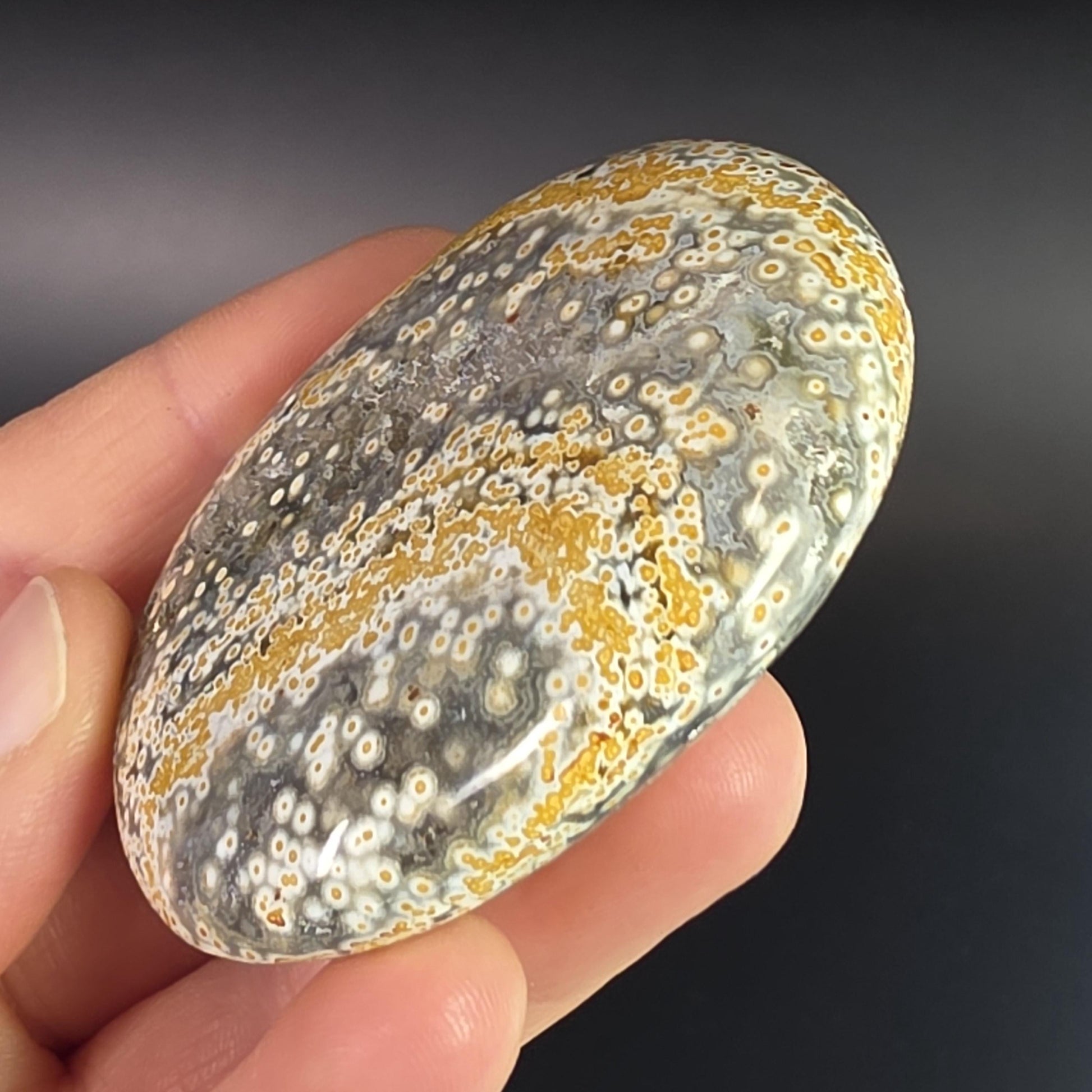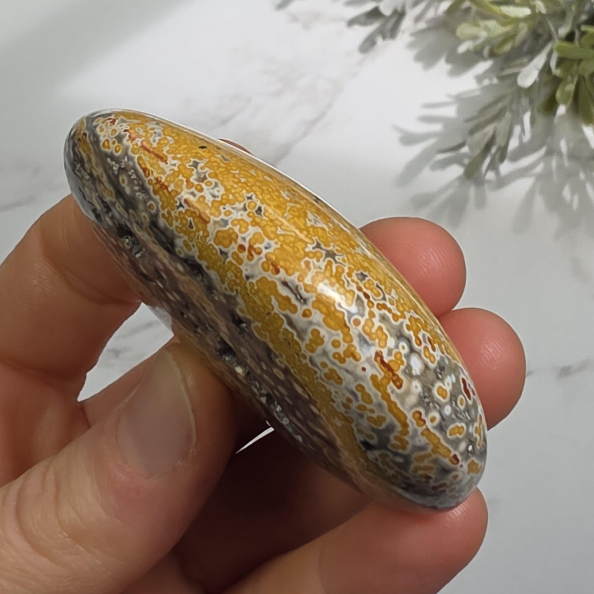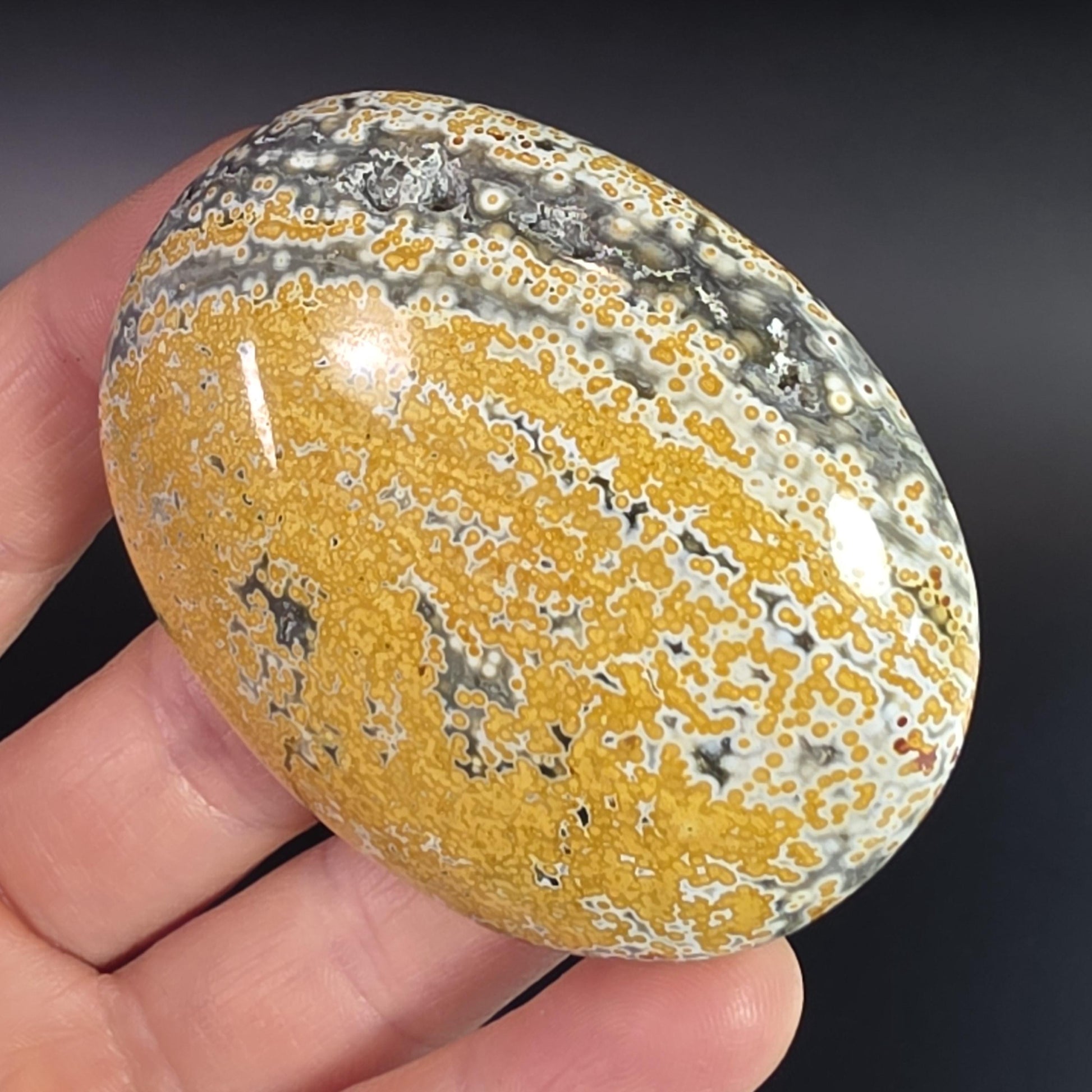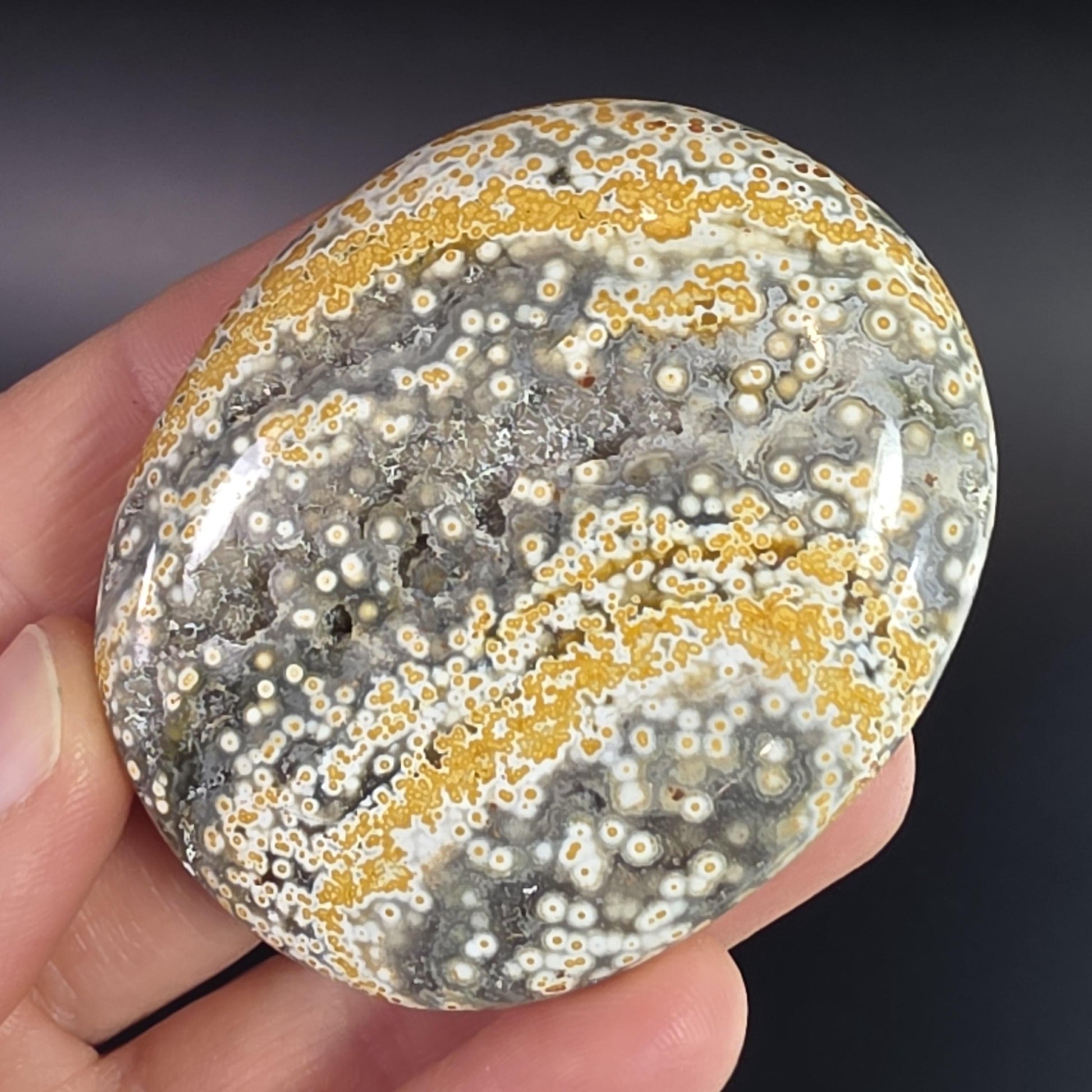 Ocean Jasper are pieces of fossilized coral, you can even see the little circles where the coral used to be! This one-of-a-kind Ocean Jasper palm stone features vibrant grey fields woven with yellow-orange bands — a true specimen of the original Vein 7 deposit, long since depleted and deeply prized by collectors. I have a small supply of OLD STOCK I'm releasing, containing a beautiful array of colors and breathtaking orbicular patterns. This specimen measures approximately 60mm by 48mm in diameter and weighs 77 grams.