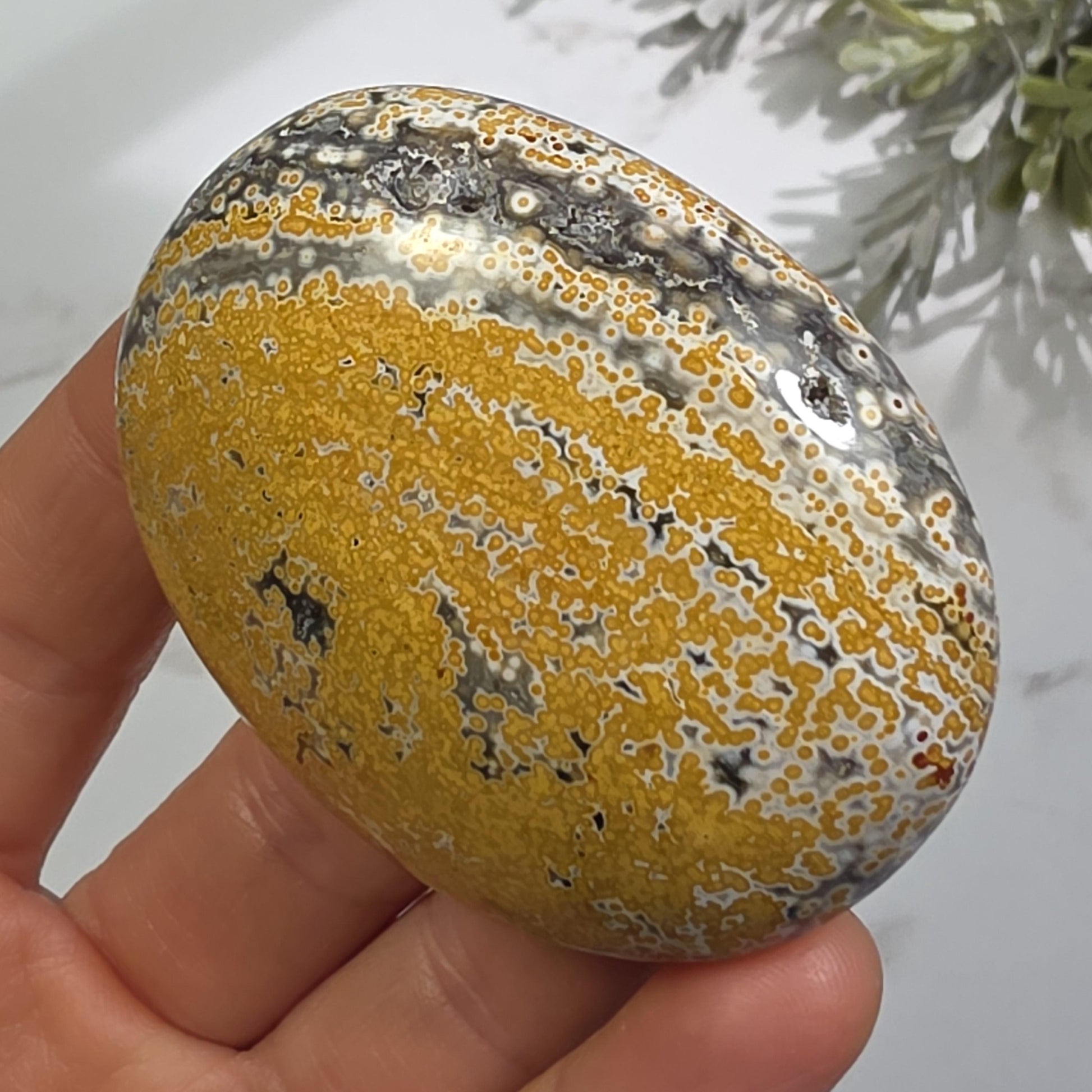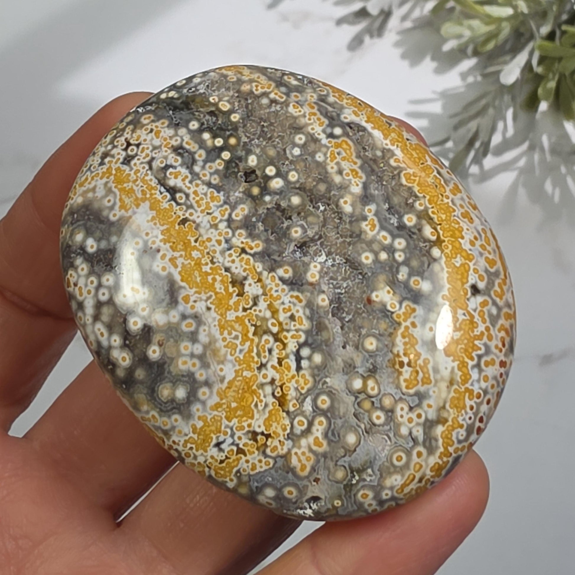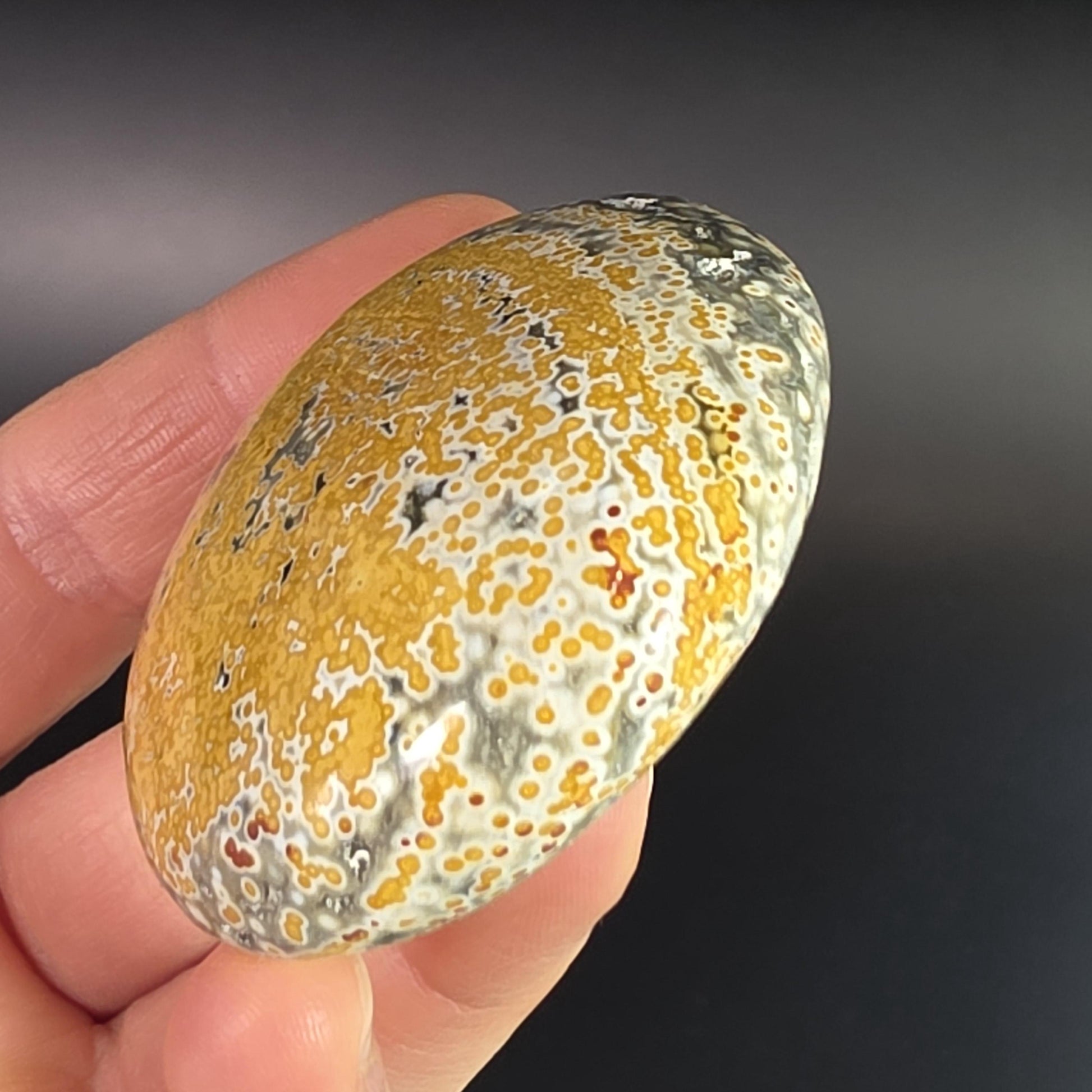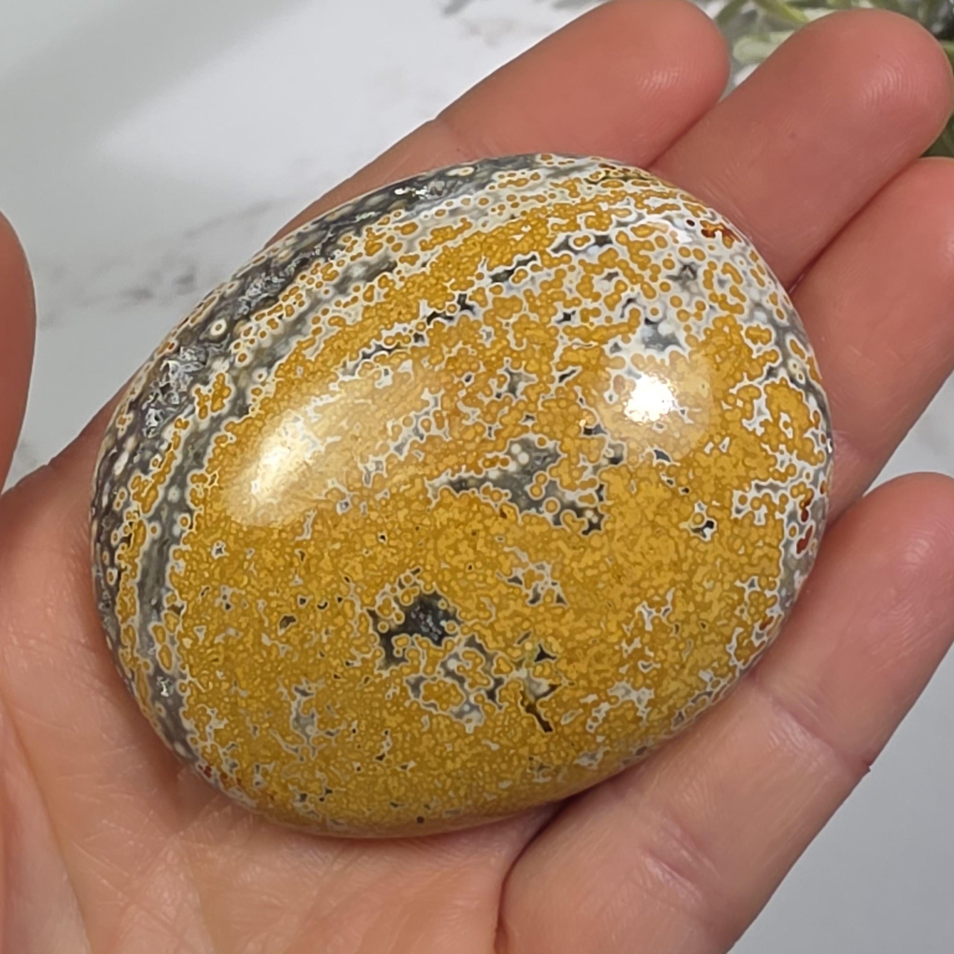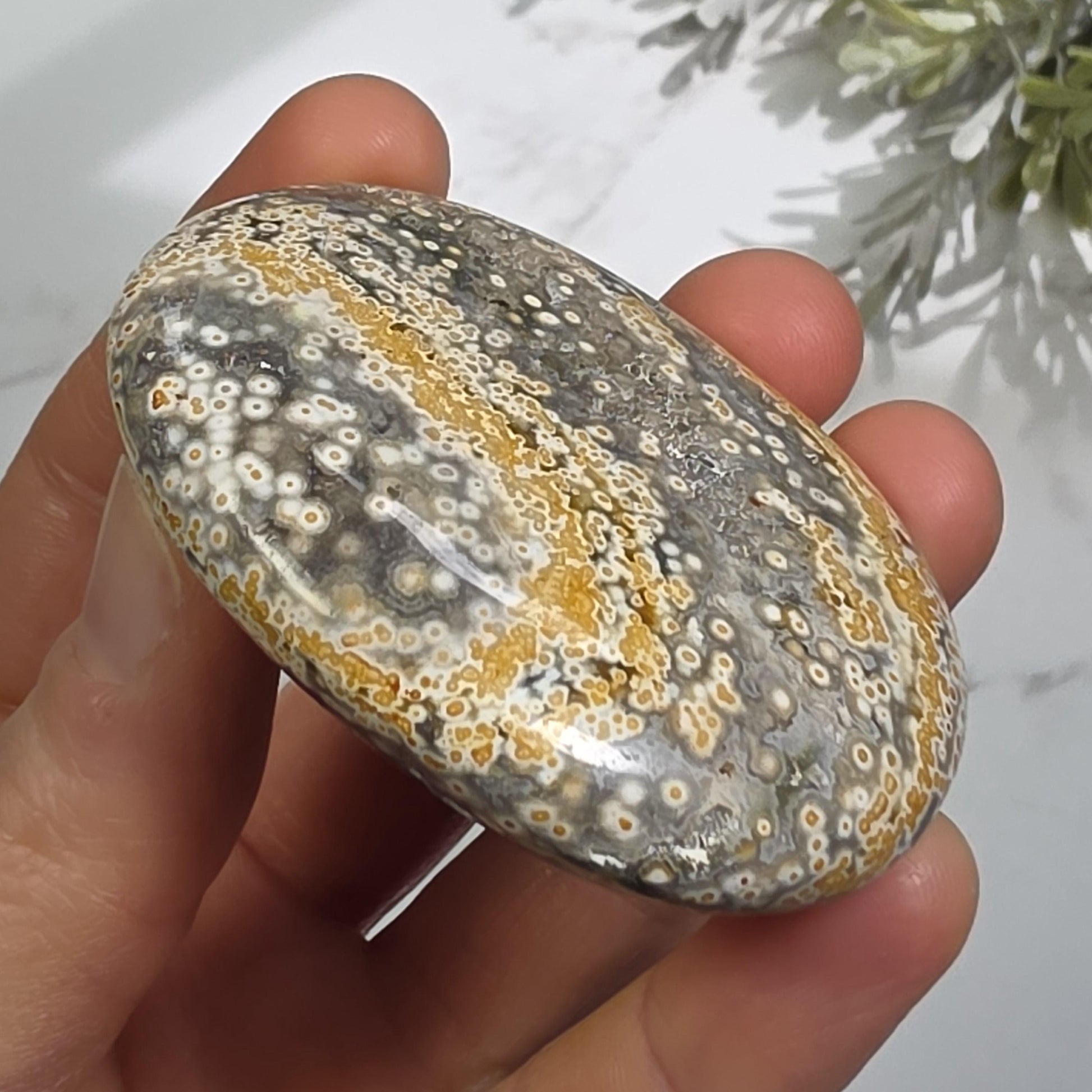 Ocean Jasper are pieces of fossilized coral, you can even see the little circles where the coral used to be! This one-of-a-kind Ocean Jasper palm stone features vibrant grey fields woven with yellow-orange bands — a true specimen of the original Vein 7 deposit, long since depleted and deeply prized by collectors. I have a small supply of OLD STOCK I'm releasing, containing a beautiful array of colors and breathtaking orbicular patterns. This specimen measures approximately 60mm by 48mm in diameter and weighs 77 grams.