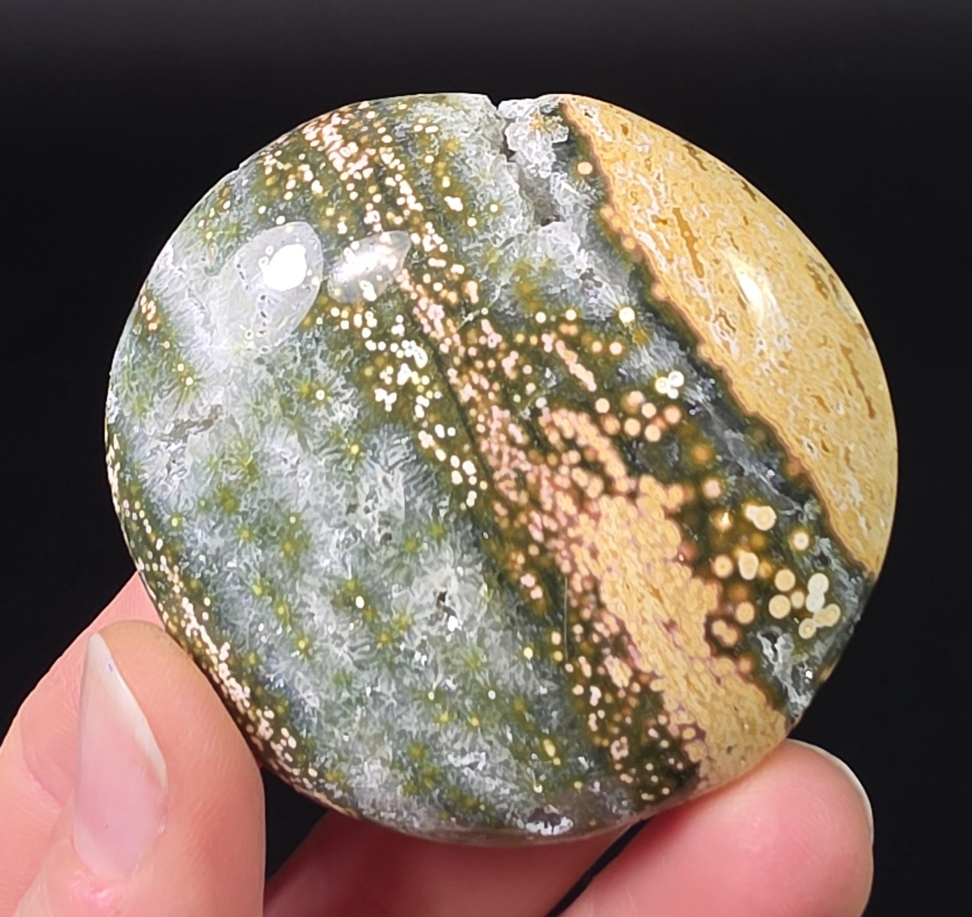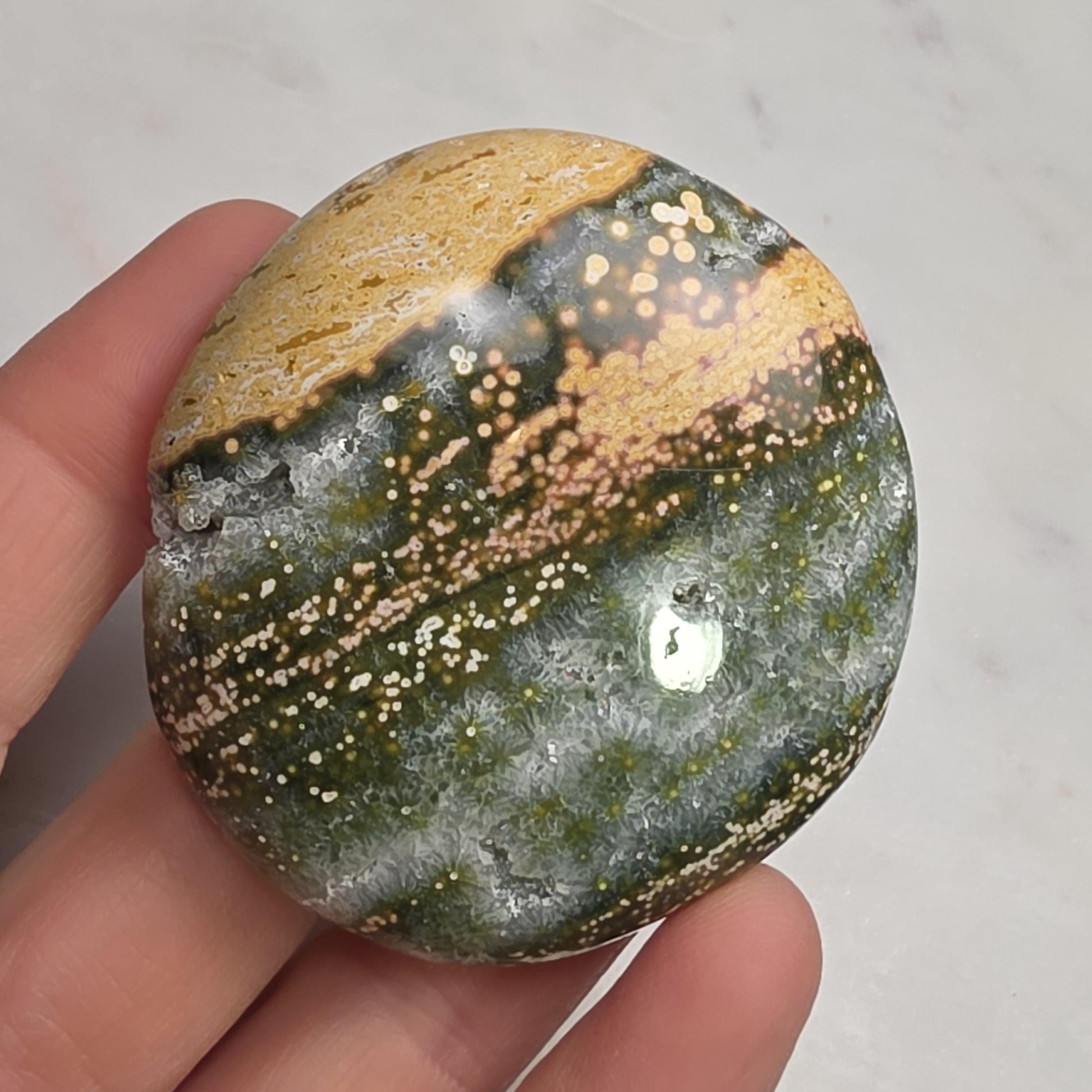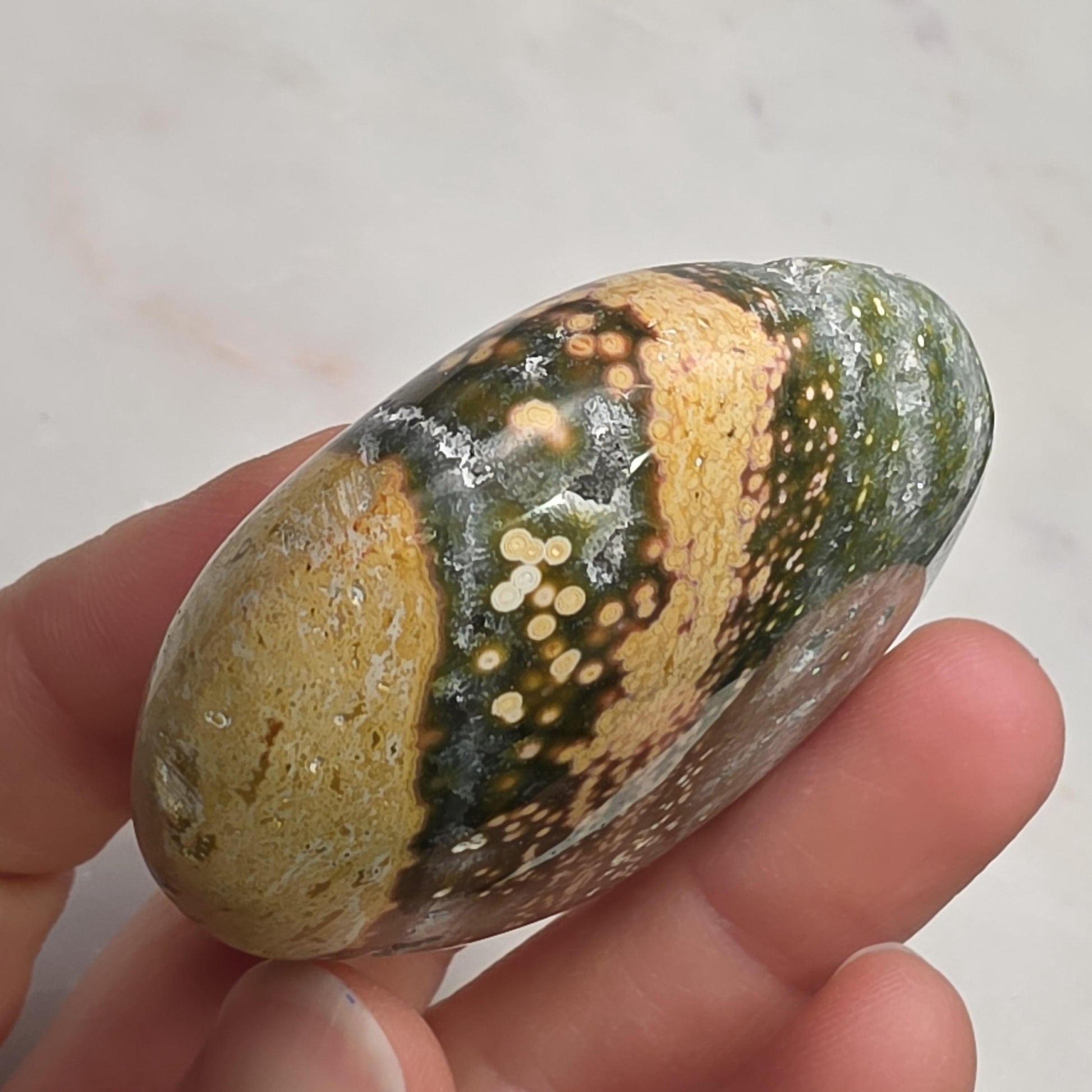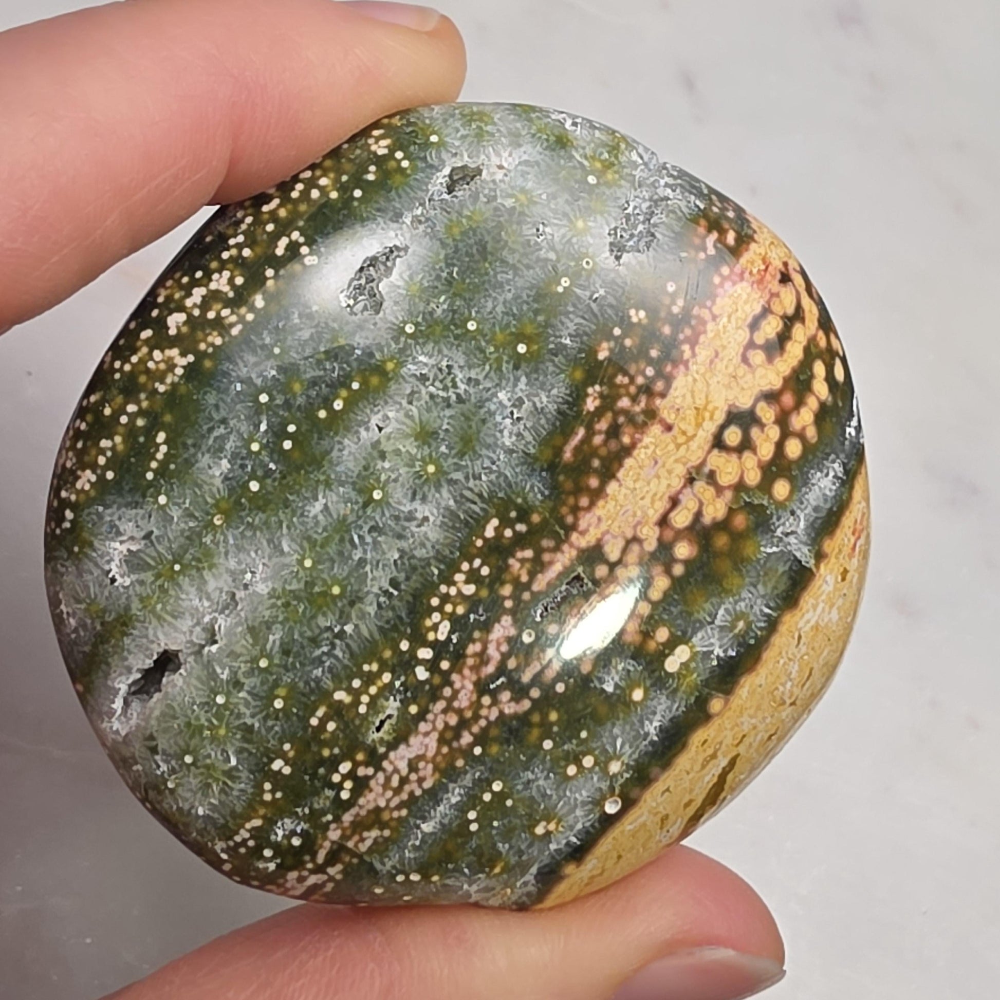 This one-of-a-kind Ocean Jasper palm stone features vibrant green fields woven with yellow-orange bands and rare pink orbs — a true specimen of the original Vein 7 deposit, long since depleted and deeply prized by collectors. I have a small supply of OLD STOCK I'm releasing, containing a beautiful array of colors and breathtaking orbicular patterns. This specimen measures approximately 55 millimeters in diameter and weighs 75 grams.