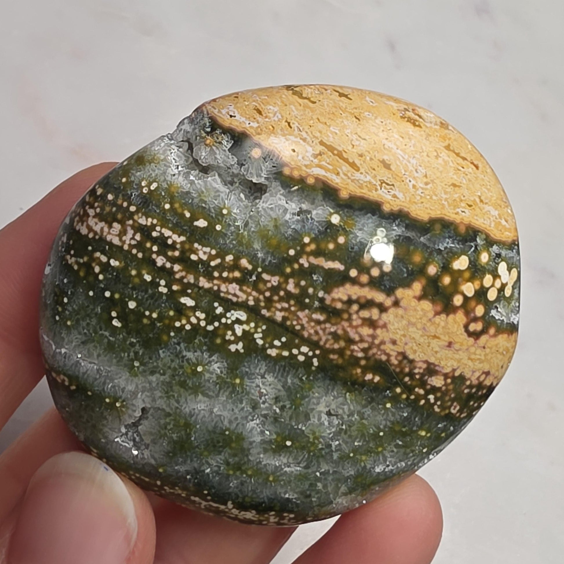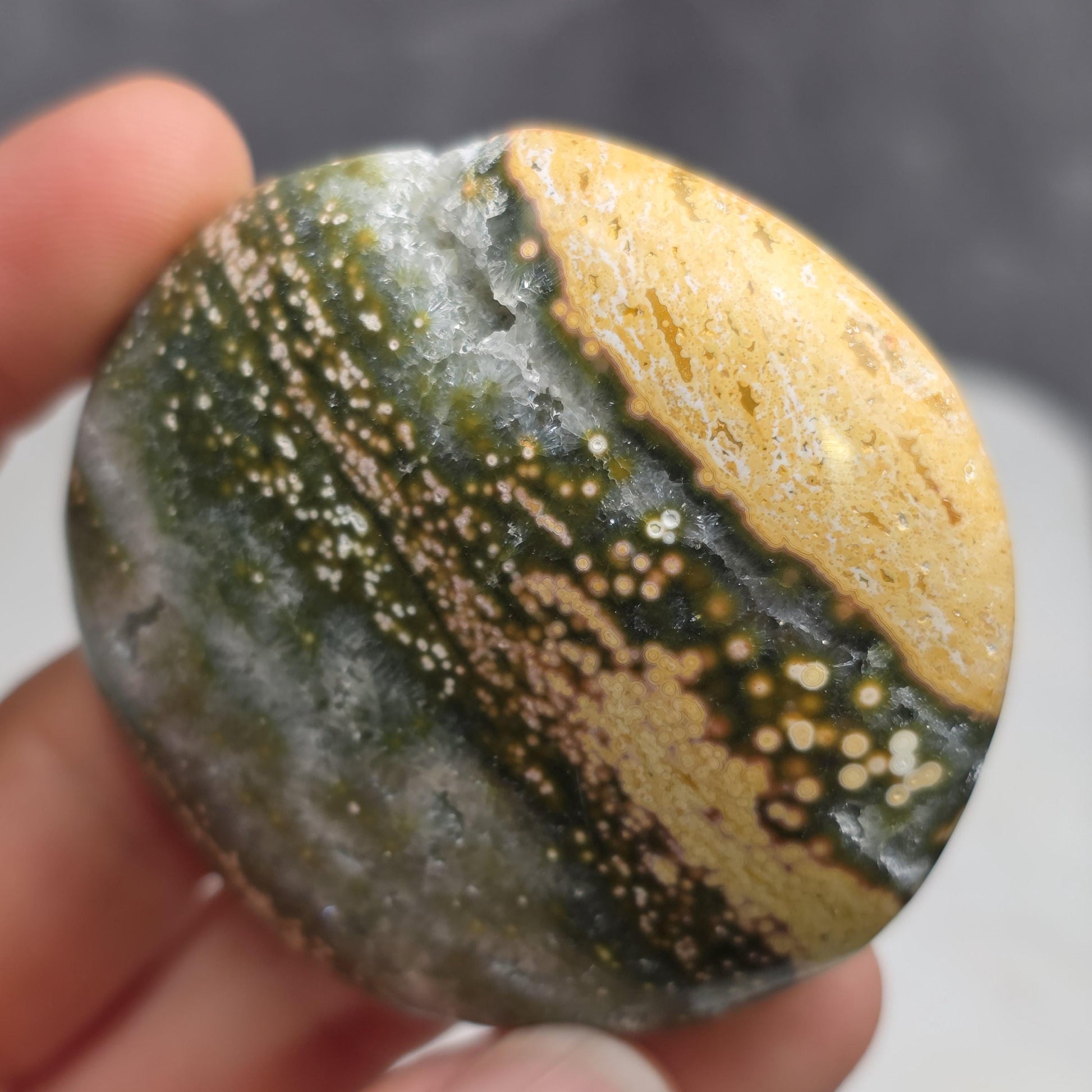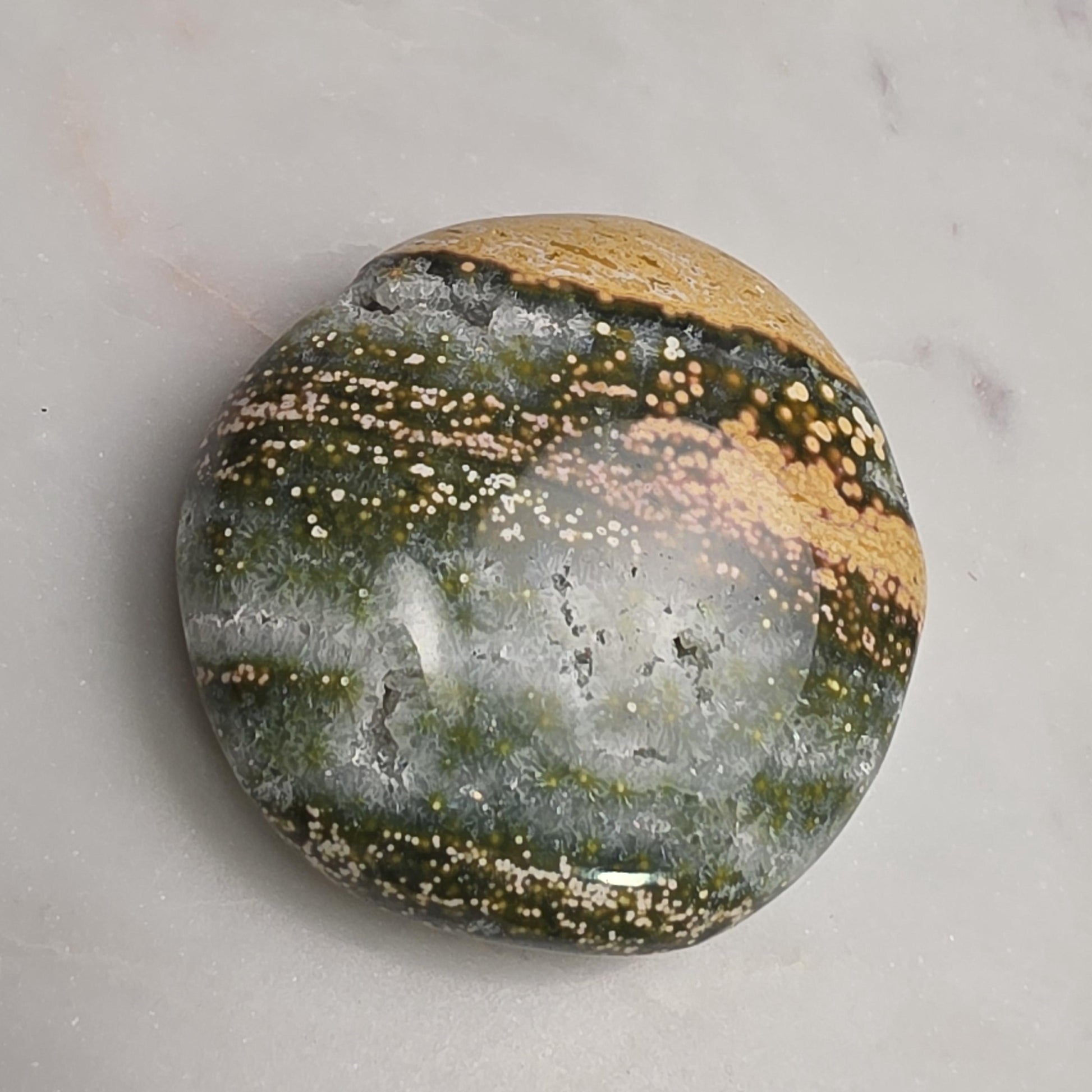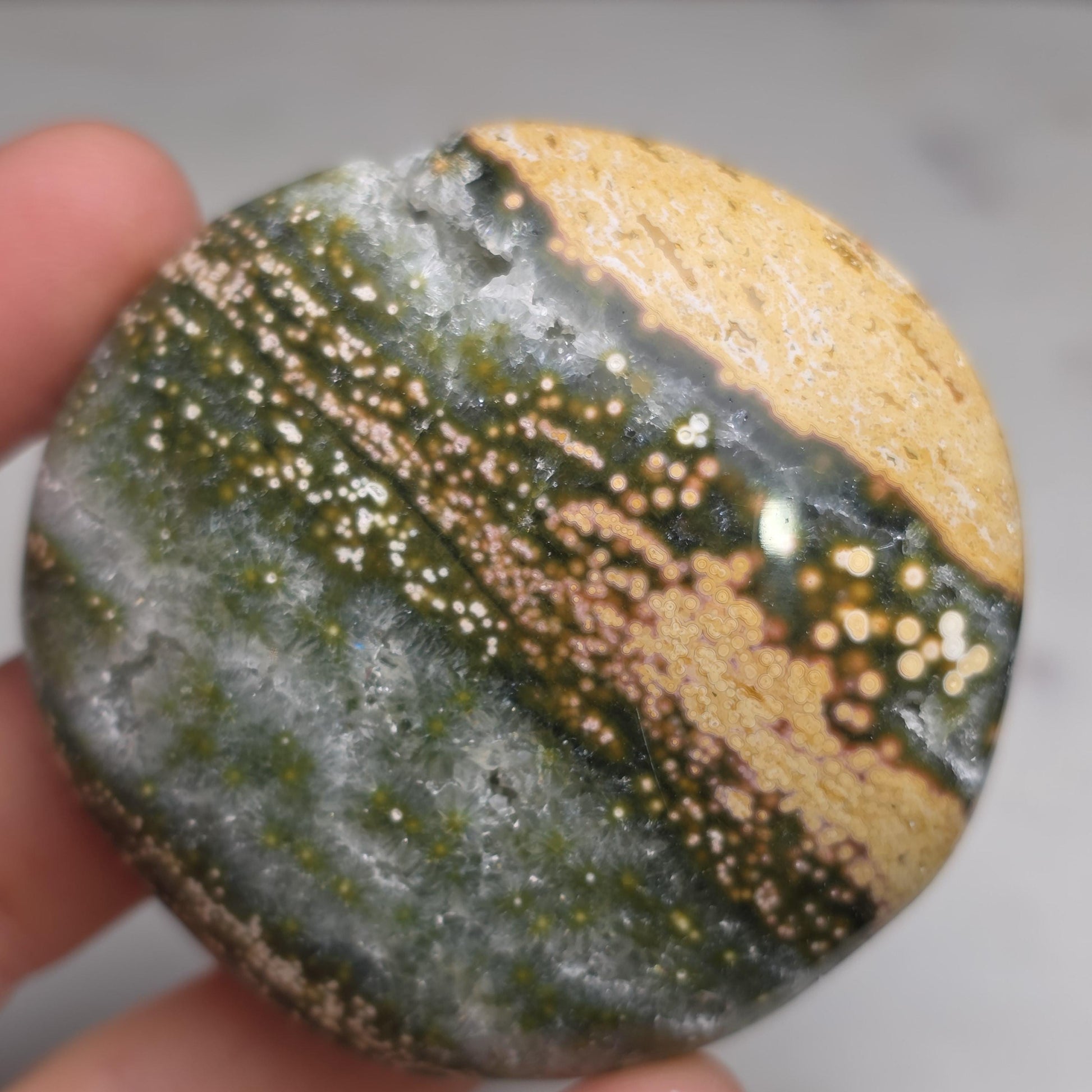 This one-of-a-kind Ocean Jasper palm stone features vibrant green fields woven with yellow-orange bands and rare pink orbs — a true specimen of the original Vein 7 deposit, long since depleted and deeply prized by collectors. I have a small supply of OLD STOCK I'm releasing, containing a beautiful array of colors and breathtaking orbicular patterns. This specimen measures approximately 55 millimeters in diameter and weighs 75 grams.