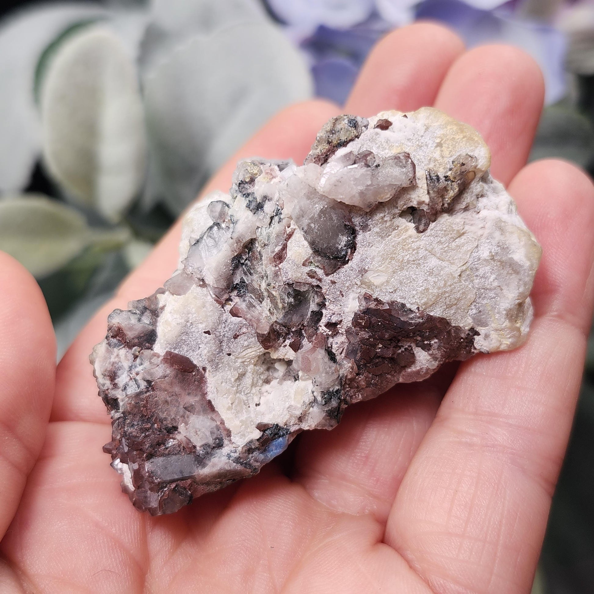 This crystal cluster is comprised of sparkling terminations and contains an array of mineral inclusions, featuring brick-red coloring and striking Papagoite blue speckles. It has a sliced side, allowing it to sit upright - a perfect display piece - and helping to showcases these rare, vivid blue inclusions. This specimen measures 54mm by 34mm by 30mm and weighs 52 grams.