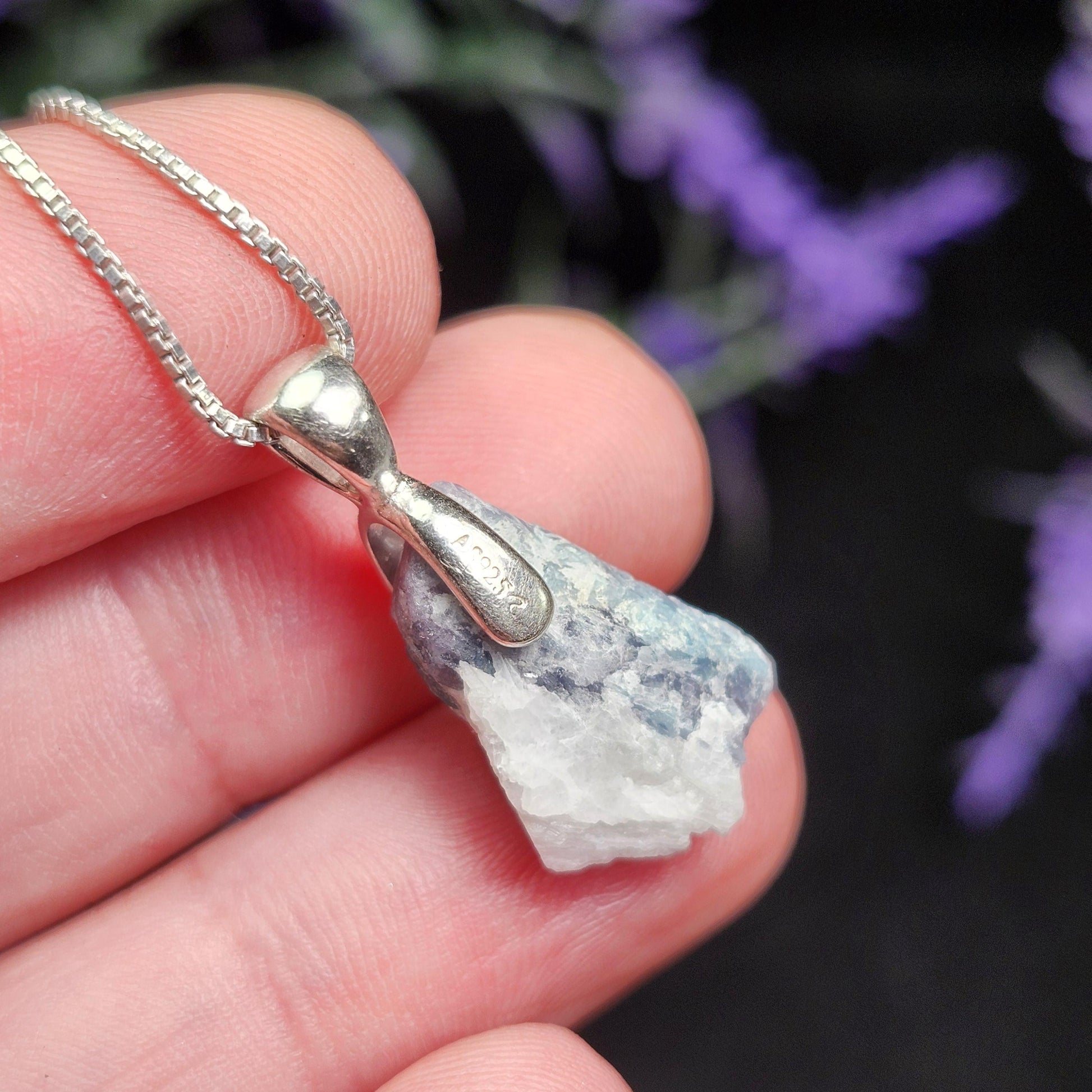 This Tourmaline crystal from the Paraíba region in Brazil displays mauve and blue coloring and exhibits shining striations. This crystal has been custom created into a sturdy piece of jewelry using .925 Sterling Silver. This pendant measures approximately 24mm by 12mm. The silver chain used in the photos is to help envision how this pendant will look while adorned but is not included in the listing.
