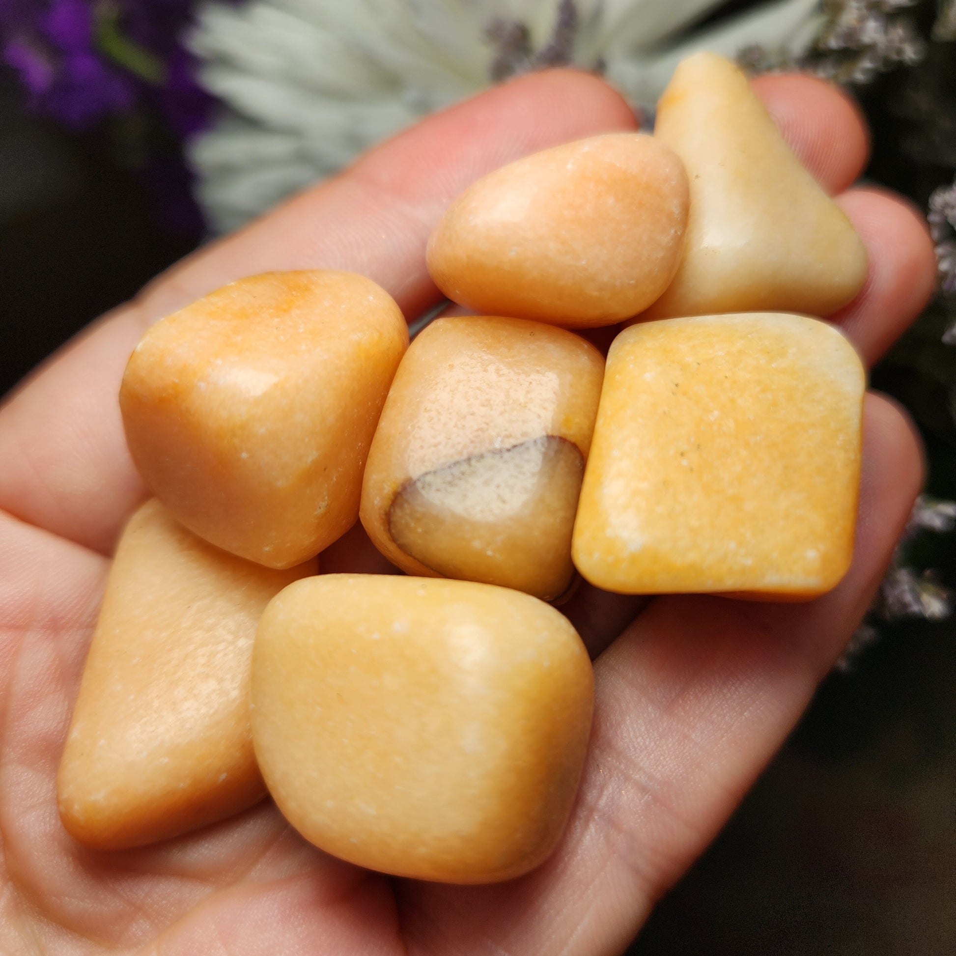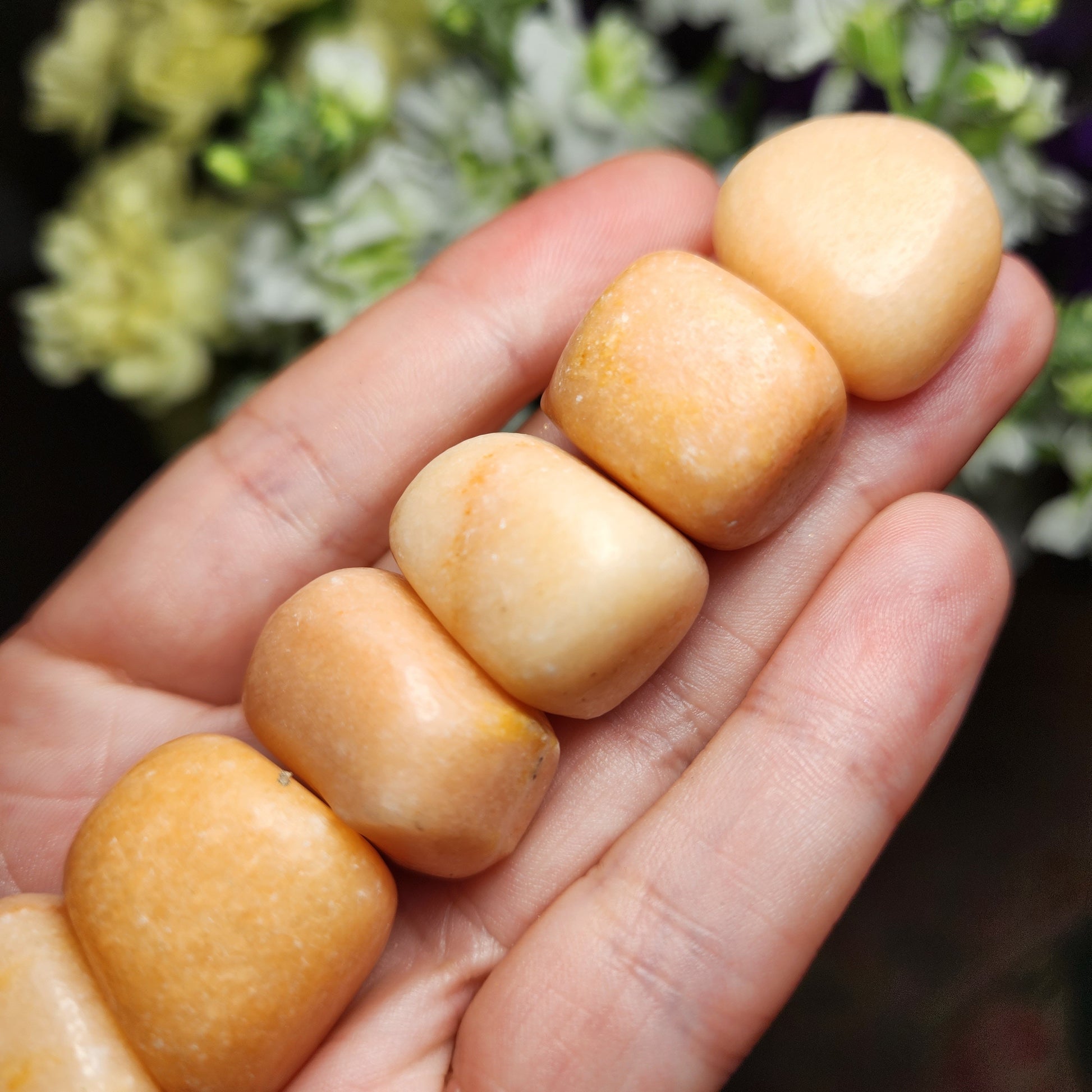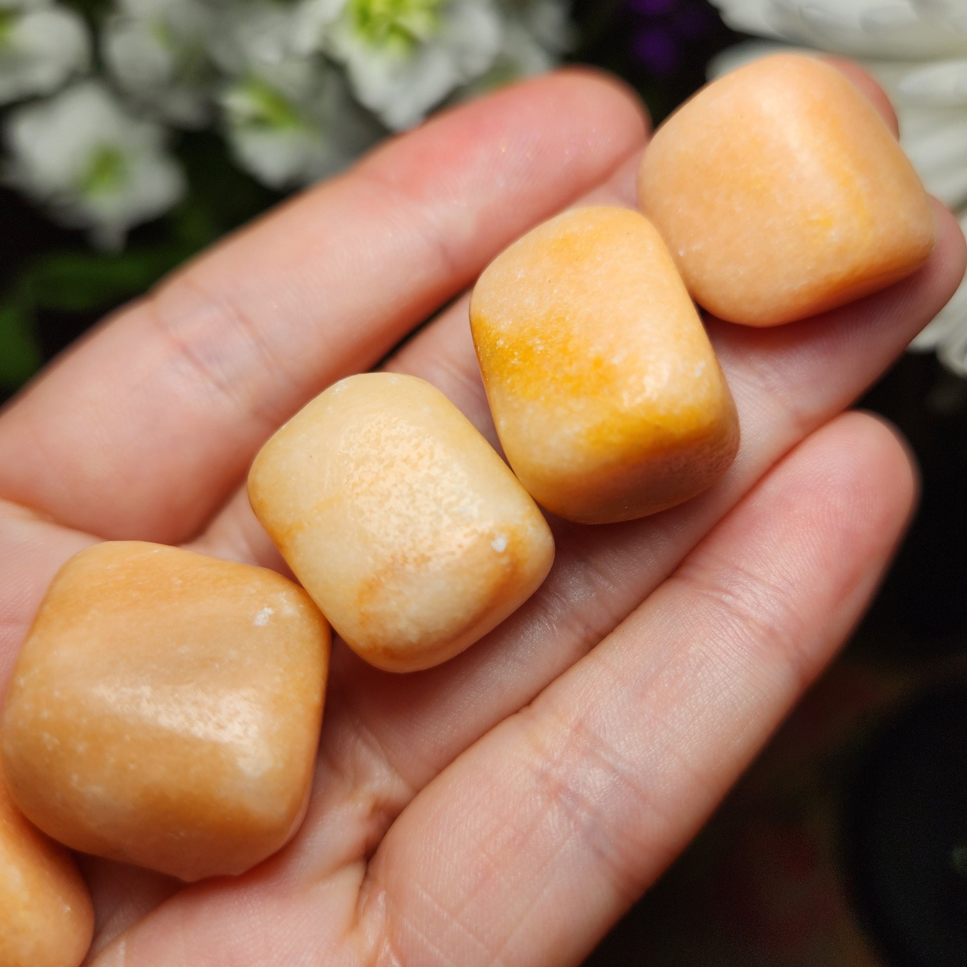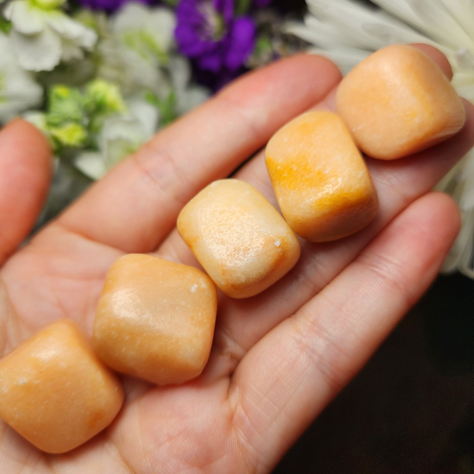 These Peach Calcite crystals have been tumbled to a high polish and exhibit a creamy peach coloring. Each specimen measures approximately 20mm and up.