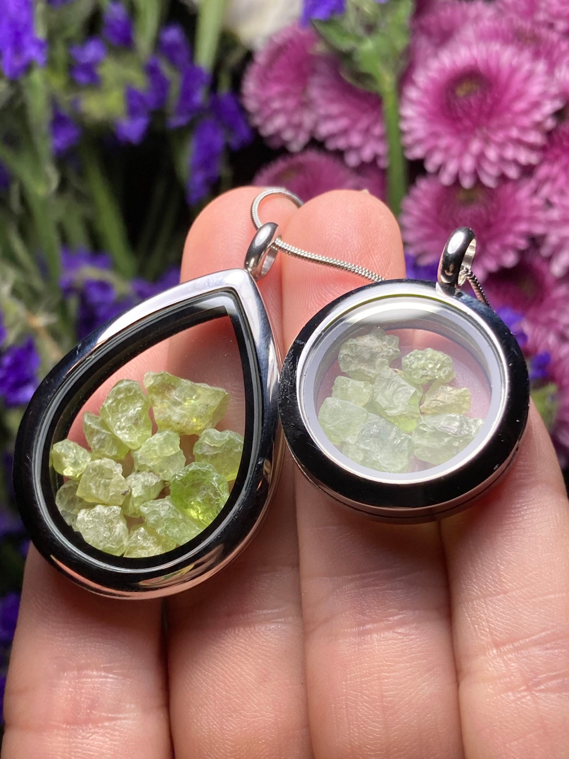 The TEARDROP option will contain a locket pendant that measures approximately 49mm by 38mm and holds raw, peridot crystals.
