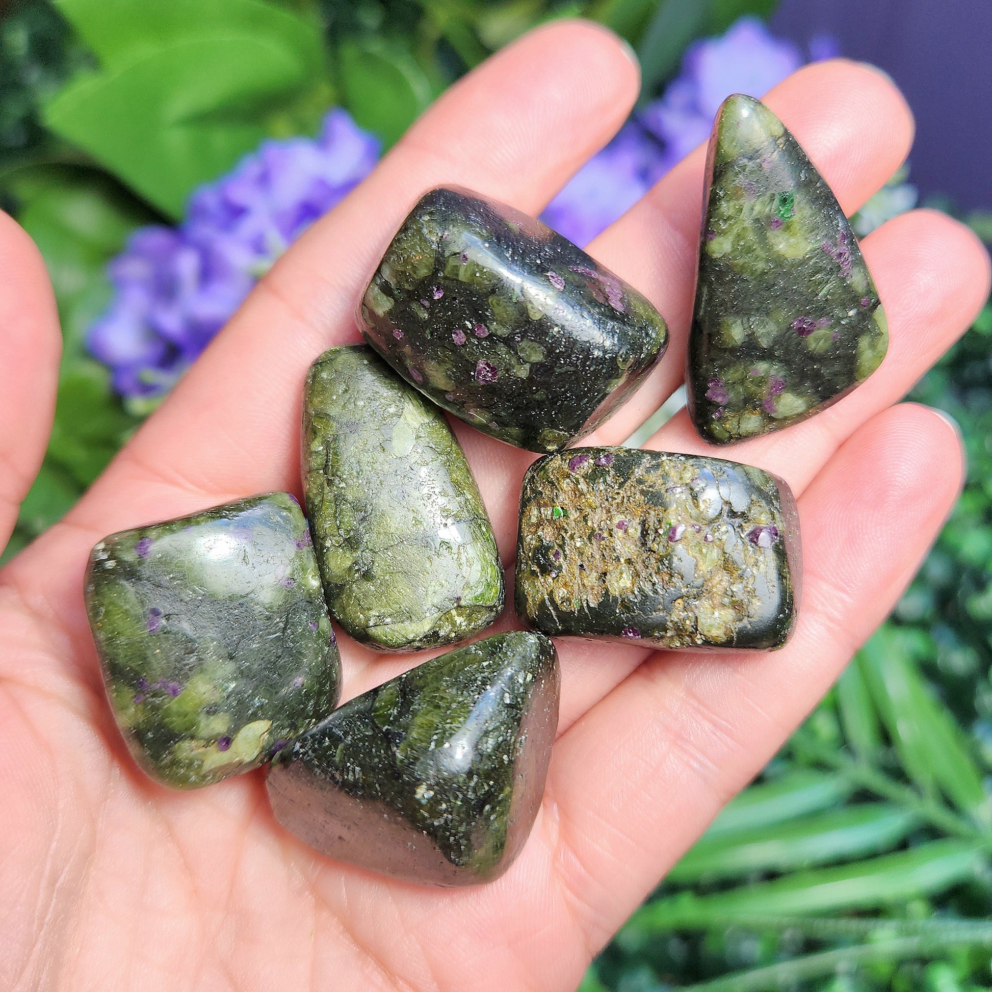 These Peridotite stones have been tumbled to a light polish. They exhibit Earthy green tones marbled with dark grey. These unique specimens are from South Africa and have a distinct denseness to them.
