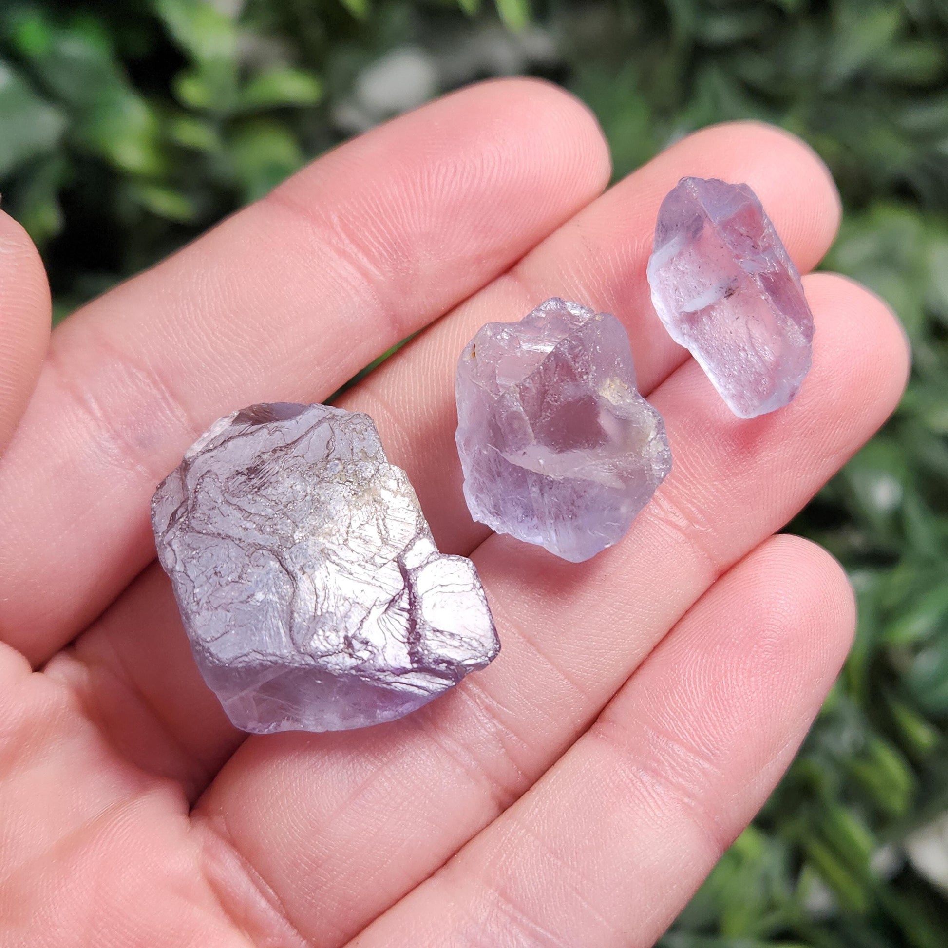 These raw Fluorite crystals from the Balochistan region exhibit translucence with a range of icy blue, periwinkle, and purple color tones.