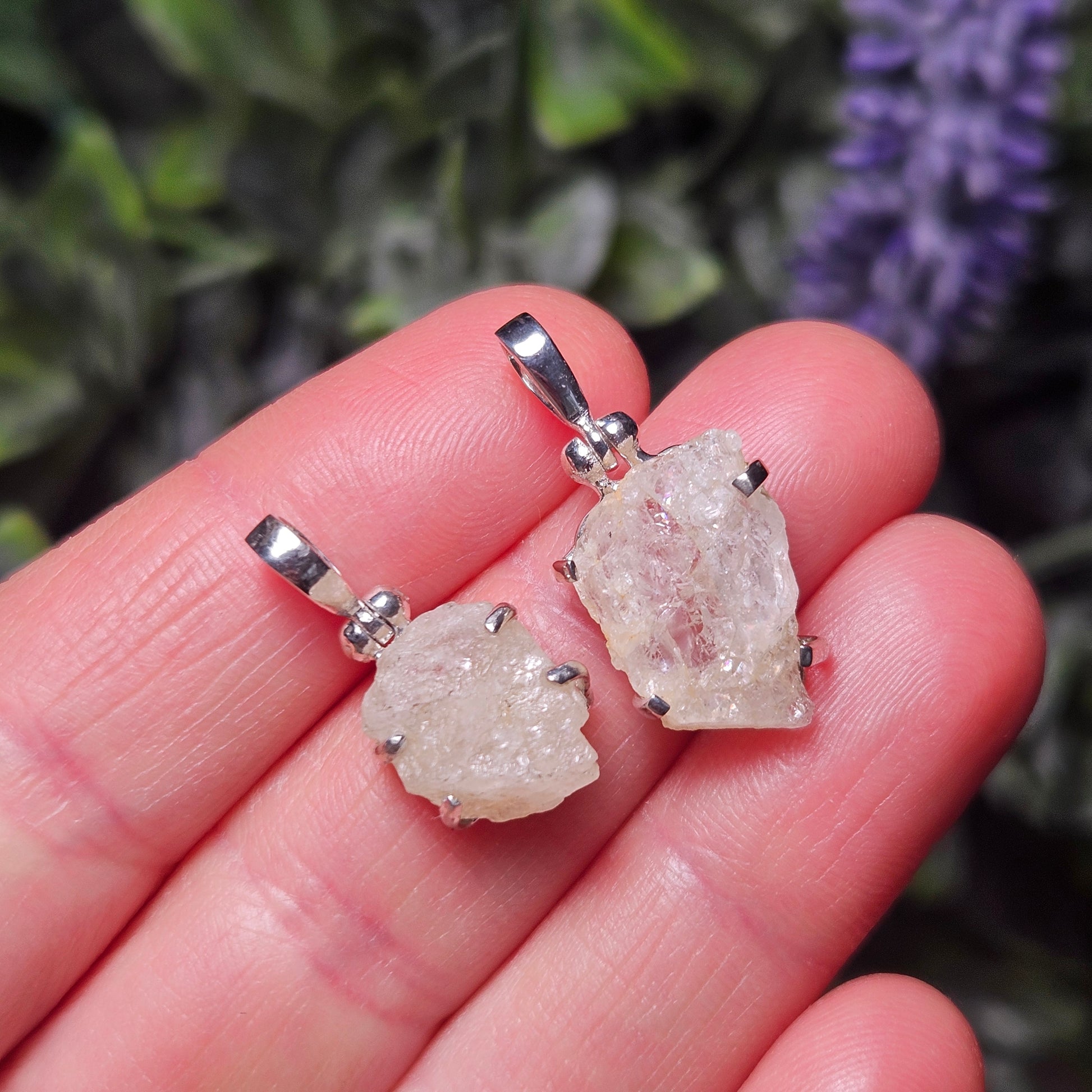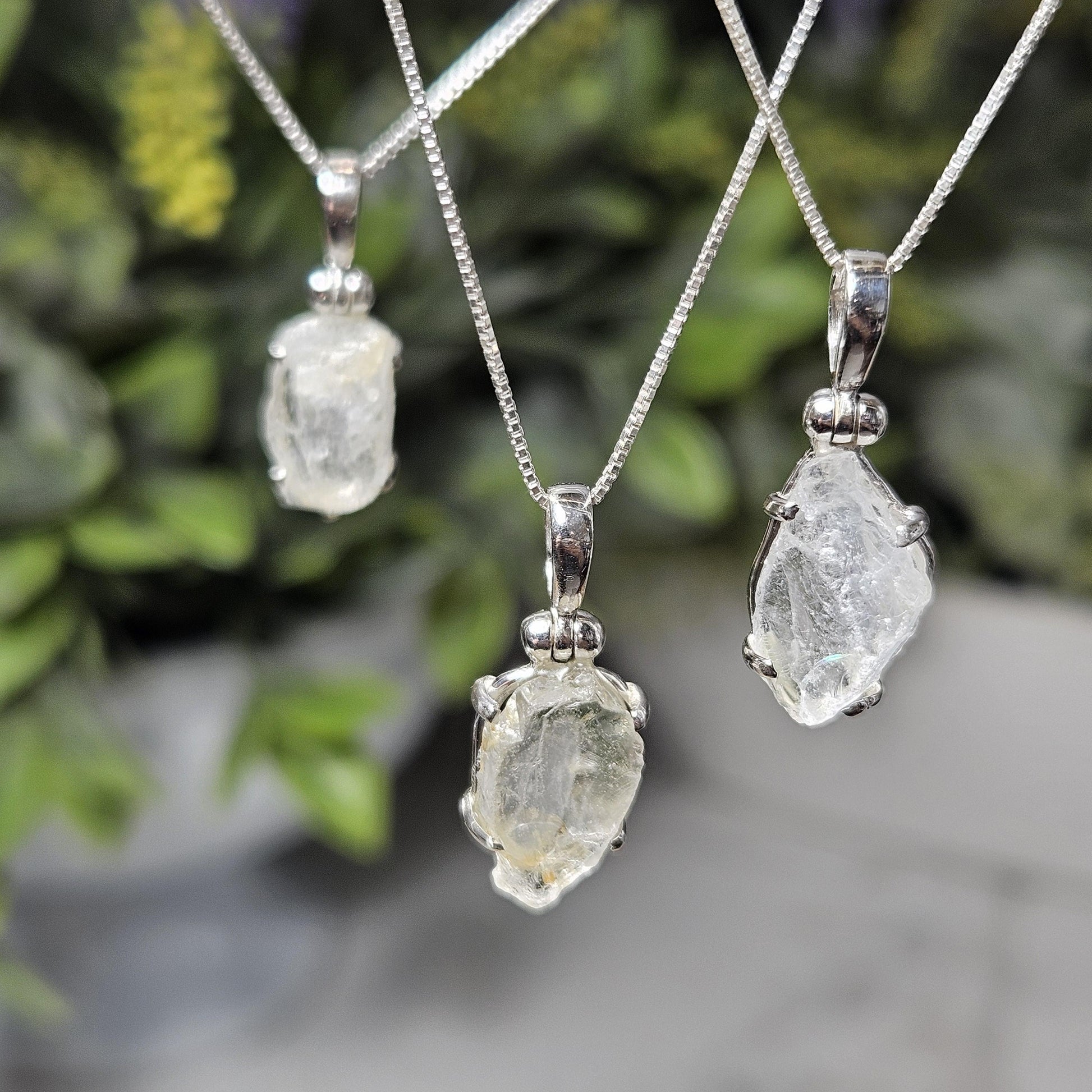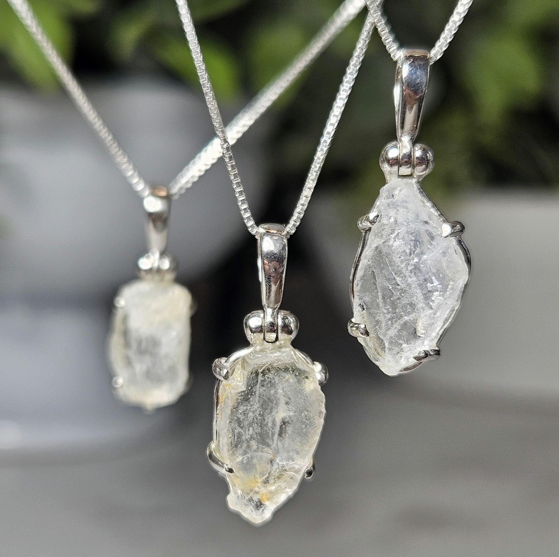 These Nigerian Phenacite crystals are raw and have a deep translucent glow. They exhibit a white silver tone with hints of gold or milky depths. Each crystal has been handpicked and processed into an intentional piece of jewelry using .925 Sterling Silver with an elegant artisan hinged bail. Each pendant measures approximately 20mm to 25 millimeters in height - these measurements are meant to give a general idea of size; the actual dimensions of the pendant you receive may vary slightly. The silver chain used in the photos is to help envision how this pendant will look while adorned but is not included in the listing.