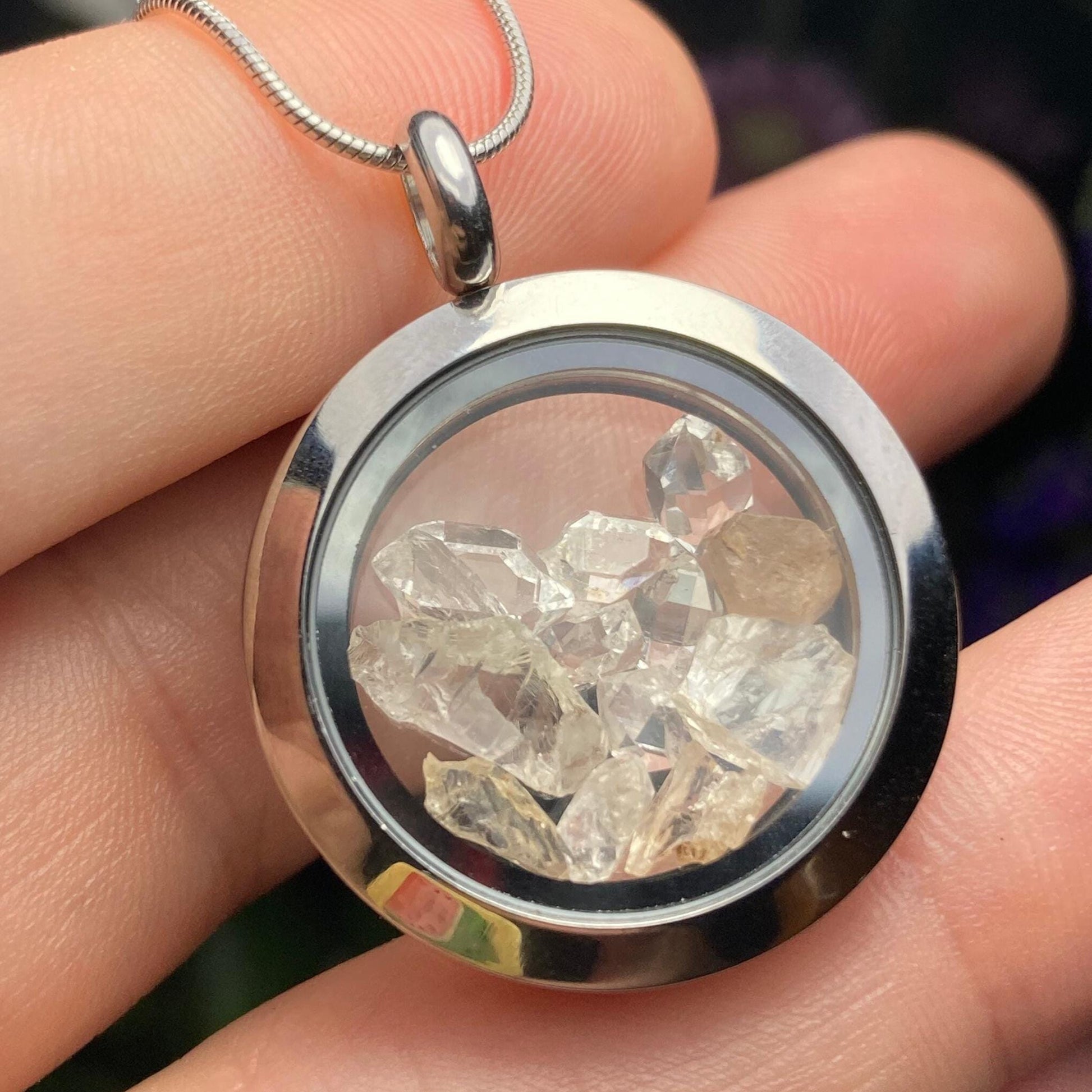 These raw Burmese Phenacite crystals, with a range of transparency and color, are perfectly complimented by these sparkling Herkimer Diamond crystals. These gemstones are gently nestled inside of a high-quality, stainless-steel locket. These lockets are assembled with two pieces that connect with a threaded screw attachment. We recommend securing the attachments with a dab of epoxy for a more permanent option. The silver chain used in the photos is to help envision how this pendant will look while adorned but is not included in the listing - feel free to leave a note for us to include a complimentary cord!