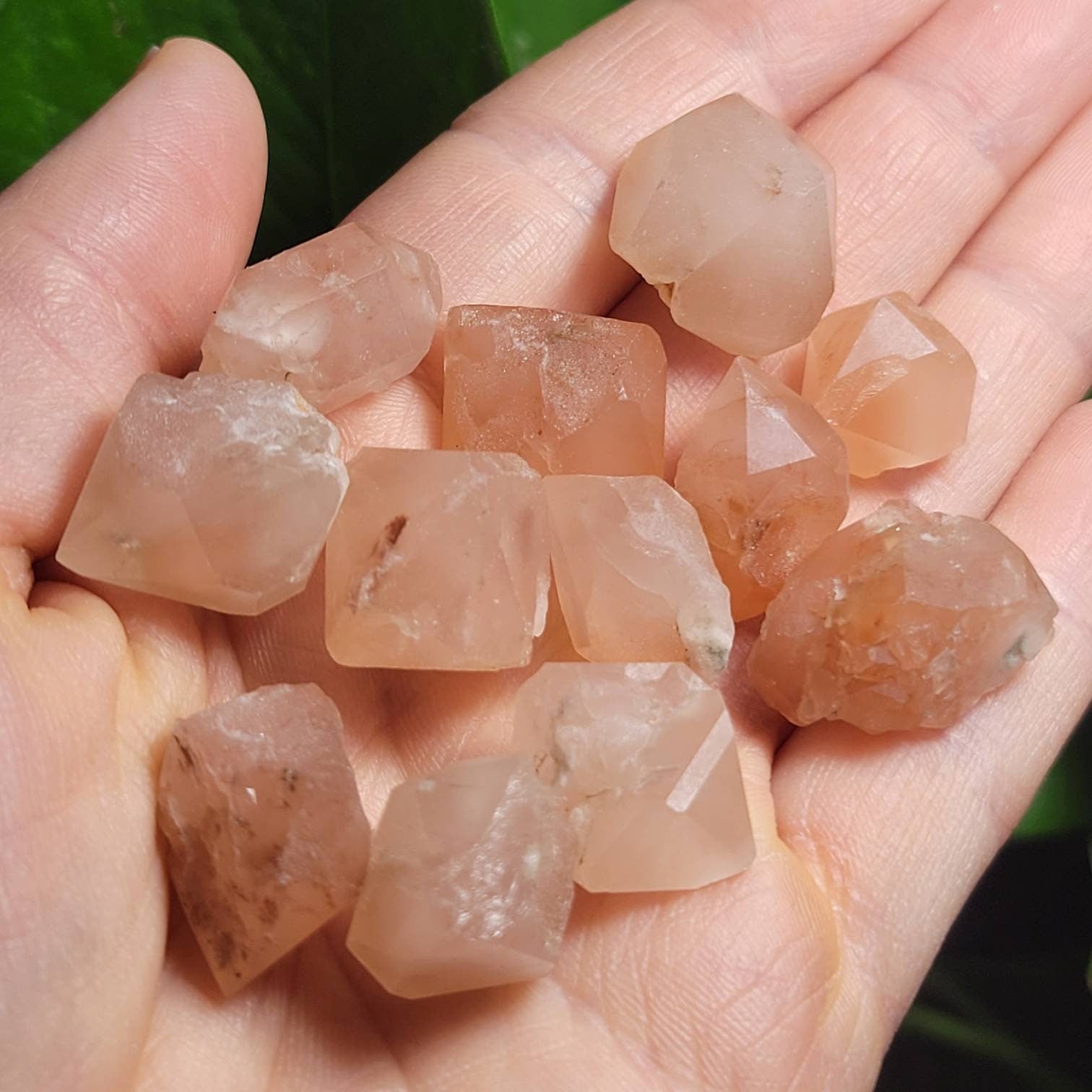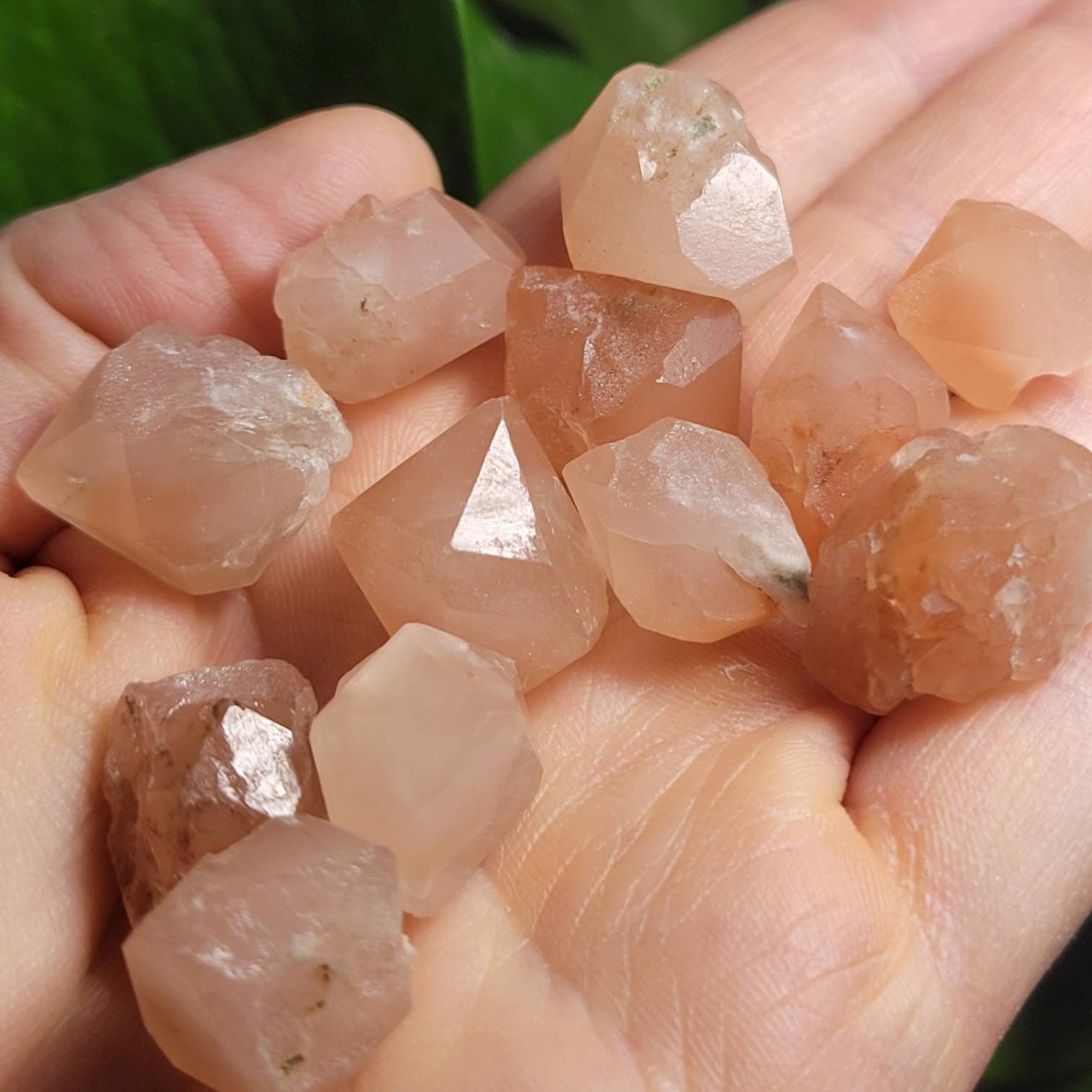 These pink Beta Quartz crystals are a recent find and are raw with distinct natural terminations. There is a wonderful natural variety in the structure of these unique crystals, with included keyhole and manifestation inclusions. They have a peachy-rosy tone and a deep translucence.