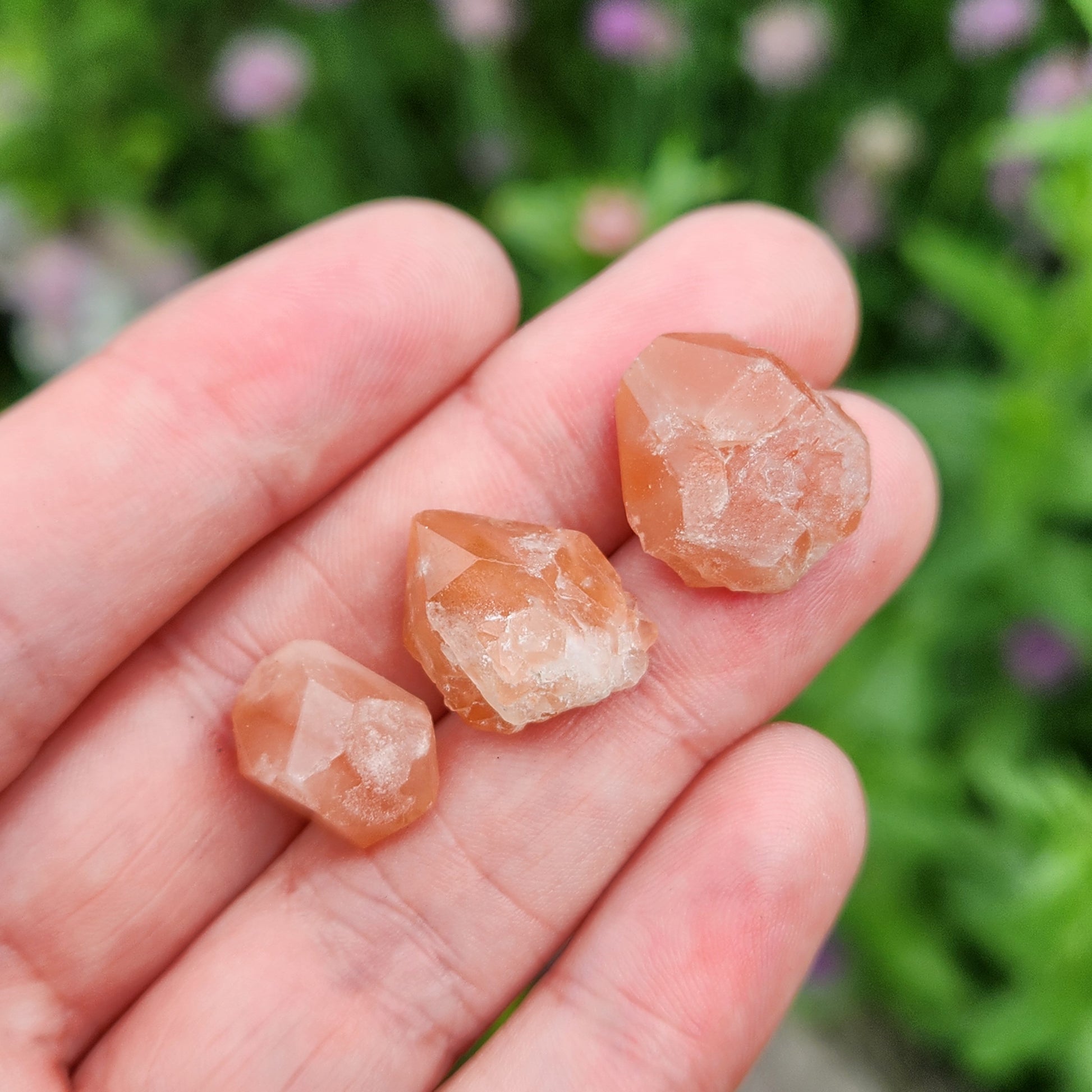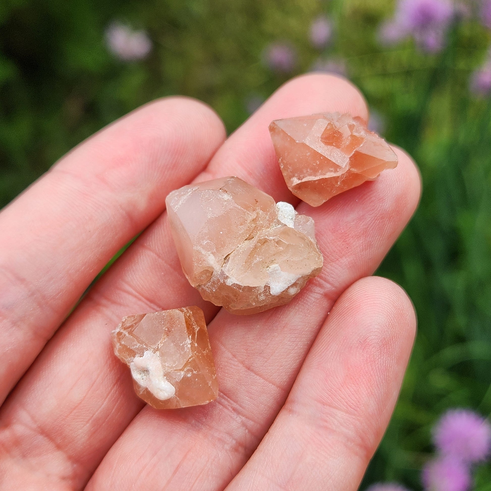 These pink Beta Quartz crystals clusters exhibit partial terminations that shine. There is a wonderful, natural variety in the structure of these unique crystals, with included keyhole and manifestation inclusions. They have a peachy-rosy tone and a deep translucence.